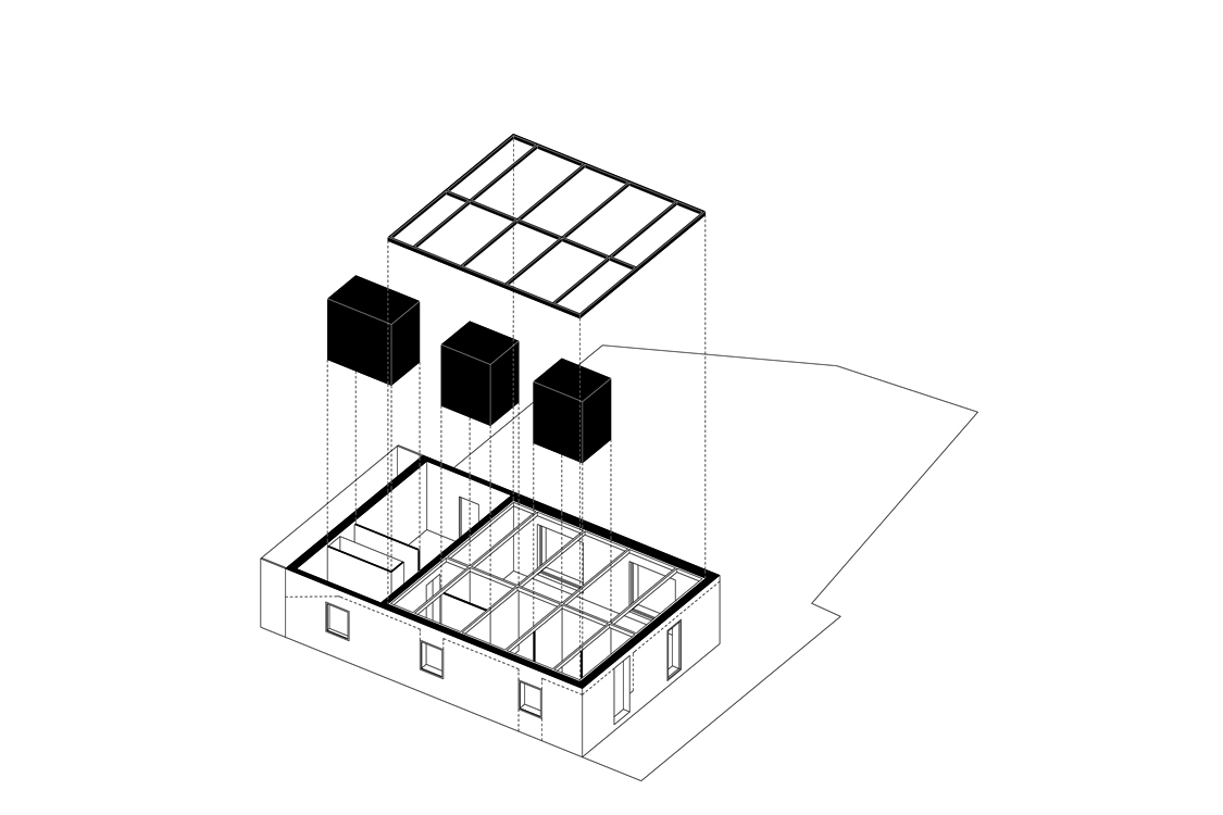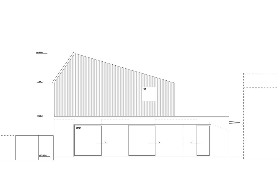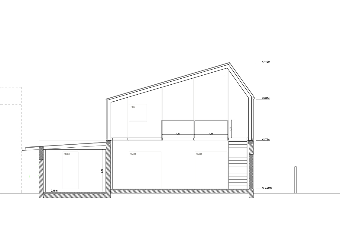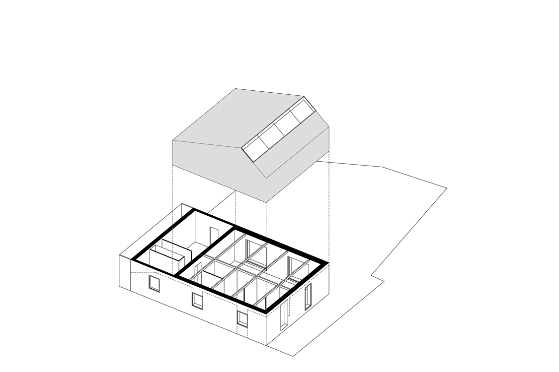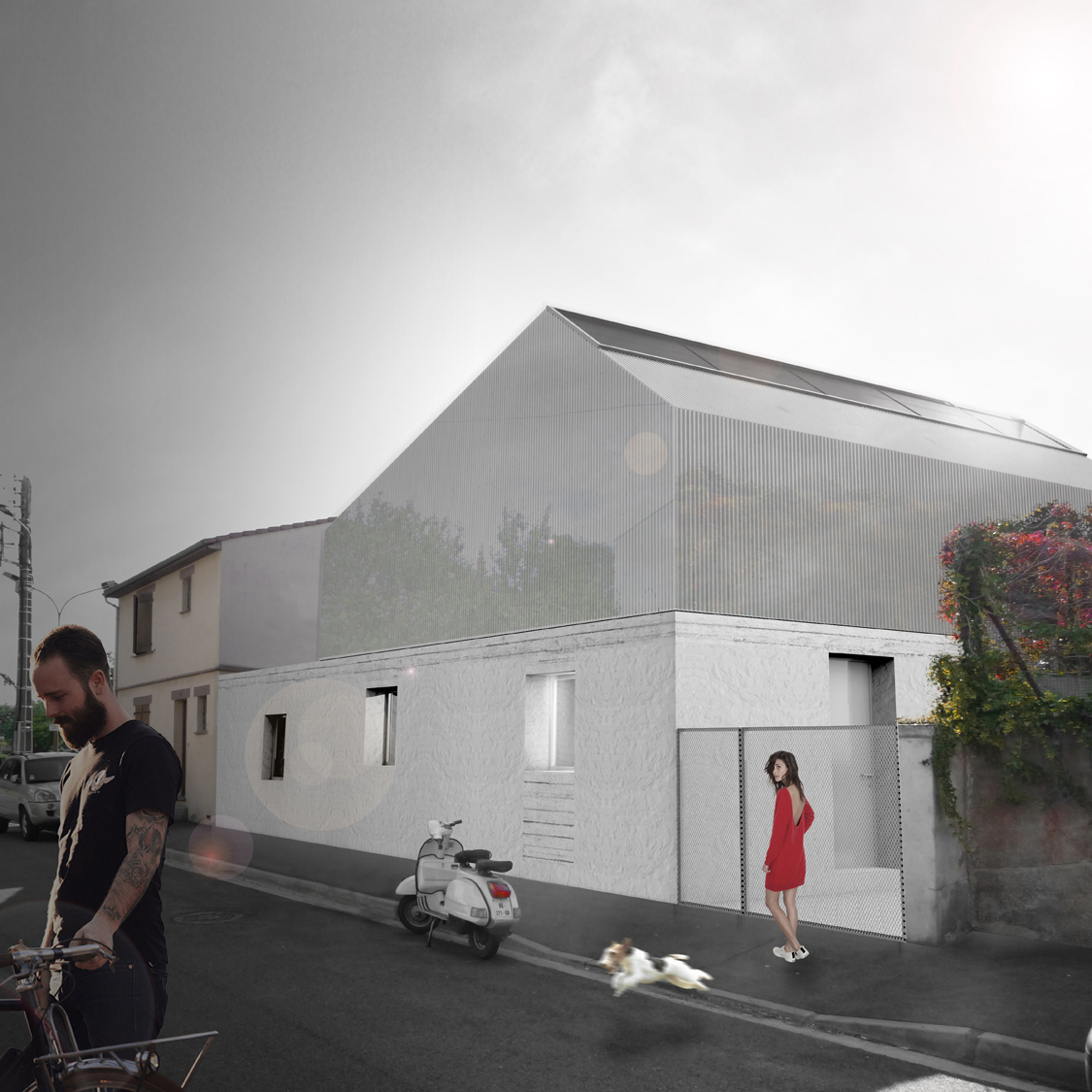 Ainsi arasée, la construction existante devient socle, et peut supporter une nouvelle construction. La seconde phase du projet consiste à implanter une construction neuve sur ce socle existant. Cette construction est alignée sur la rue, dans le prolongement du socle existant. Réalisée entièrement en ossature légère métallique, en contraste avec le socle maçonné existant, autant pour la structure en profilés acier que pour le bardage en aluminium naturel, la nouvelle construction privilégie les matériaux bruts dans une recherche d’abstraction et de lissage du volume dans ce paysage de faubourgs. Sans chercher à imiter, cette construction réinterprète les pignons sur rue caractéristiques de la rue de la Briqueterie, de façon dissymétrique afin de profiter de la lumière du Nord avec une. Inscrit dans l’histoire de cette rue, cet ensemble socle maçonné existant + construction neuve métallique fait évoluer ces typologies d’habitat vers les problématiques actuelles de renouvellement urbain et d’adaptation du bâti ancien aux nouveaux modes «d’habiter».