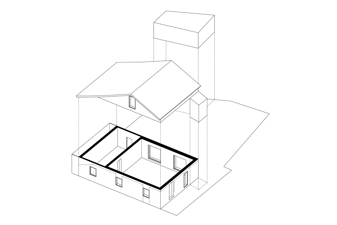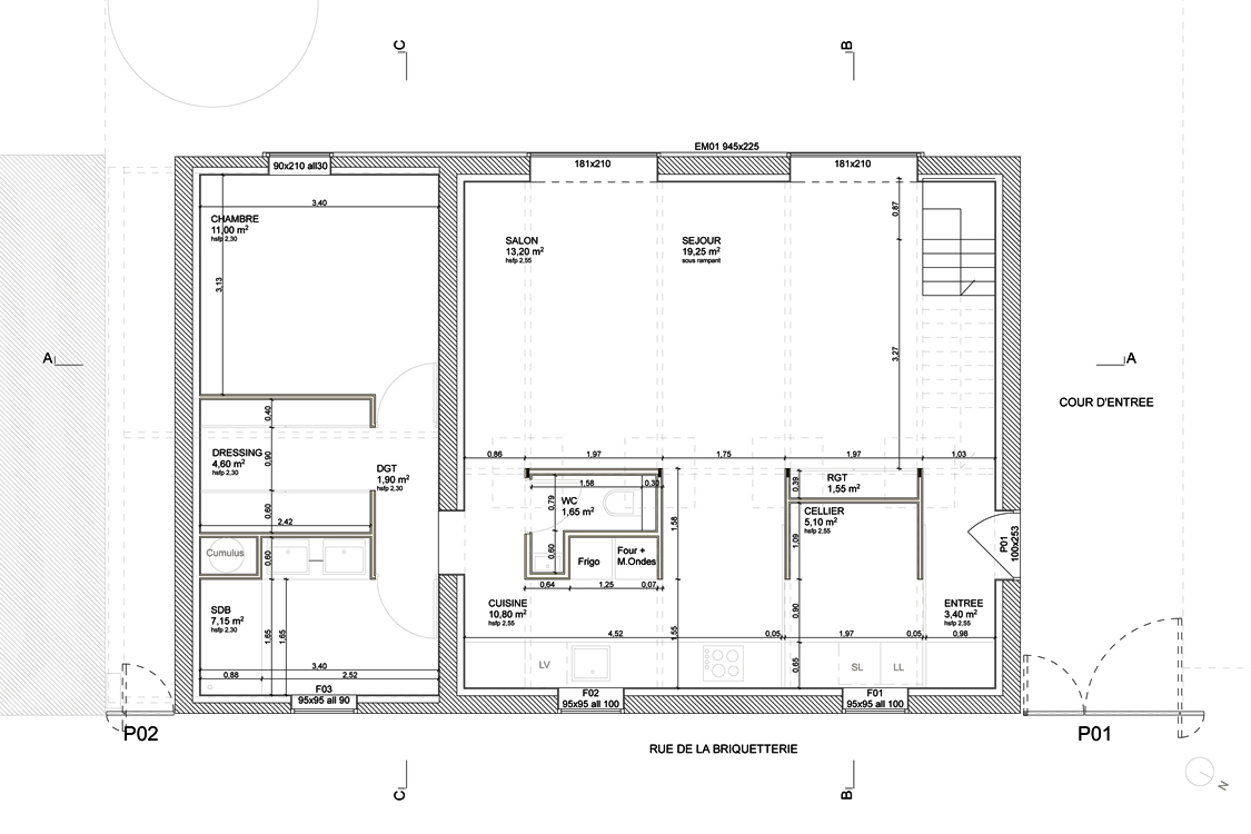 Comme dans des anciens faubourgs de Toulouse, la rue de la Briqueterie est caractérisée par une succession de maisons à pignon sur rue, aux finitions, matières et couleurs variées (enduits et badigeons, briques apparentes, peinture de façade). Le terrain se compose de la maison d’origine sur plan carrée alignée sur la rue, de son extension au Sud dans l’alignement de la rue. La première phase du projet consiste à arasée la maison existante à 3m pour ne conserver que les murs sains. Une ceinture en béton en partie haute vient consolider la maçonnerie conservée. Côté jardin, un décaissé est réalisé au-devant de la façade permettant de dégager une terrasse de plein pieds dans le prolongement de l’intérieur. Pour soutenir les terres suite à ce terrassement, deux murs de soutènement maçonné mettent en valeur la topographie du jardin. Sur les façades de la maison, les emplacements des ouvertures sont conservés, seules leurs dimensions varient. L’enduit existant vétuste est piqué pour redonner la lecture de la maçonnerie de brique et de galets de Garonne qui recevra un badigeon à la chaux, protégeant les murs mais révélant leurs textures.