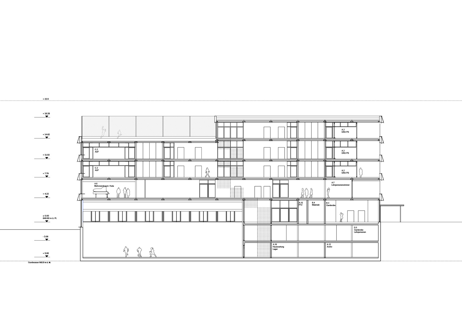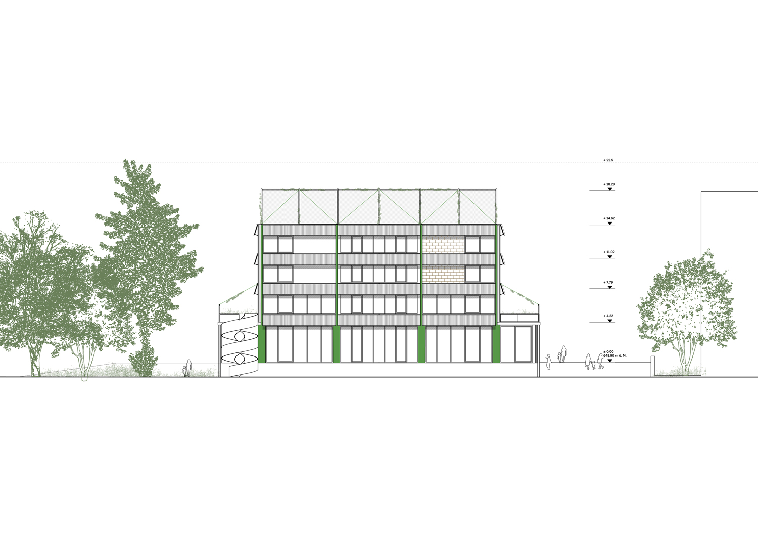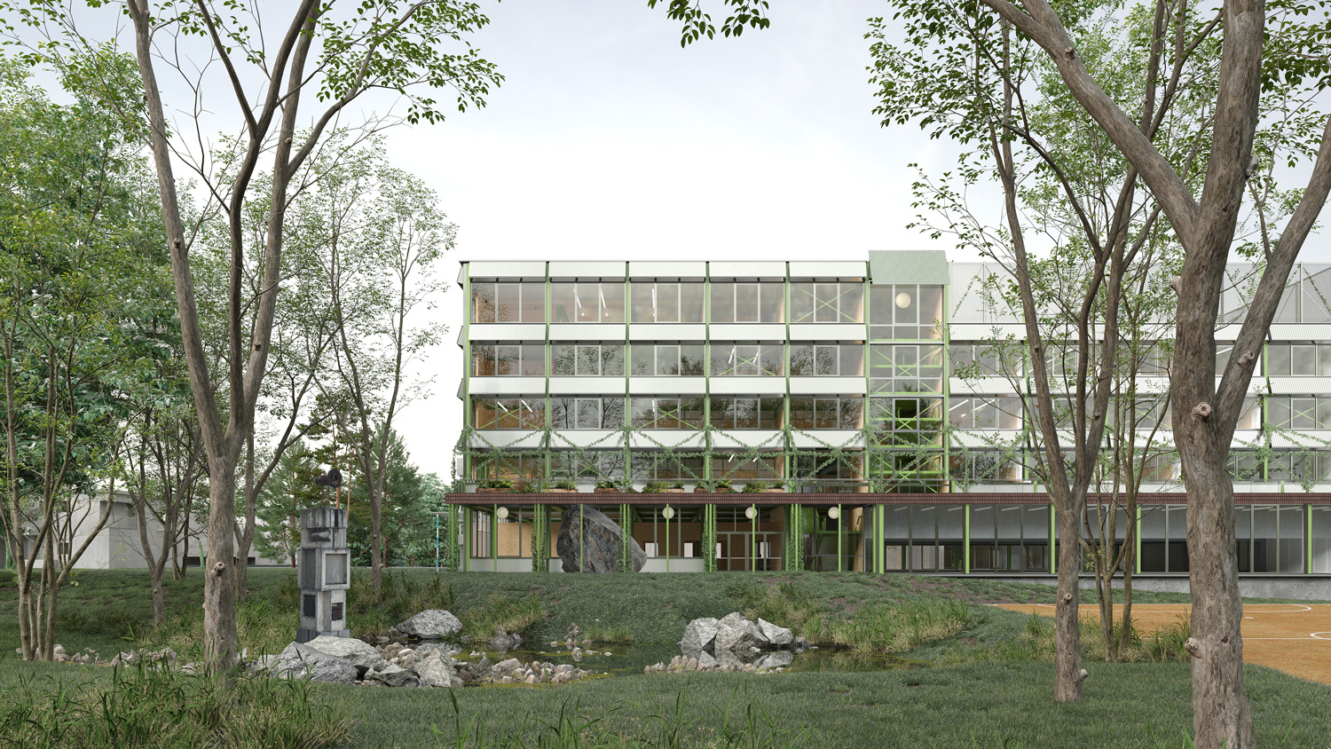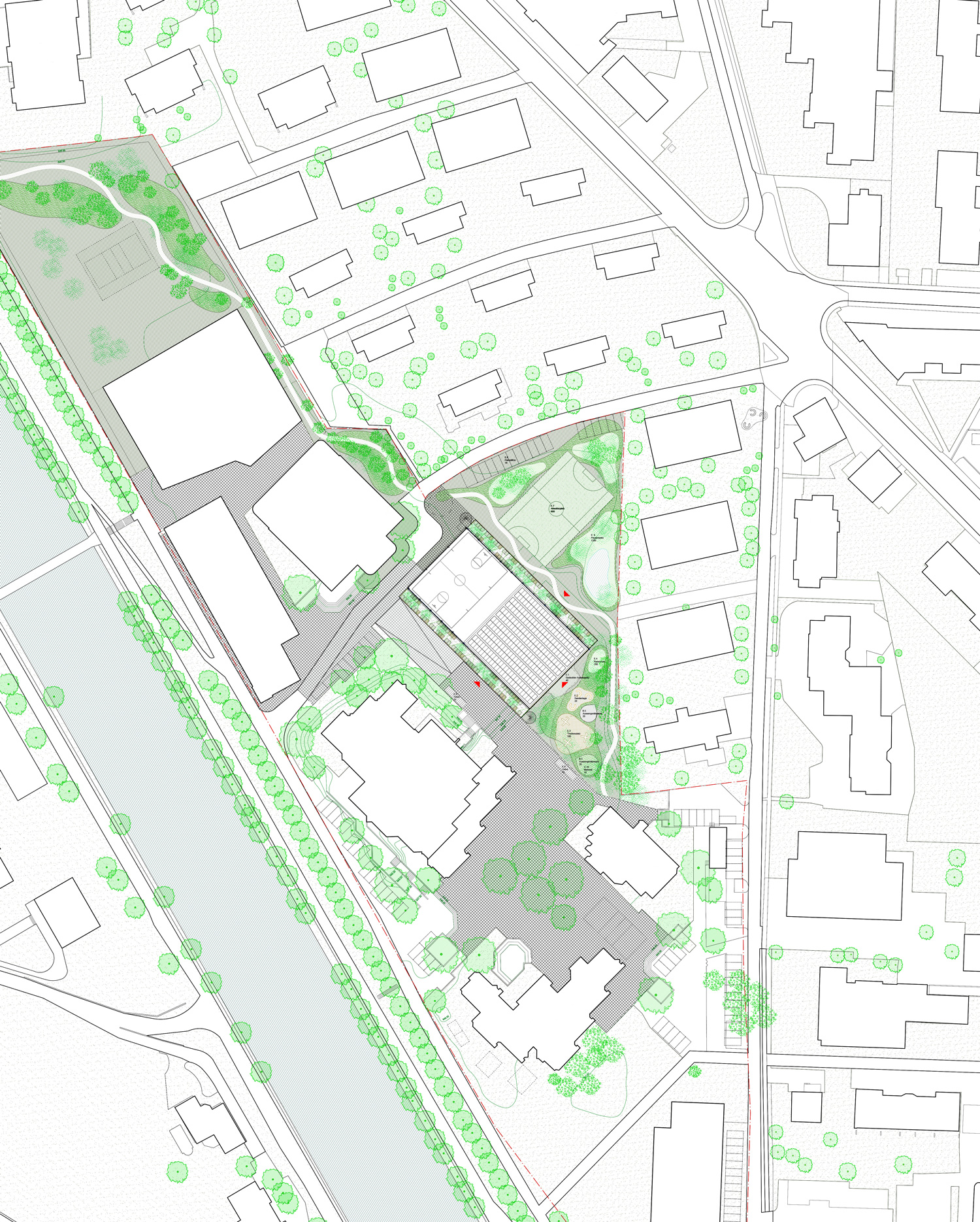 The project is a school with two faces: an urban, mineral front facing the existing brutalist 1970-s schools and a green nature front facing the green space. The park, which we call the “New Biotope”, is a public green space that is a place for play, a green sponge for water infiltration, a place of biodiversity and a noise buffer between the school building and the adjecent residential buildings. The generous balconies are used as a transitional space between the park and the building and serve as elevated space for students’ gardening activities. The project provides a compact school building with minimal footprint adjacent to the existing school complex, maximizing open space for the development of a new park, a new biotope, and reuses the materials of the existing buildings on the site.