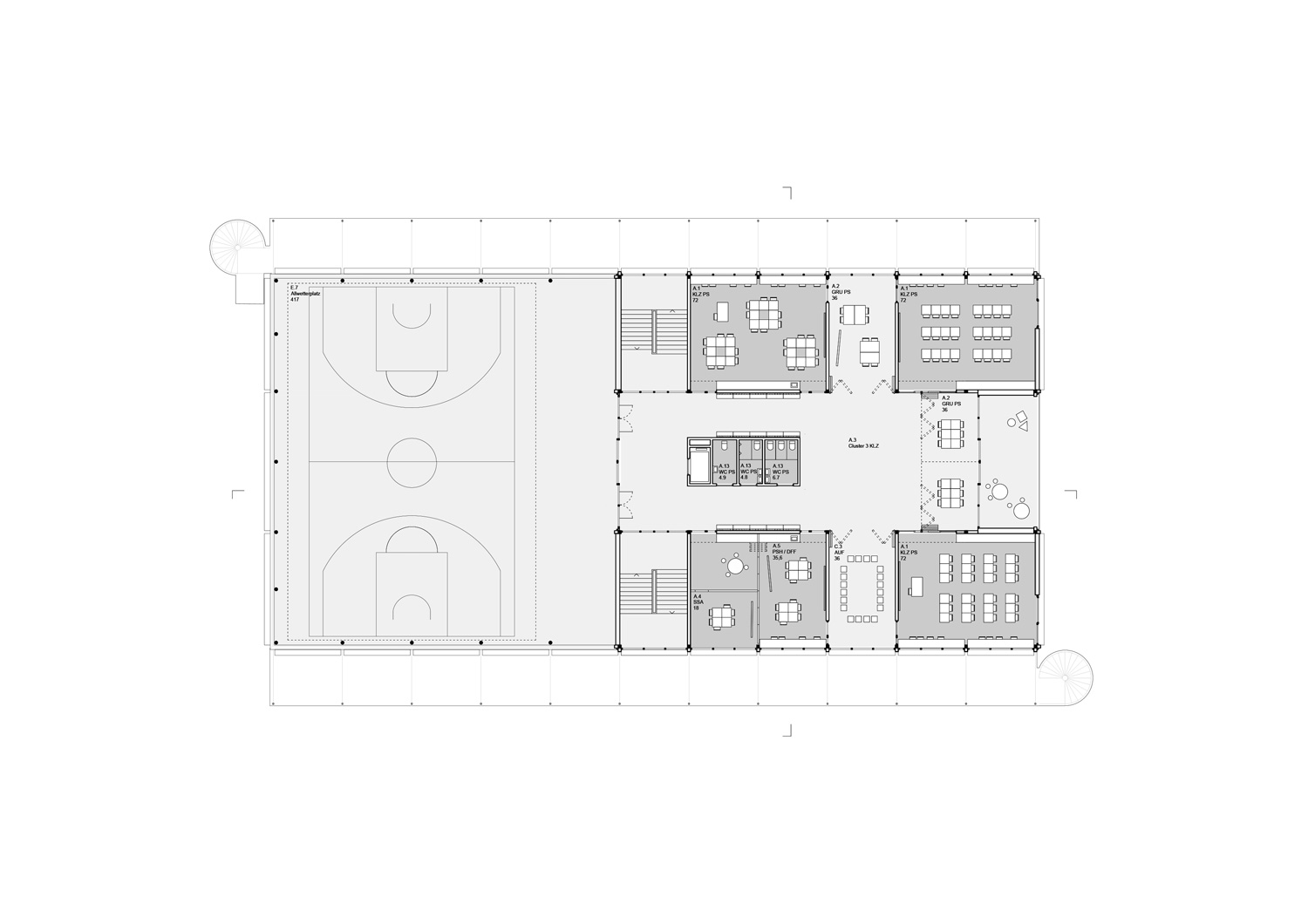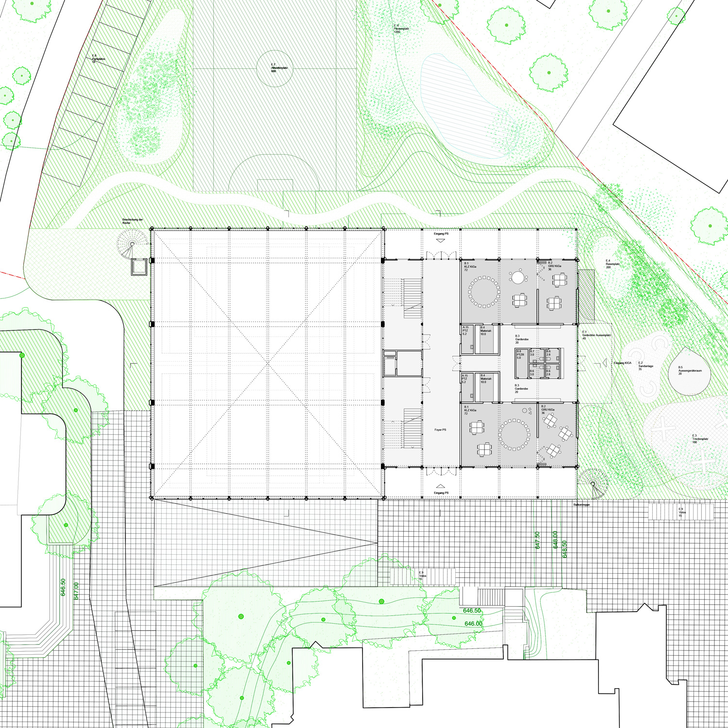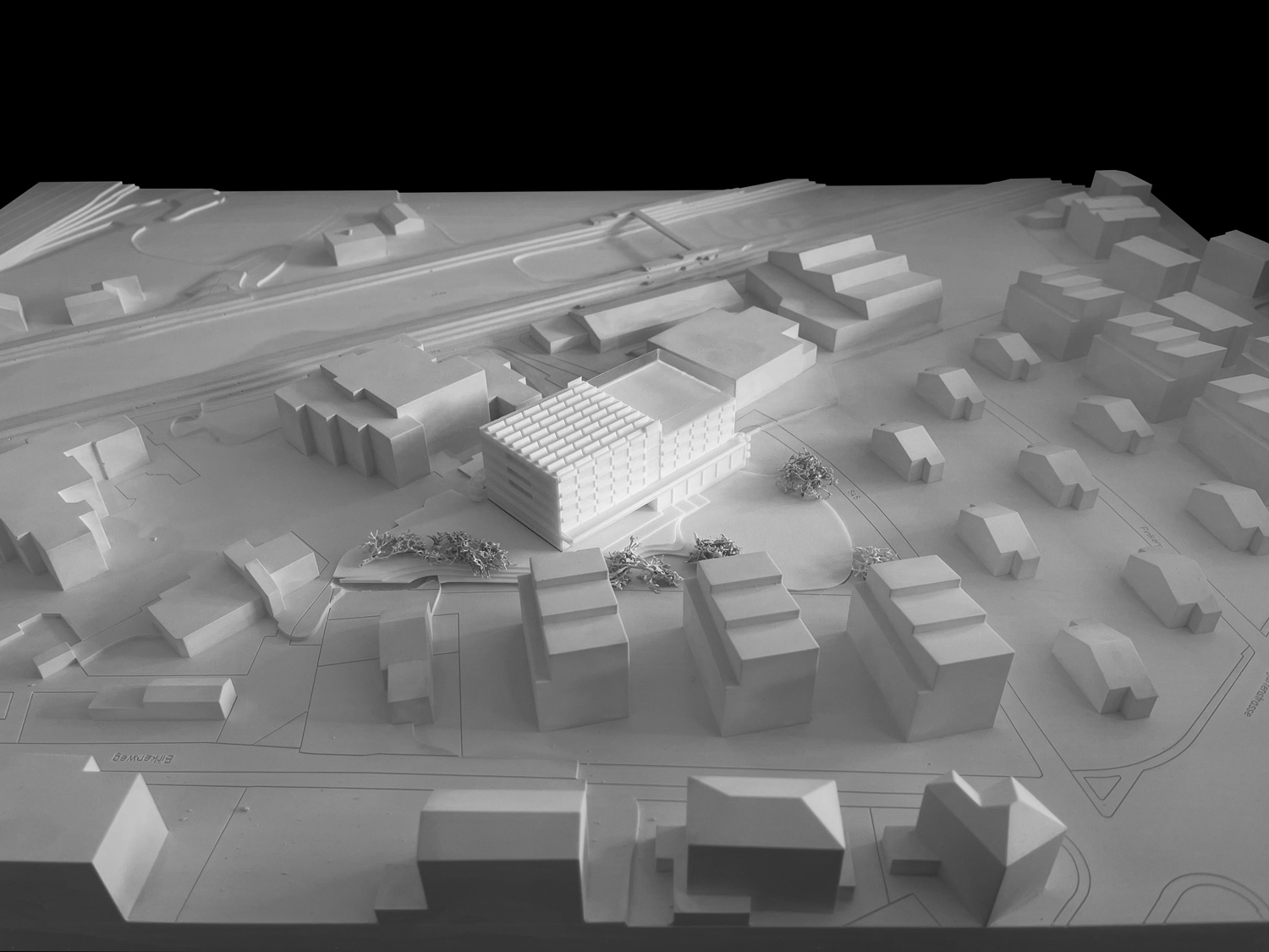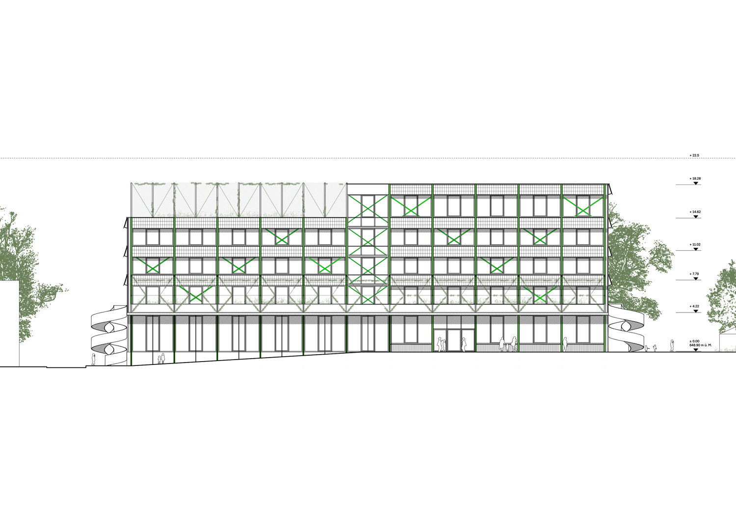 The project is a school with two faces: an urban, mineral front facing the existing brutalist 1970-s schools and a green nature front facing the green space. The park, which we call the “New Biotope”, is a public green space that is a place for play, a green sponge for water infiltration, a place of biodiversity and a noise buffer between the school building and the adjecent residential buildings. The generous balconies are used as a transitional space between the park and the building and serve as elevated space for students’ gardening activities. The project provides a compact school building with minimal footprint adjacent to the existing school complex, maximizing open space for the development of a new park, a new biotope, and reuses the materials of the existing buildings on the site.