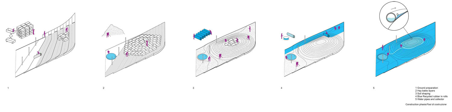 Rub the Belly is a temporary multi-purpose laboratory and a climbable landscape. Thanks to its inclination you can play on it, take a nap, take part in a yoga class, see an art performance or simply contemplate the sky. The material to realize it is a recycled rubber coming from different types of rubber such as tires of cars or electrical components. Once assembled, it is compacted in big volumes and then cut in different sizes and shapes. It is a soft material that everyone wants to touch and interact with him. Are you ready to rub? The top of the Belly collects rainwater. Thanks to the use of gravity, the rainwater is collected in a tank at the base of the hill-shaped installation. Native Americans were dancing to make it rain. It was an event for all the community waiting together for the rain to come. Rainwater is a major component of the water cycle and is responsible for depositing most of the fresh water on the Earth.