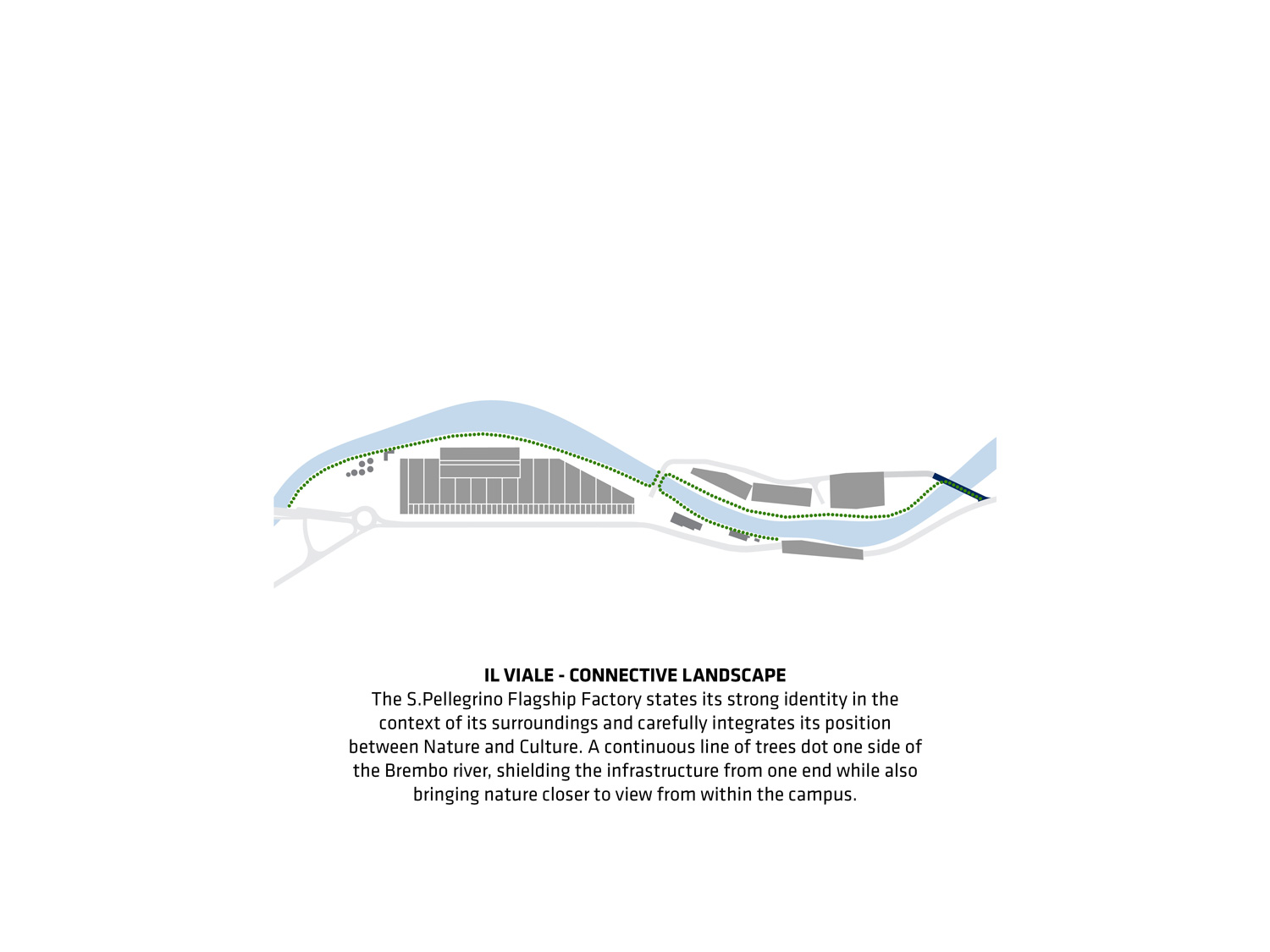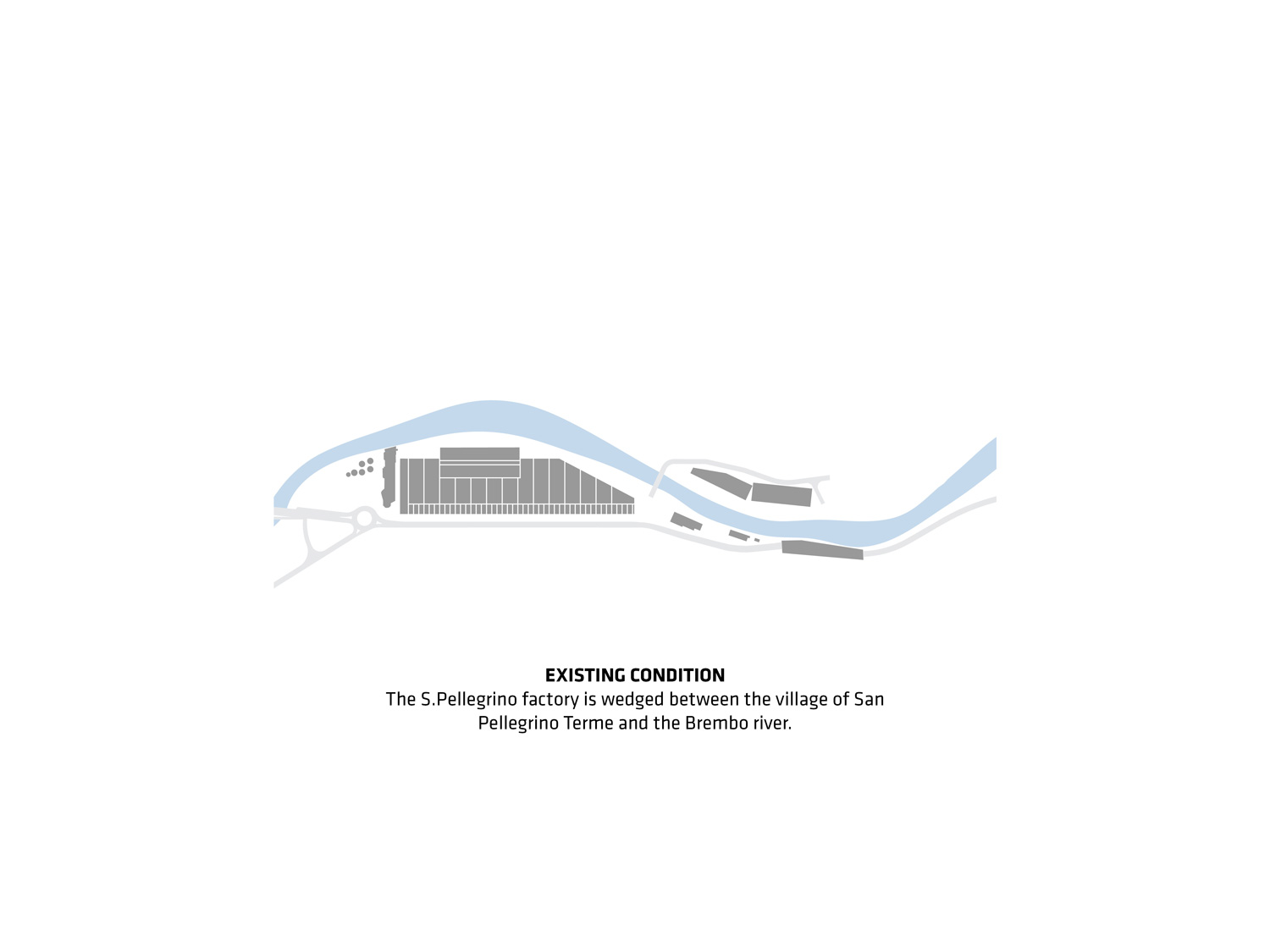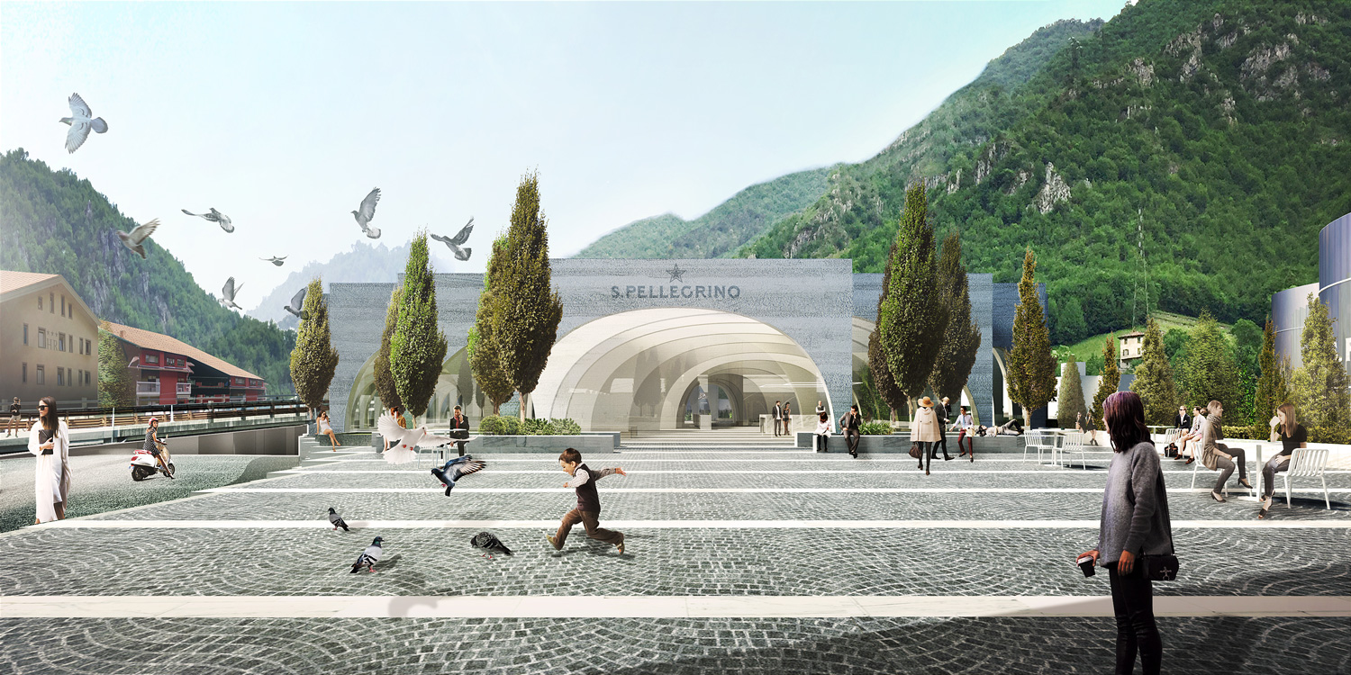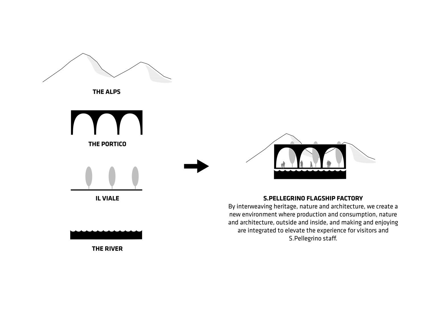 The S.Pellegrino brand identity is deeply rooted in its origin in the San Pellegrino Terme: from the majestic nature, purity of the source and historical heritage, to the century-long development of craft and Italian way of life. As such, the new S.Pellegrino Flagship Factory should not be a radical superposition of new messages or foreign elements, but rather an enhancement and elevation of the qualities that are already abundant in and around the river valley. This proposal offers a fresh take on an ancient wisdom, revisiting the classic elements of Italian architecture and urbanism: the arcade, the viale, the piazza and the portico create an architectural environment where production and consumption, nature and architecture, outside and inside, and making and enjoying are integrated to elevate the experience for visitors as well as S.Pellegrino staff. Framed by the river valley and mountains on either sides, employees and visitors will feel immersed in nature from all directions, with abundant views to the flowing river, the forested slopes, the snowy summits and the clear skies.