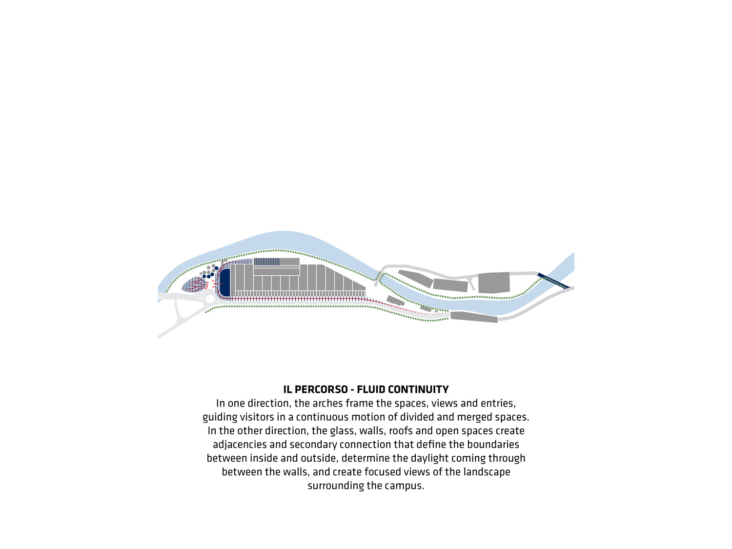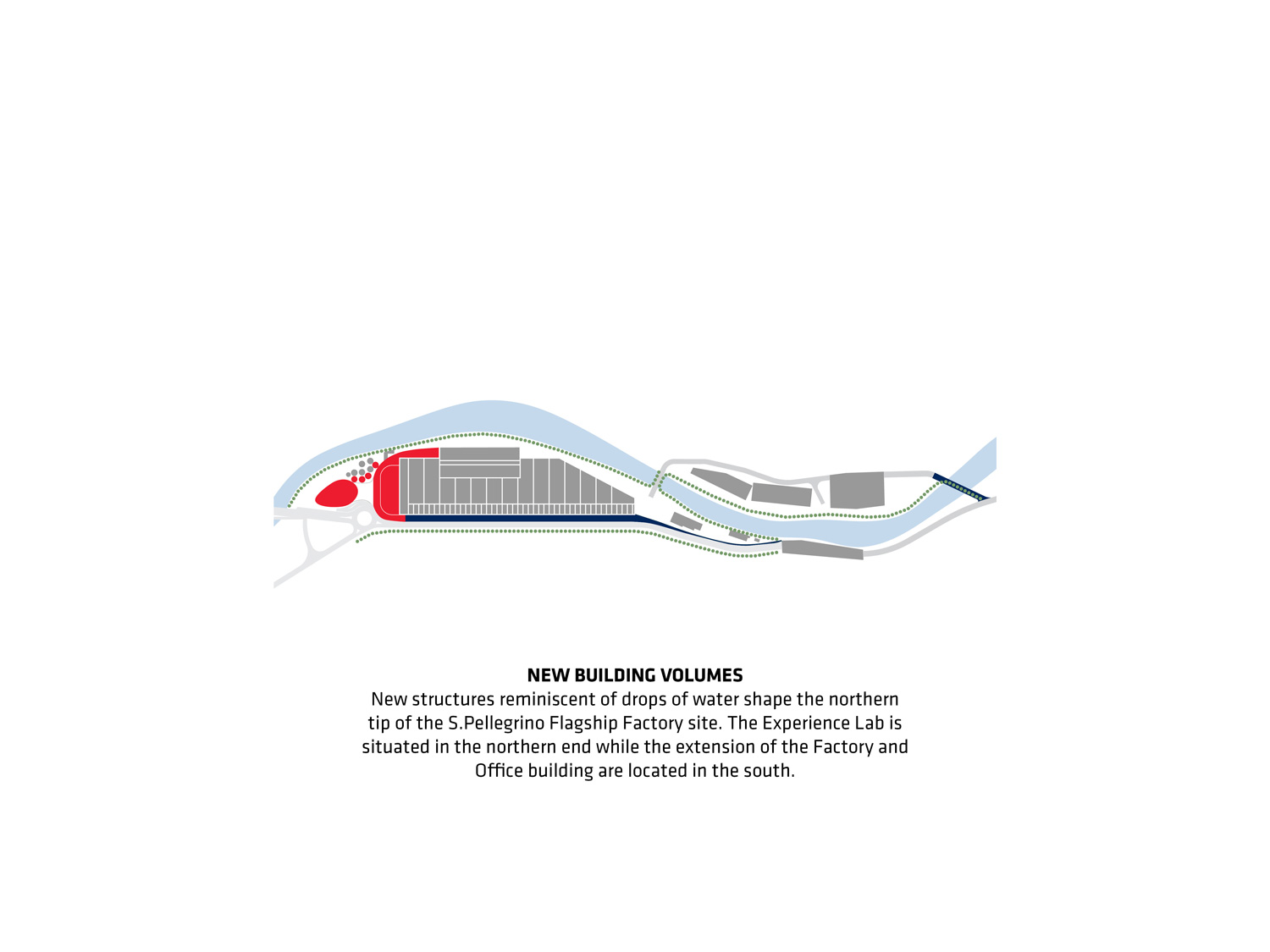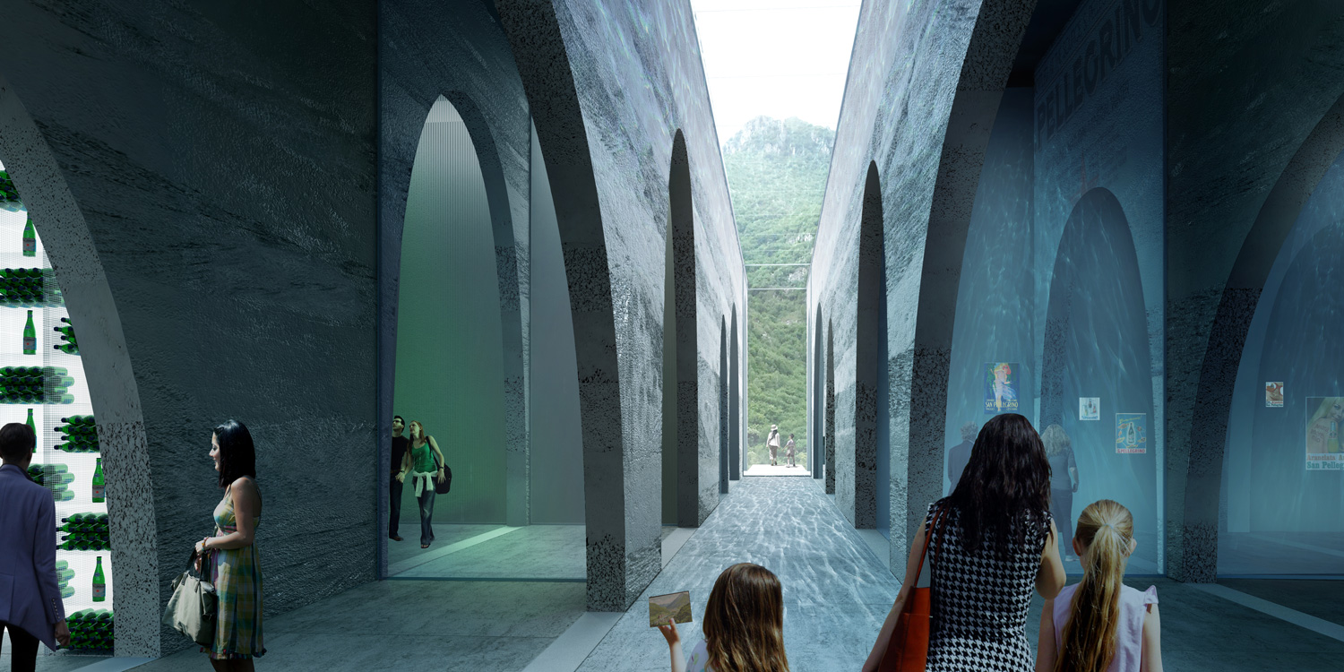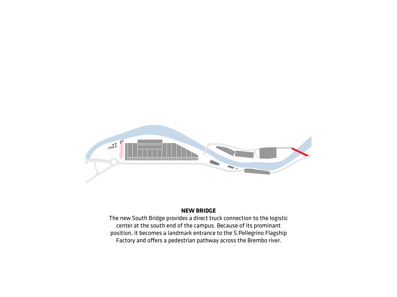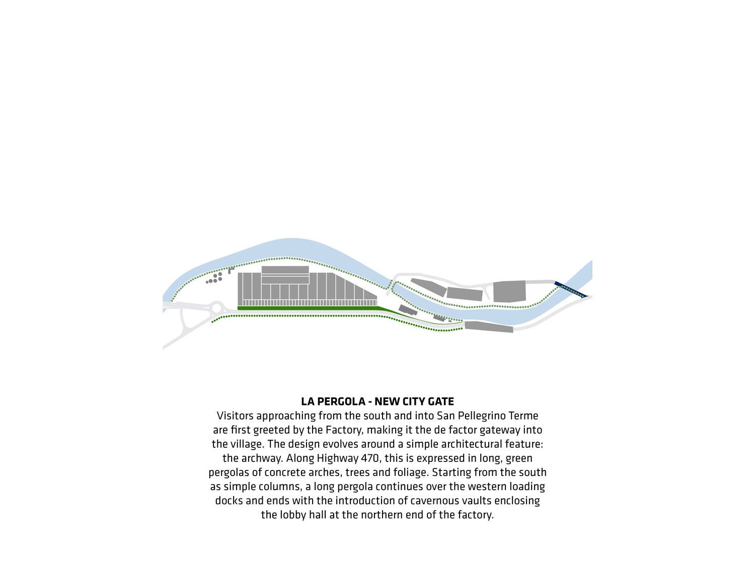 The S.Pellegrino brand identity is deeply rooted in its origin in the San Pellegrino Terme: from the majestic nature, purity of the source and historical heritage, to the century-long development of craft and Italian way of life. As such, the new S.Pellegrino Flagship Factory should not be a radical superposition of new messages or foreign elements, but rather an enhancement and elevation of the qualities that are already abundant in and around the river valley. This proposal offers a fresh take on an ancient wisdom, revisiting the classic elements of Italian architecture and urbanism: the arcade, the viale, the piazza and the portico create an architectural environment where production and consumption, nature and architecture, outside and inside, and making and enjoying are integrated to elevate the experience for visitors as well as S.Pellegrino staff. Framed by the river valley and mountains on either sides, employees and visitors will feel immersed in nature from all directions, with abundant views to the flowing river, the forested slopes, the snowy summits and the clear skies.