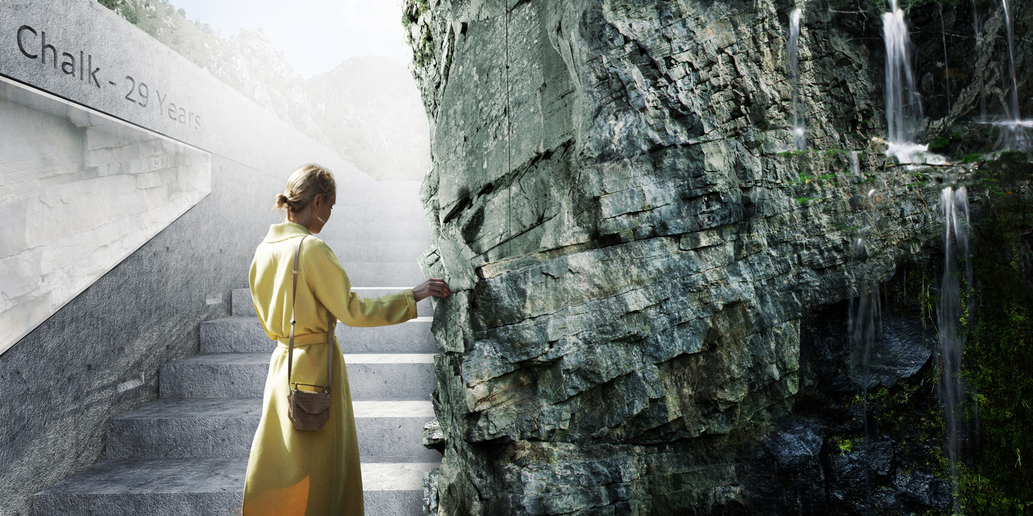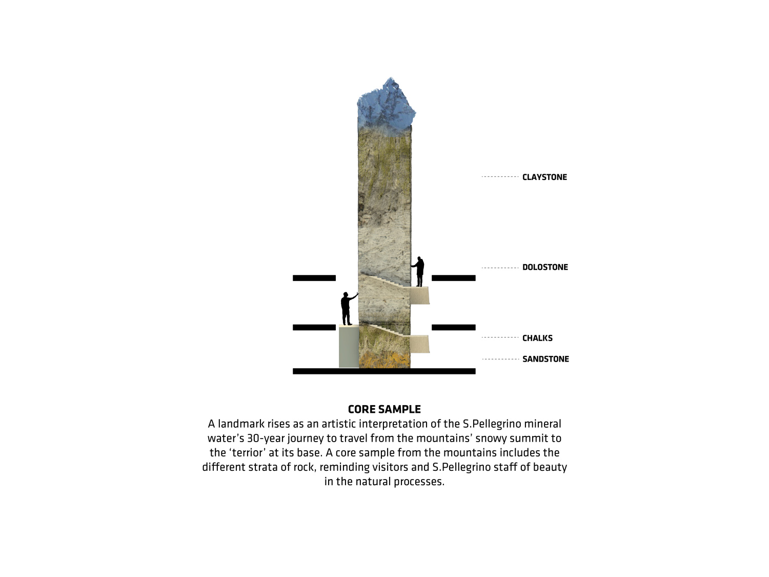 At the heart of the arrival, a new landmark rises in the form of an artistic interpretation of the 30-year journey that the water travels from the mountain’s snowy summit to the spring at its foot. A core sample of the mountain includes the different strata of rock and water at all its stages, turning natural processes into an artistic spectacle that reminds everyone of the wonders of water. Mobilizing the timeless elements such as the arc – the most materially efficient and structurally elegant way to span across large spaces for production, exhibitions and events – and the arcade – the idea that you can create character and articulation through repetition and variation – the architecture of the Factory and Experience Lab has a timeless aura around it. Combining the modular architecture of the Factory with the repetitive elements of Italian Classicism and Rationalism, the space is sculpted by expanding and contracting the span of the arches. Like the aquatic equivalent of a wine cellar, the architecture of the Factory and Experience Lab feels both familiar and fresh; it is firmly rooted in heritage yet evolves into the future.