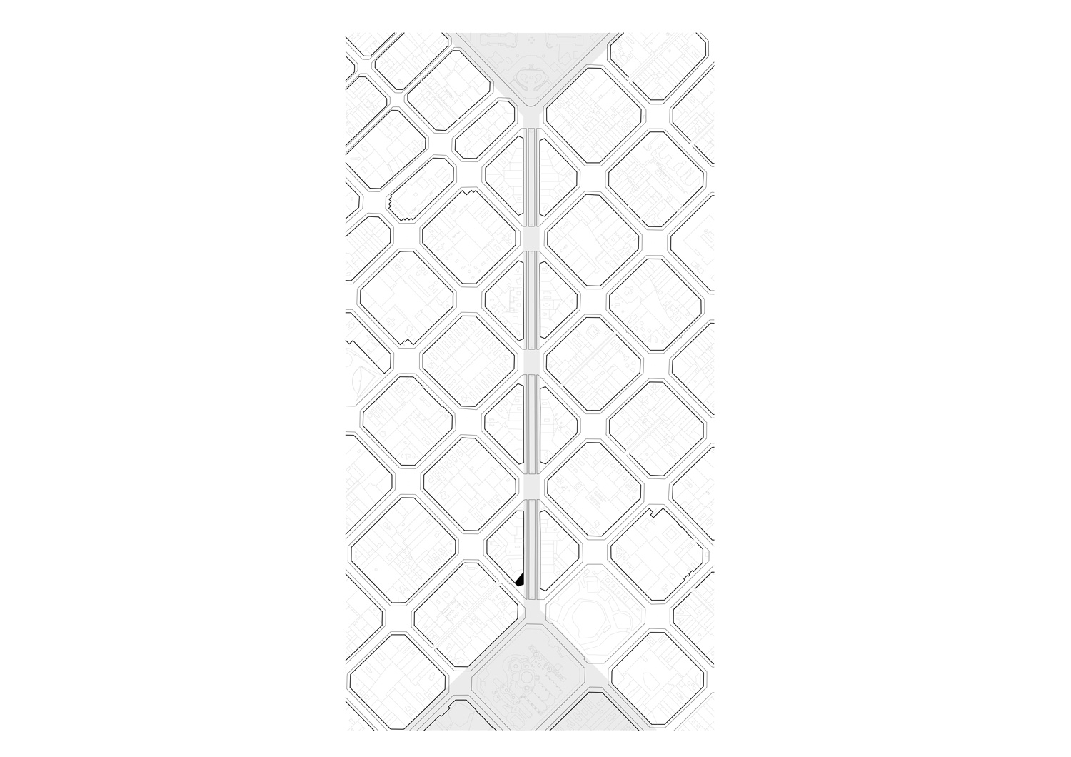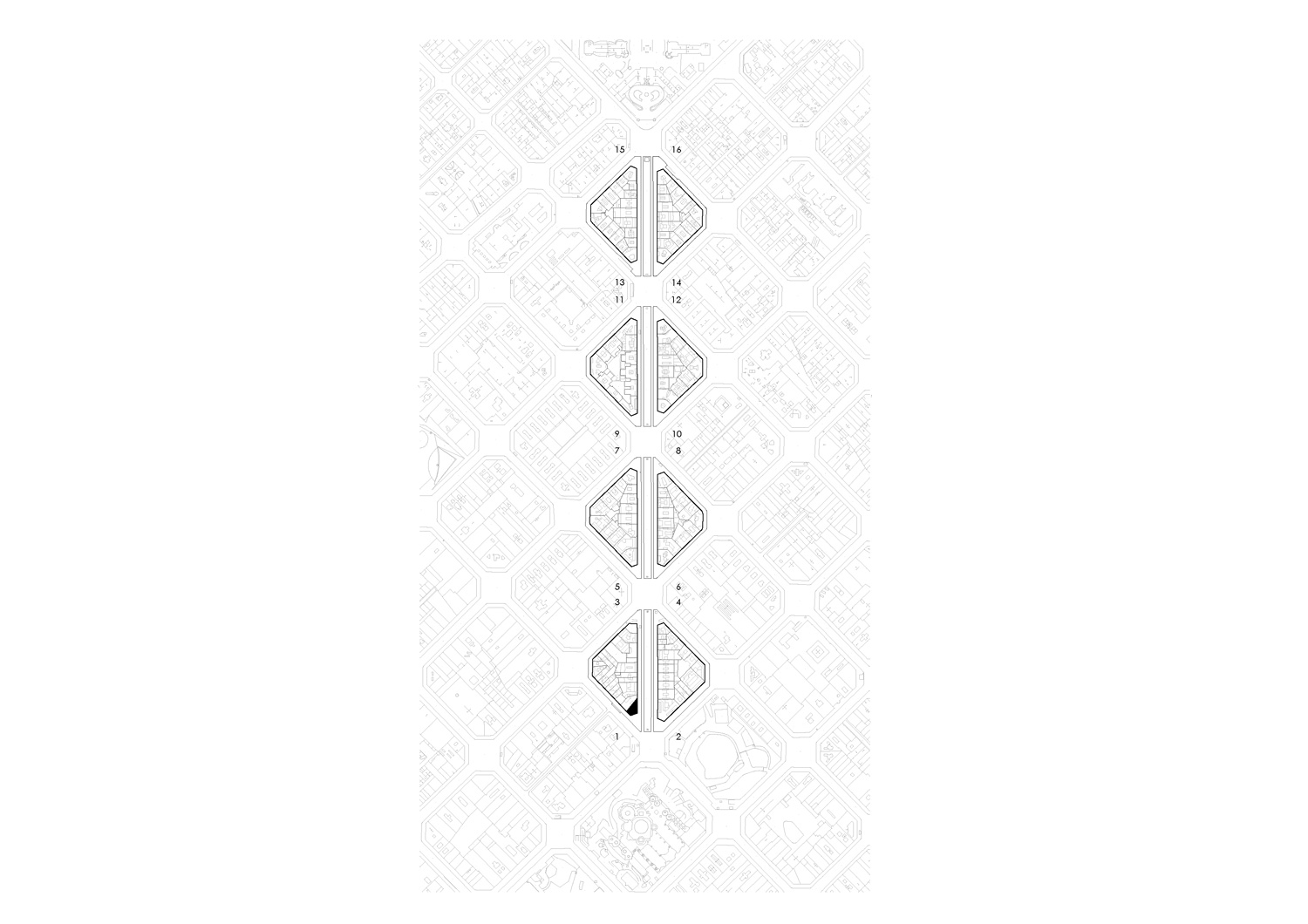 Its layout is made by dividing four blocks of the Eixample on the diagonal, thus resulting in eight half-triangular blocks with their corresponding sixteen chamfers.