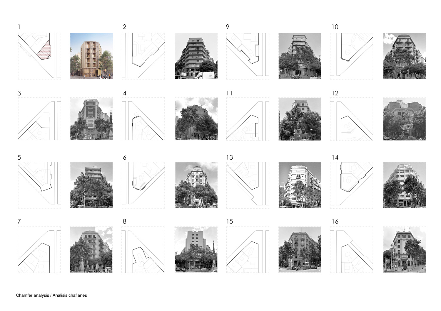 These chamfers are characterized in that two of their main facades form a 45-degree angle, the one of Avenida Gaudí, with the one of the intersecting street, and in turn linked by a facade on the chamfer perpendicular to the bisector. As a result, these chamfers have a completely symmetrical floor plan except for the one in question, which surely has another way of expanding the view of the Sagrada Familia.