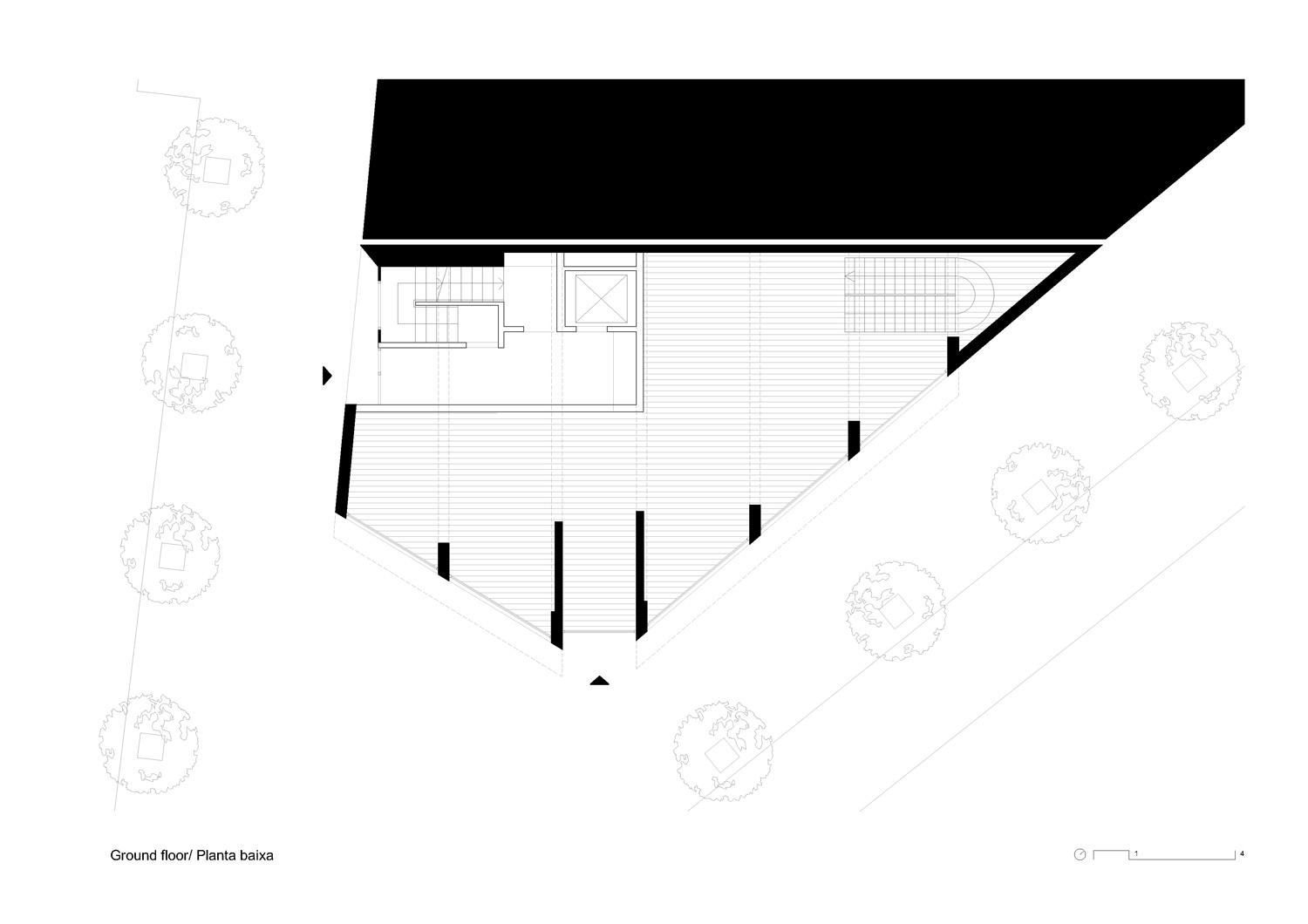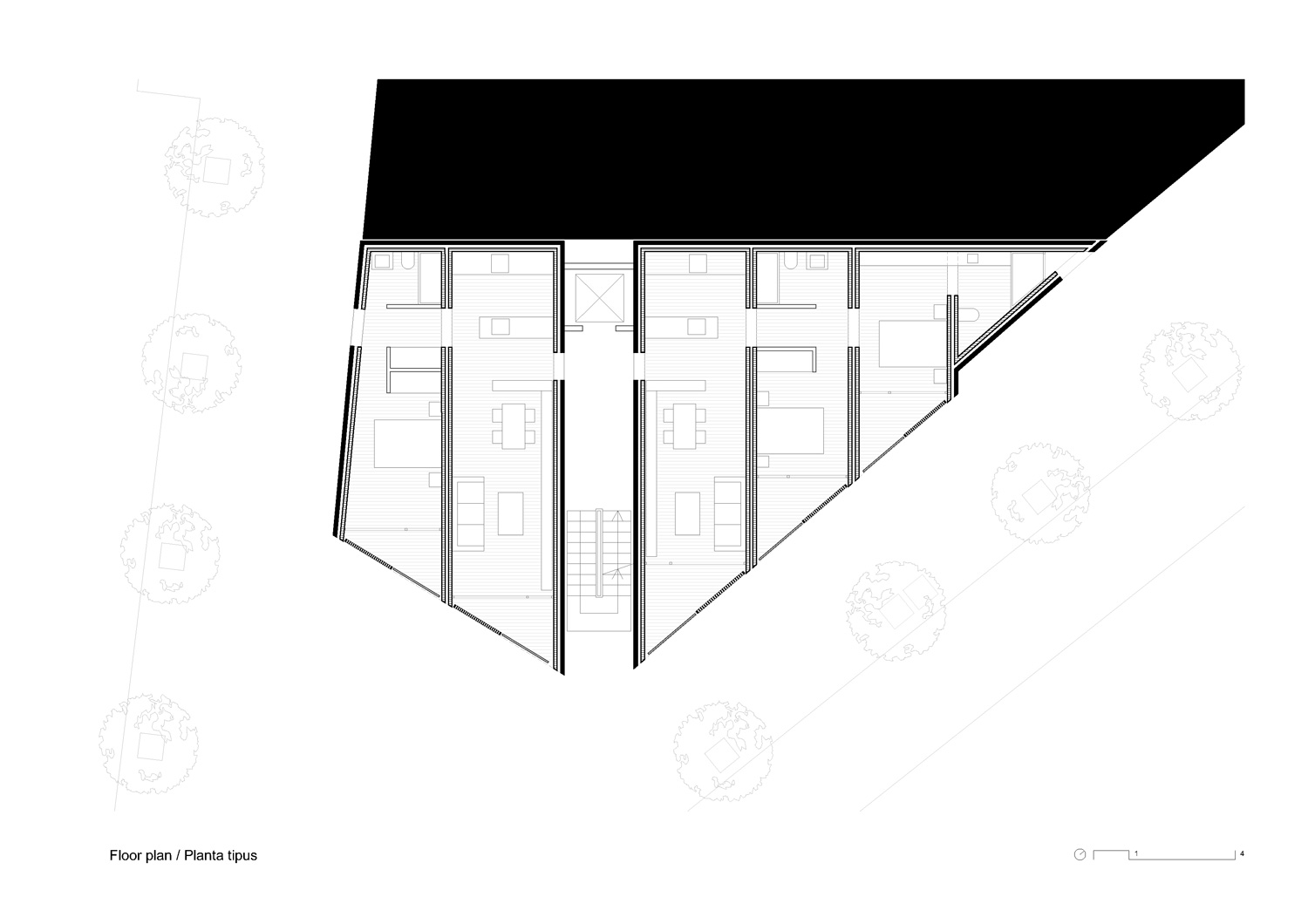 The composition of the facades arises as a direct consequence of the plan modulation and its triangular terraces.