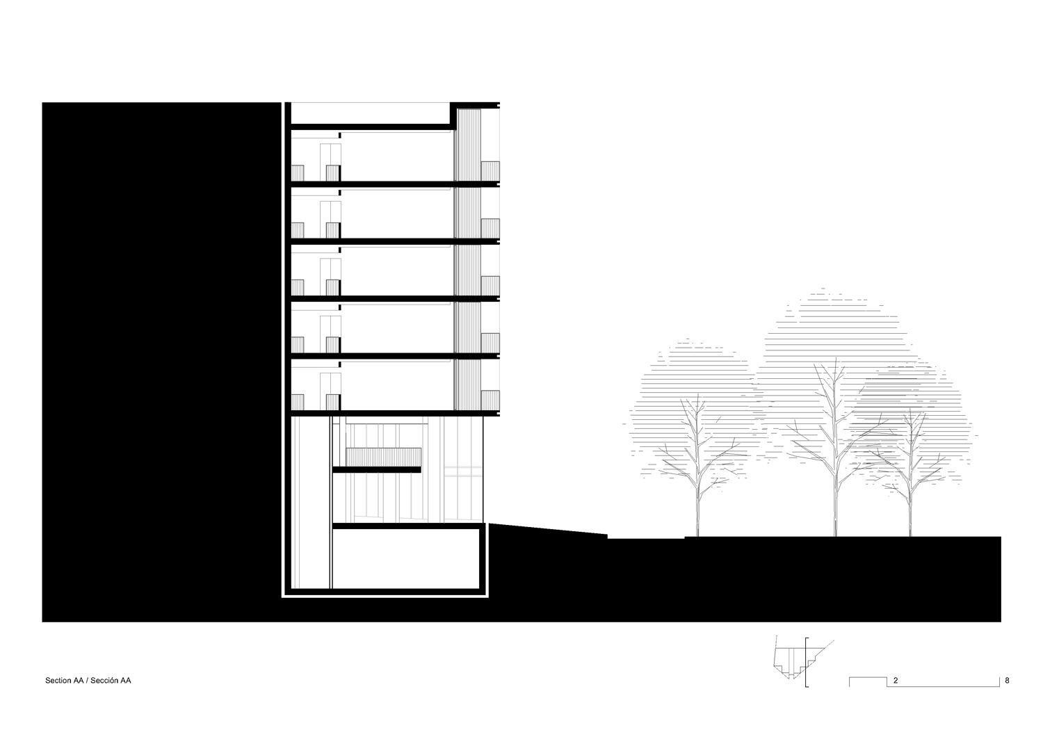Our proposal starts from the orthogonal geometry to the party wall that gives rise to five modules: two for living roomkitchen and three for bedrooms, each with its triangular terrace. Furthermore, this geometry allows us to orient the windows of Avenida Gaudí to look for the visuals of the temple.