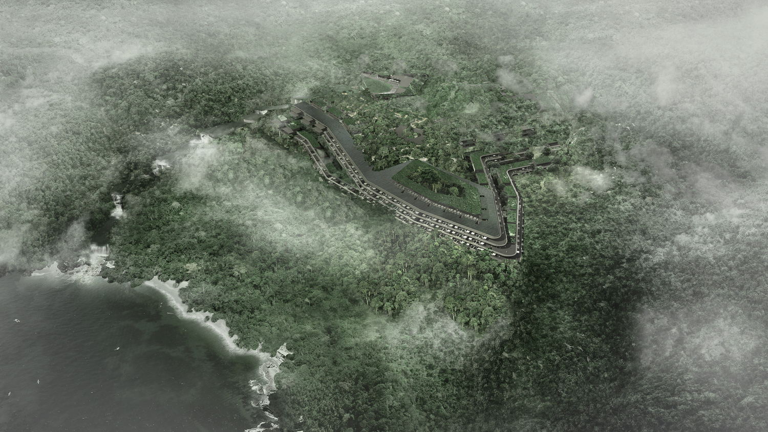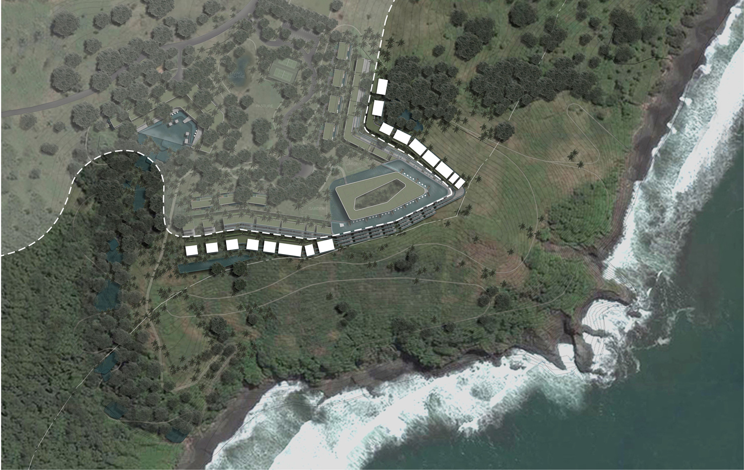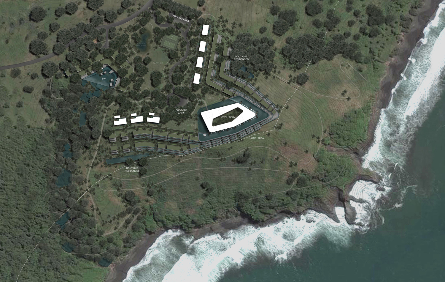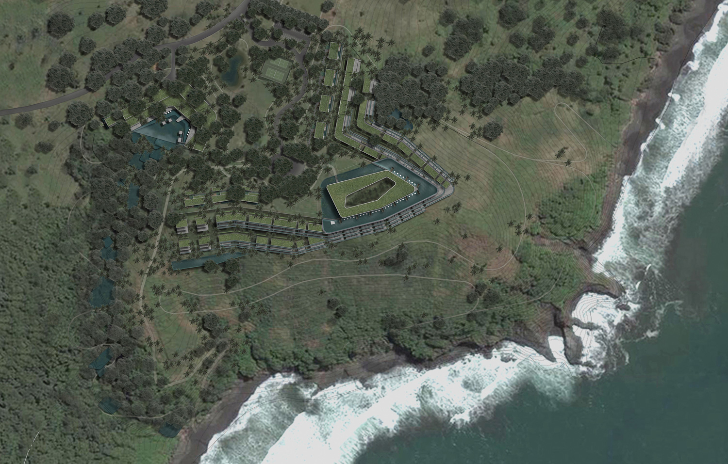 Simplicity and functionality are inherent to the entire design– so that nothing distracts the eye from the ocean and jungle. Villas, cottages, condominium residences, and hotel accommodations with their soaring horizontal lines and cantilevered terraces/ pools are all about space, not status-about connection, not dislocation with the aweinspiring planet we inhabit. Green roofs, deployed on all structures, provide perfect ideal thermal insulation, rain-water retention, and habitats for flora, fauna as well as human inhabitants.