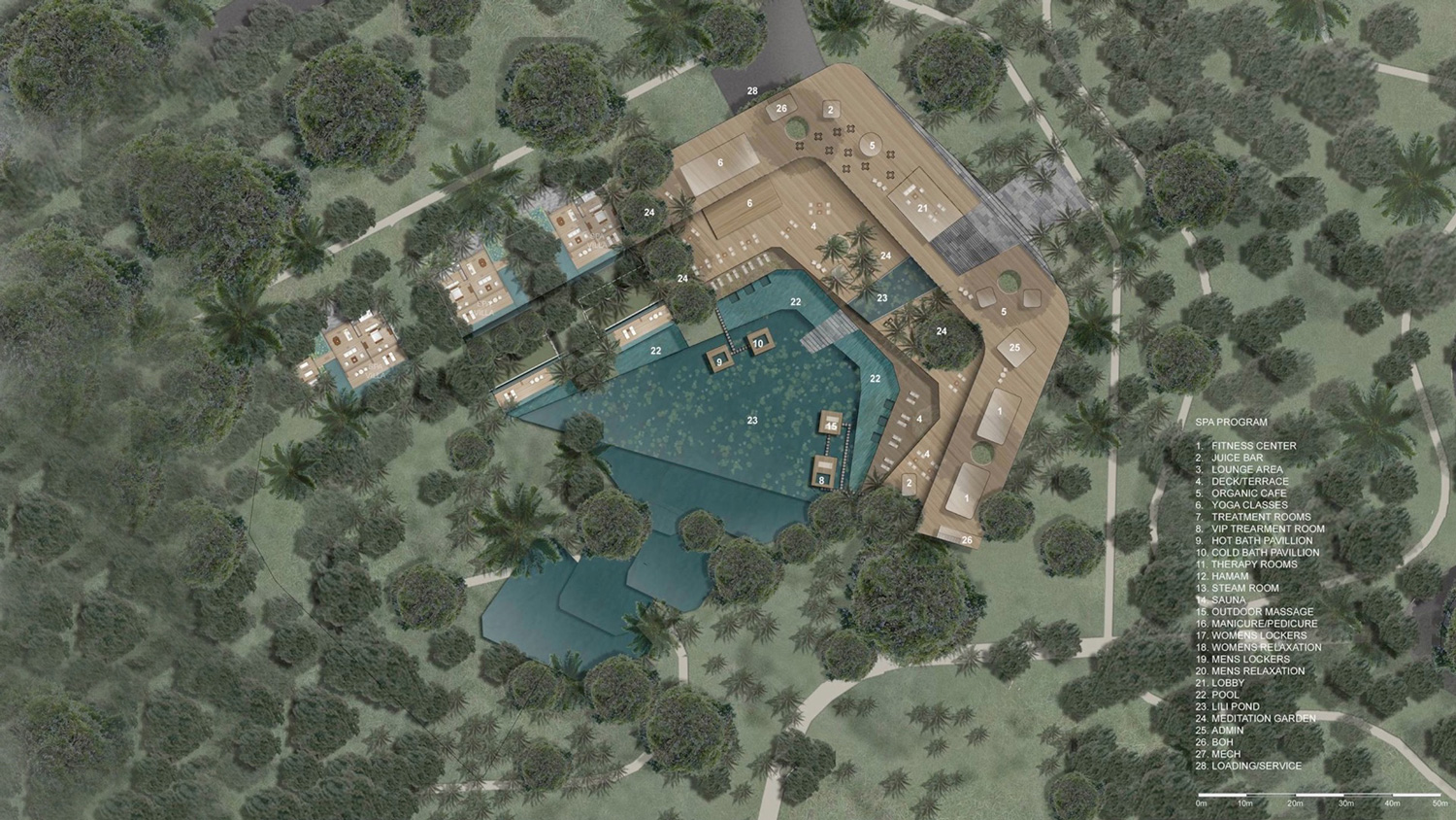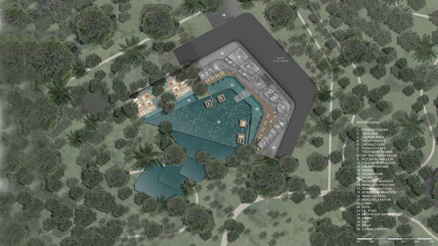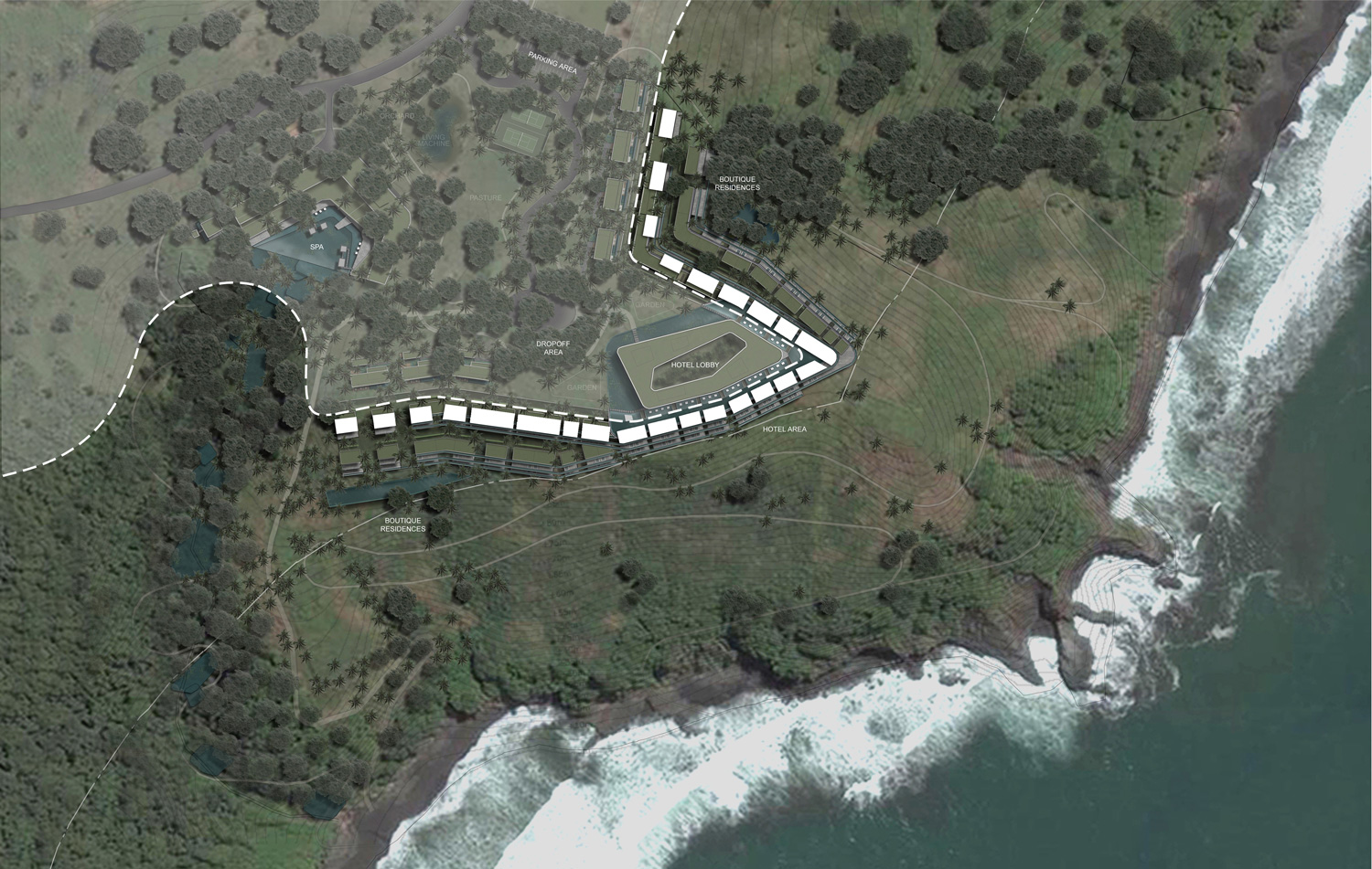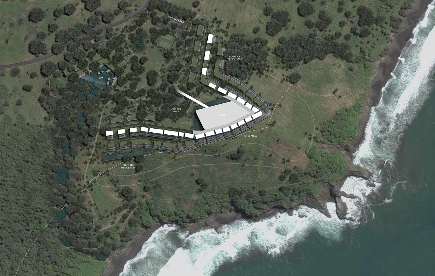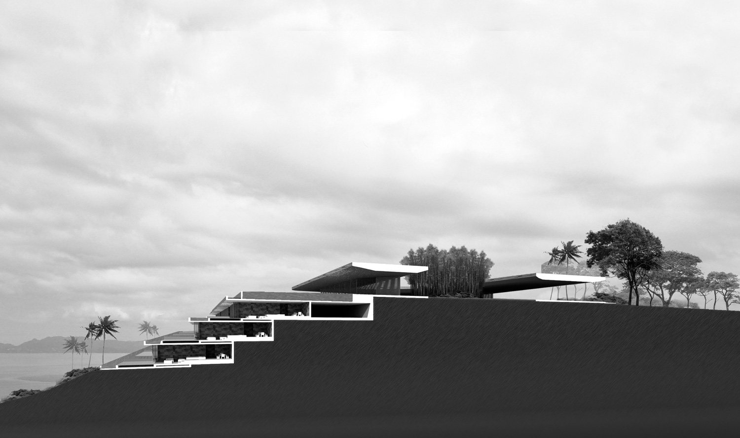 Simplicity and functionality are inherent to the entire design– so that nothing distracts the eye from the ocean and jungle. Villas, cottages, condominium residences, and hotel accommodations with their soaring horizontal lines and cantilevered terraces/ pools are all about space, not status-about connection, not dislocation with the aweinspiring planet we inhabit. Green roofs, deployed on all structures, provide perfect ideal thermal insulation, rain-water retention, and habitats for flora, fauna as well as human inhabitants.