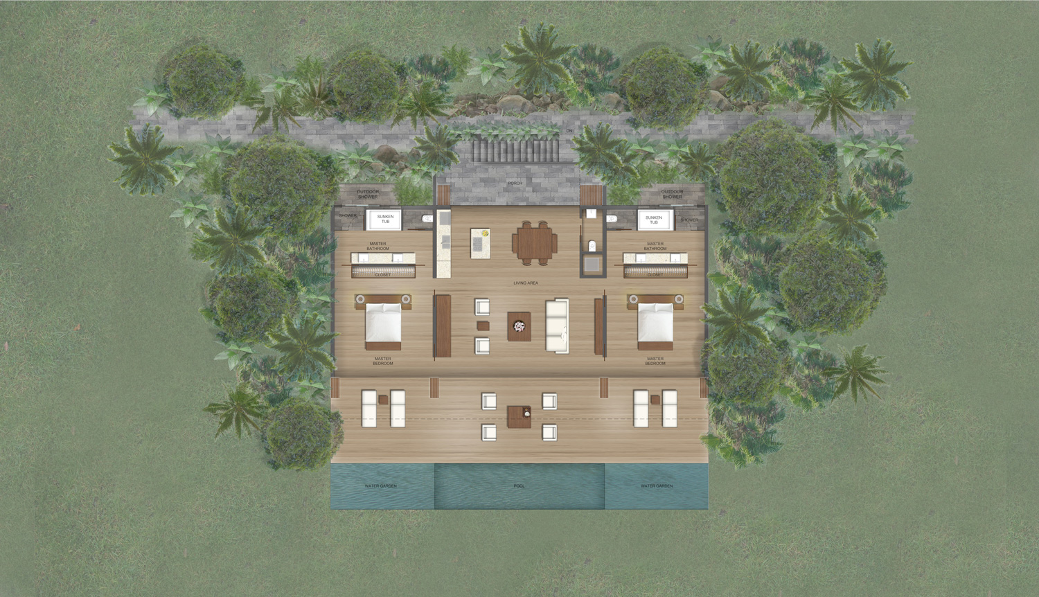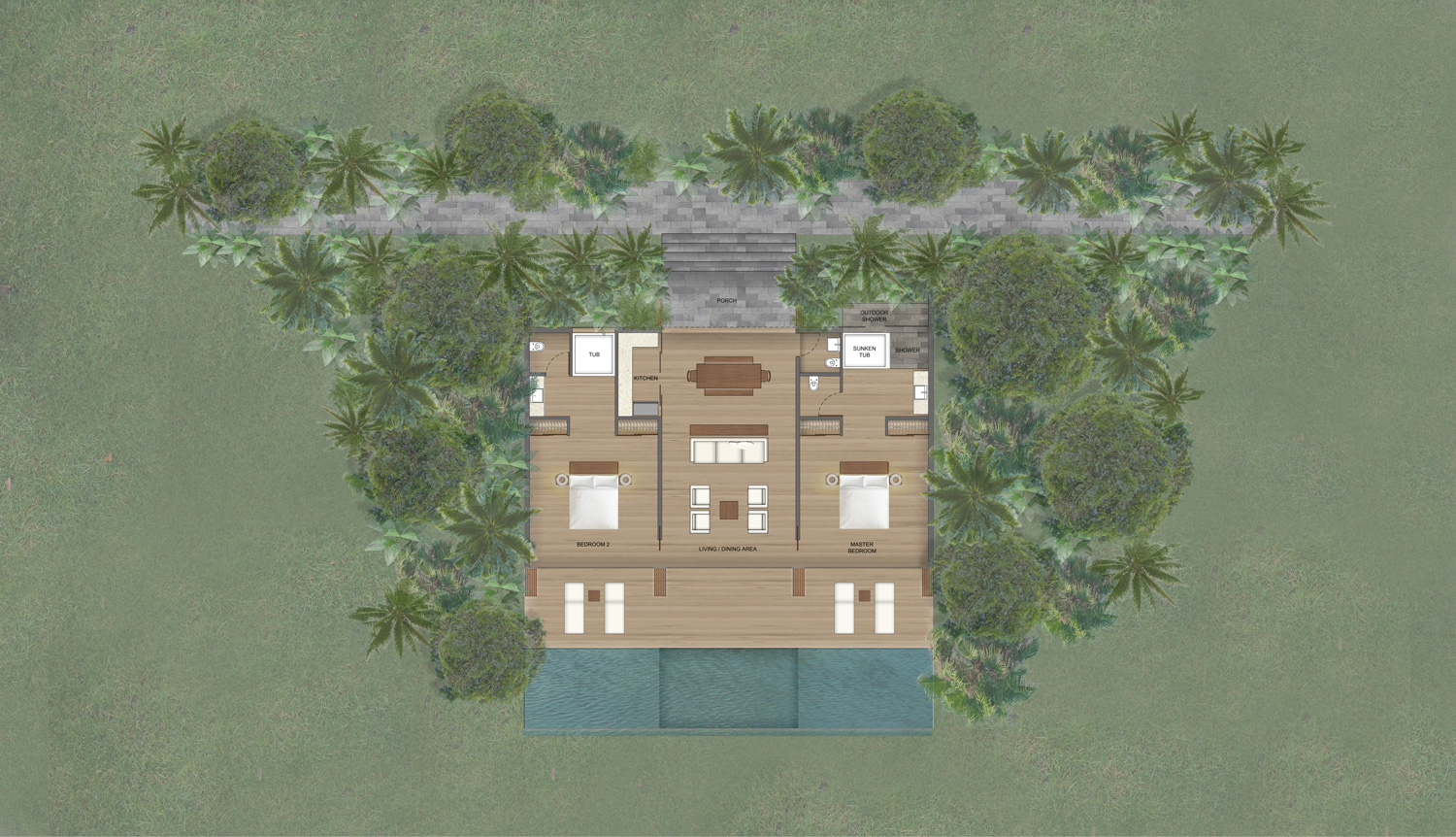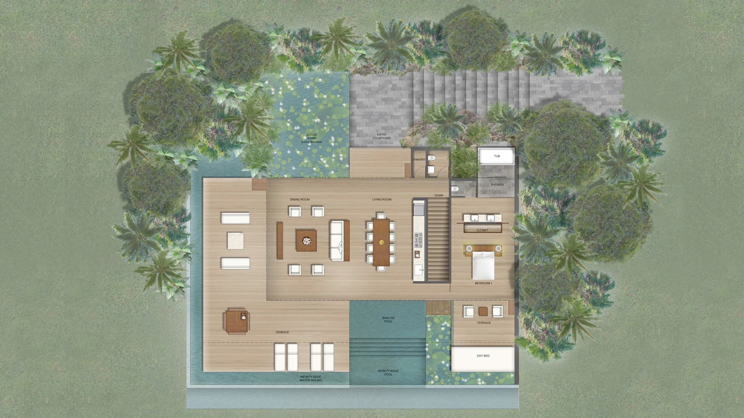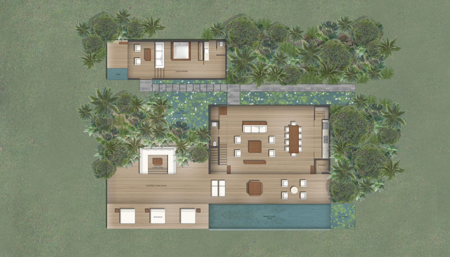 Seamless and integral, the boundaries between man-made and nature, interior and exterior are deliberately blurred establishing maximum impact with minimum effort. Dramatically situated; yet, the residences, the essence of jungle eco-luxury are nestled into the landscape amidst endless pools and verdant flora– where architecture heightens rather than distorts ones awareness of the context. Beauty, power and humility are accomplished from a profound understanding of flow, light and orientation with the topography-strengthening relationships to surrounding blue (water) and green (land) scapes.