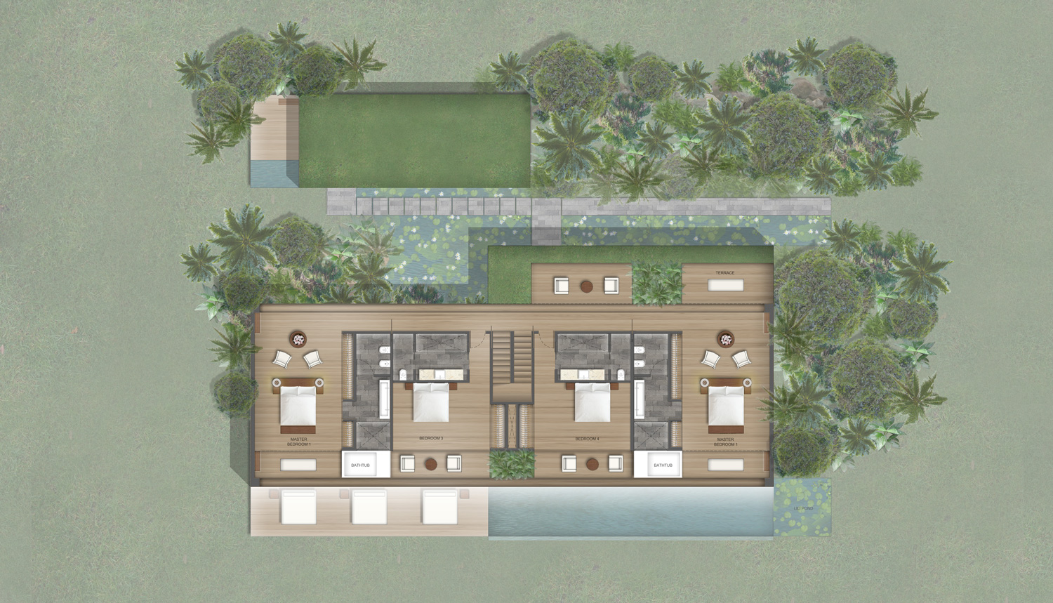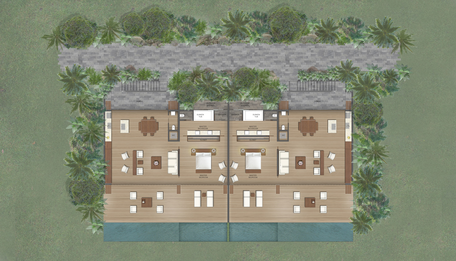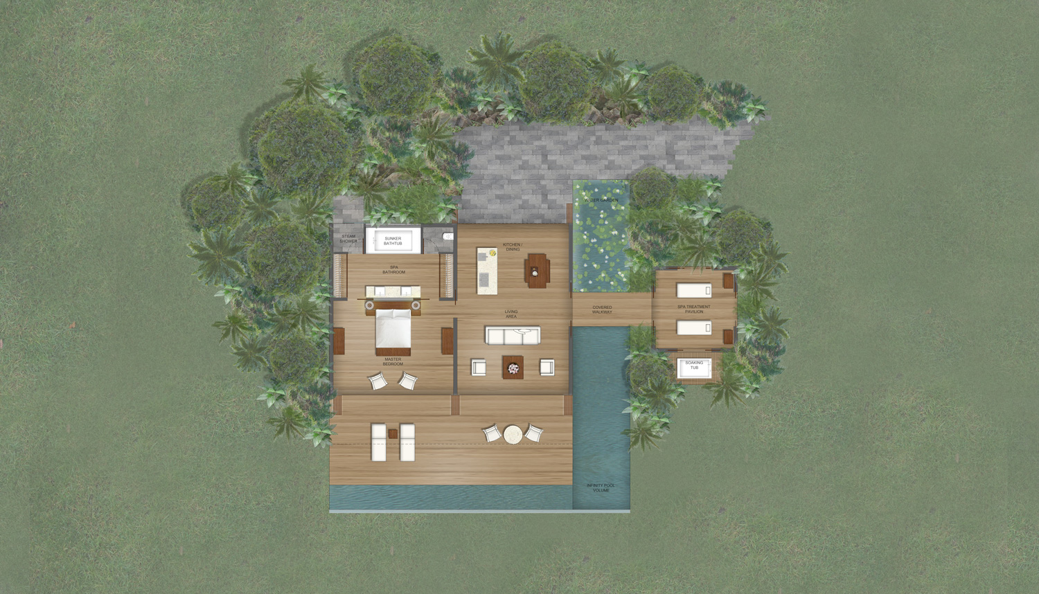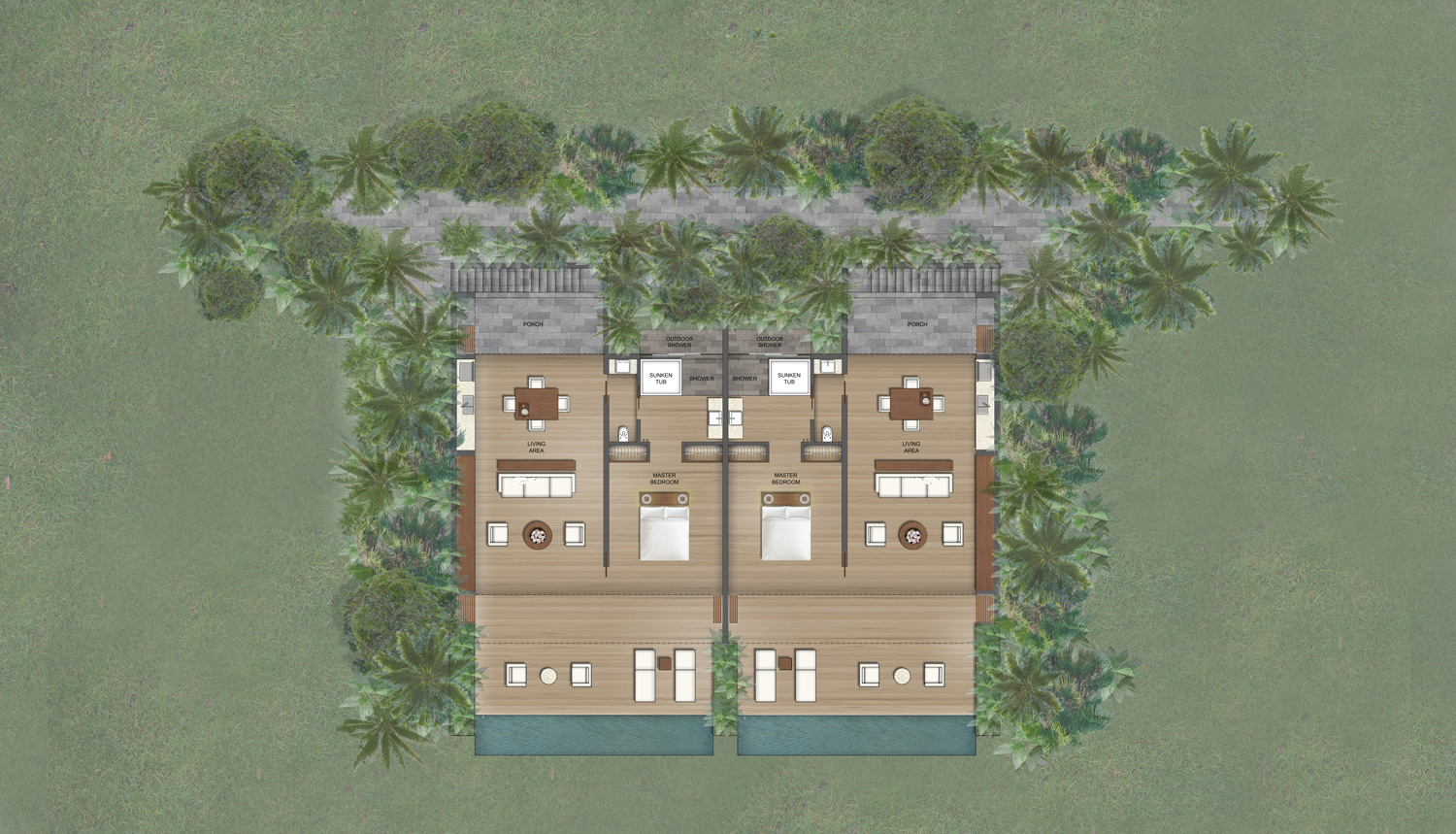 Seamless and integral, the boundaries between man-made and nature, interior and exterior are deliberately blurred establishing maximum impact with minimum effort. Dramatically situated; yet, the residences, the essence of jungle eco-luxury are nestled into the landscape amidst endless pools and verdant flora– where architecture heightens rather than distorts ones awareness of the context. Beauty, power and humility are accomplished from a profound understanding of flow, light and orientation with the topography-strengthening relationships to surrounding blue (water) and green (land) scapes.