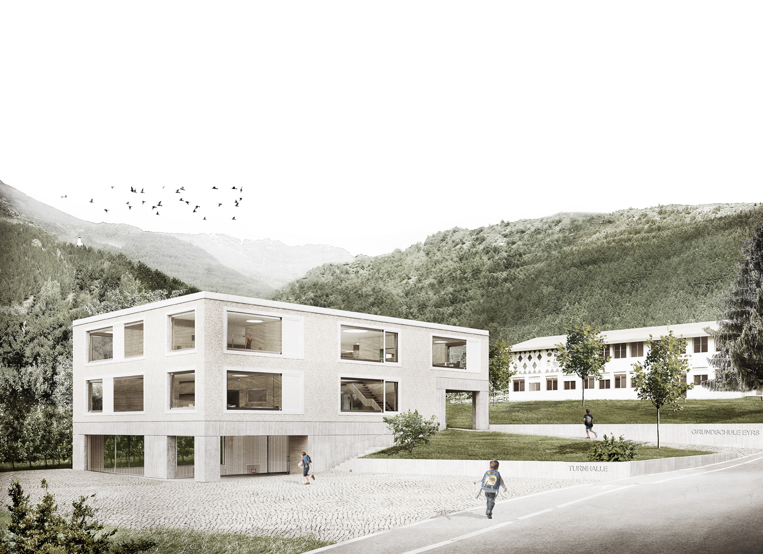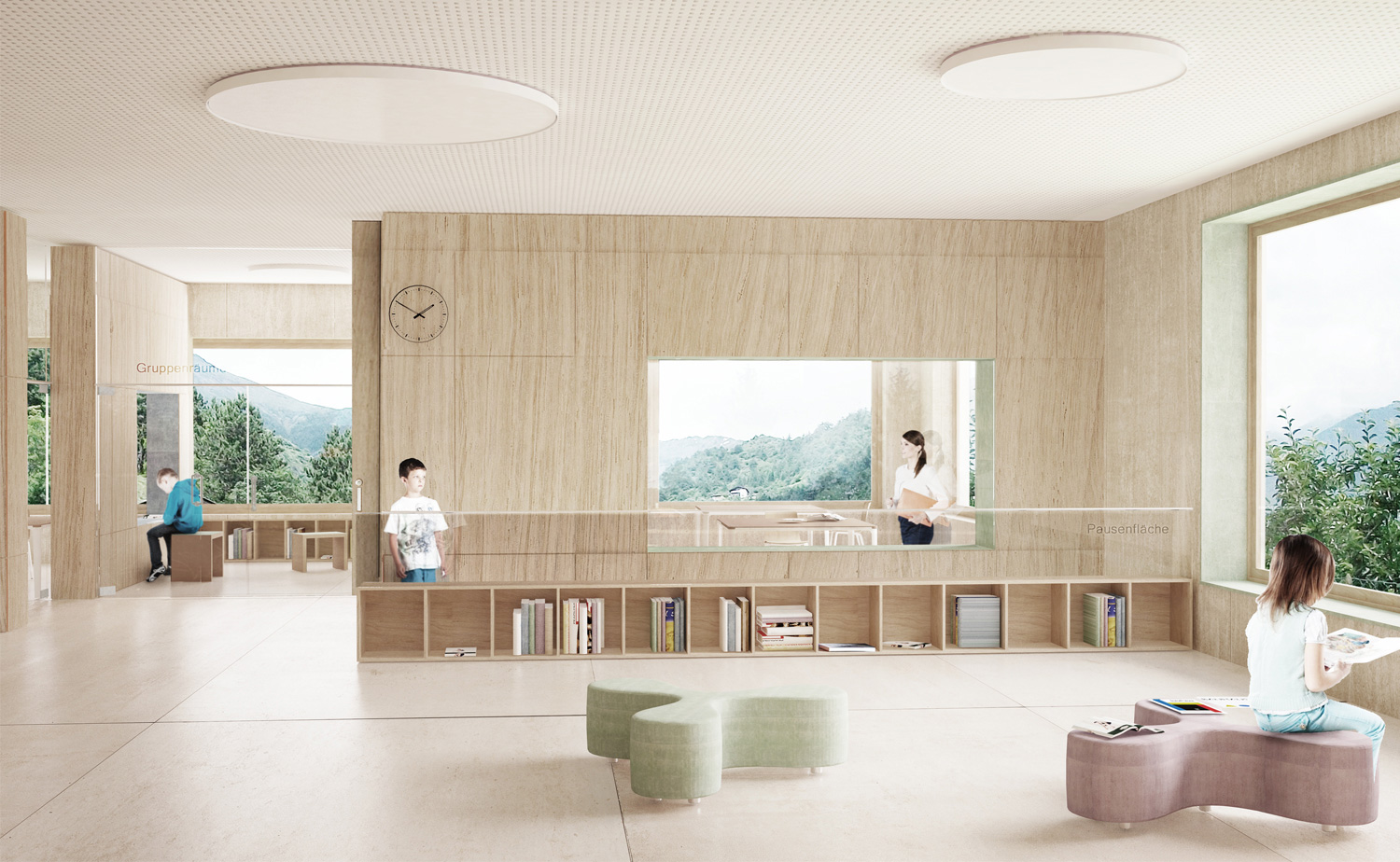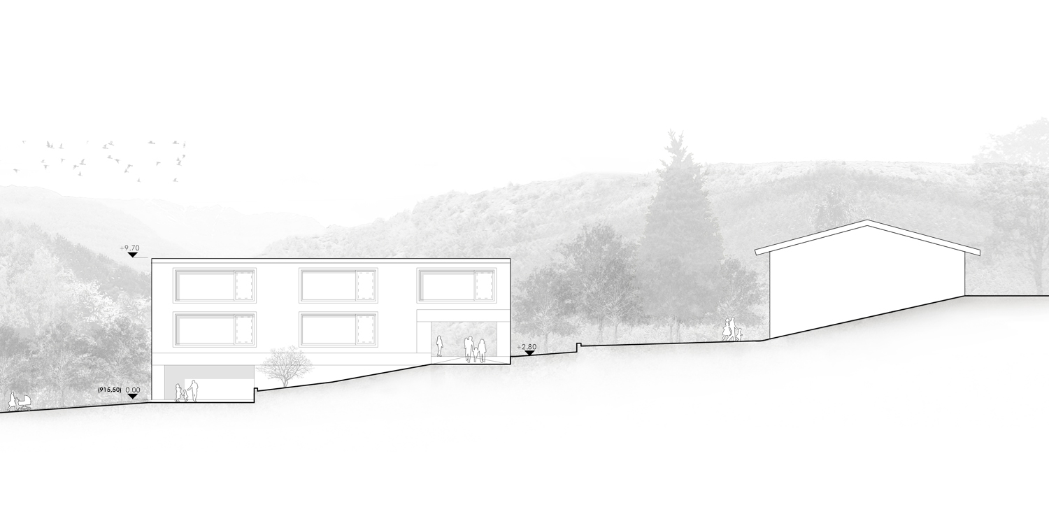 Die neue Grundschule liegt senkrecht zu dem Kindergarten. Die zwei Gebäude bilden ein einheitliches Schulgelände, das von den zwei Gärten verbunden ist. Die zwei benachbarten Gärten werden zu Ort der Begegnung zwischen Generationen. Die Parkplätze sind funktionell konzipiert. Diejenigen, die südlich zu der Grundschule und nördlich zum Kindergarten sind, werden von dem Personal beider Einrichtungen benutzt. Ein Teil des befestigten oberen Areals bleibt leer und wird als Betätigungsraum oder bei größtem Andrang benutzt. Das Gebäude, das am Apfelgarten liegt, lässt den Raum an der Straße frei und bildet einen neuen kleinen öffentlichen Raum. Die weitesten Teile des Tanaserwegs dienen als Orte der Sozialisierung und der Ruhe auf der Weg nach der Schule. Das neue Gebäude integriert sich in die Orographie des Geländes, denn es passt gut zu den Linien und minimiert die Veränderungen der Landschaft. Das Projekt besteht aus einem klaren, festen und präzisen Volumen. Die Turnhalle ist zum Teil unterirdisch und zum Teil taucht auf der Oberfläche auf, auf der Kote des neuen Platzes. Die oberirdischen Fassaden sind sehr transparent und lassen die Landschaft erkennen. Die Durchsichtigkeit der Fronten ermöglicht, den Spielplatz durch das natürliche Tageslicht zu beleuchten.
