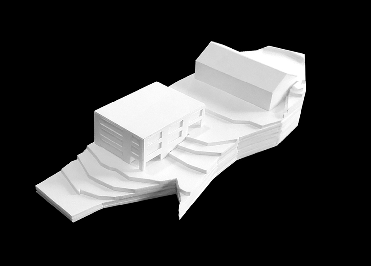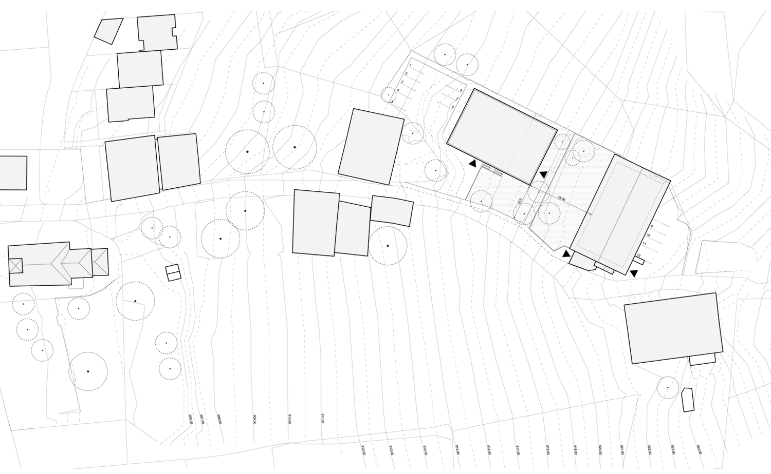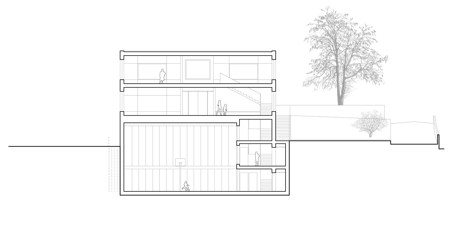 Die neue Grundschule liegt senkrecht zu dem Kindergarten. Die zwei Gebäude bilden ein einheitliches Schulgelände, das von den zwei Gärten verbunden ist. Die zwei benachbarten Gärten werden zu Ort der Begegnung zwischen Generationen. Die Parkplätze sind funktionell konzipiert. Diejenigen, die südlich zu der Grundschule und nördlich zum Kindergarten sind, werden von dem Personal beider Einrichtungen benutzt. Ein Teil des befestigten oberen Areals bleibt leer und wird als Betätigungsraum oder bei größtem Andrang benutzt. Das Gebäude, das am Apfelgarten liegt, lässt den Raum an der Straße frei und bildet einen neuen kleinen öffentlichen Raum. Die weitesten Teile des Tanaserwegs dienen als Orte der Sozialisierung und der Ruhe auf der Weg nach der Schule. Das neue Gebäude integriert sich in die Orographie des Geländes, denn es passt gut zu den Linien und minimiert die Veränderungen der Landschaft. Das Projekt besteht aus einem klaren, festen und präzisen Volumen. Die Turnhalle ist zum Teil unterirdisch und zum Teil taucht auf der Oberfläche auf, auf der Kote des neuen Platzes. Die oberirdischen Fassaden sind sehr transparent und lassen die Landschaft erkennen. Die Durchsichtigkeit der Fronten ermöglicht, den Spielplatz durch das natürliche Tageslicht zu beleuchten.