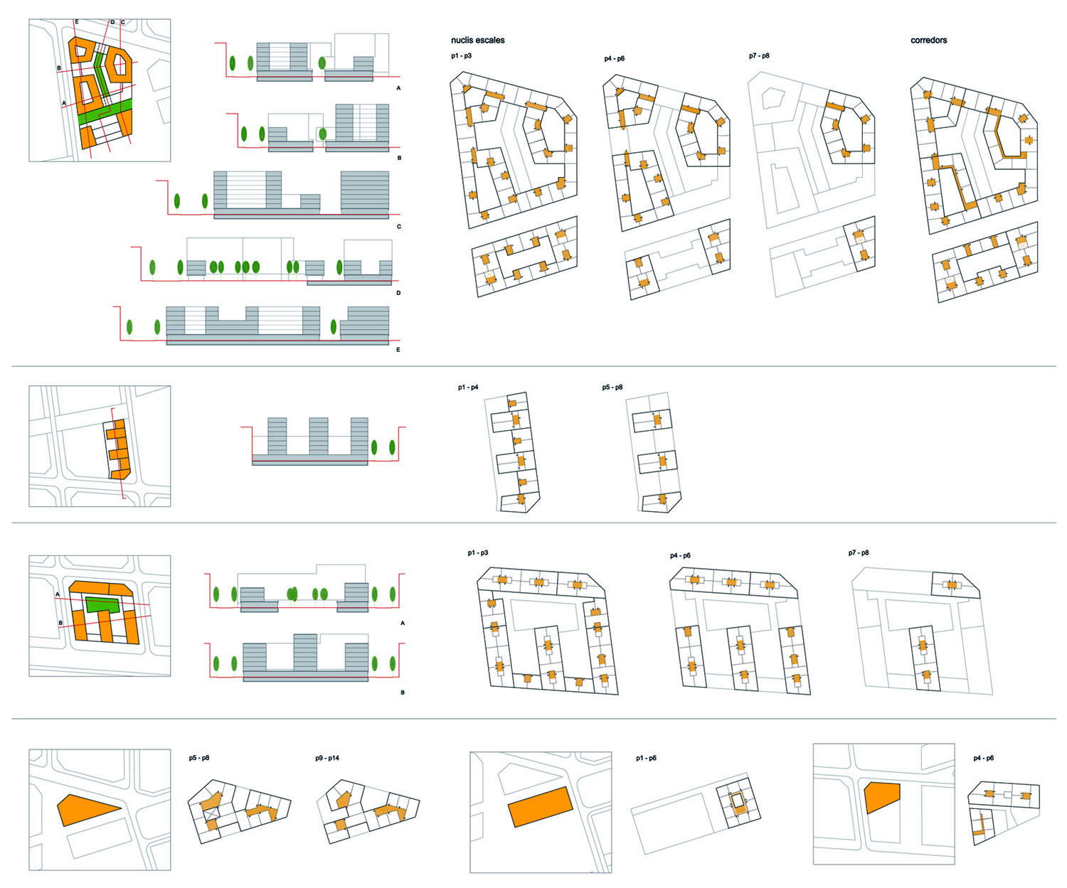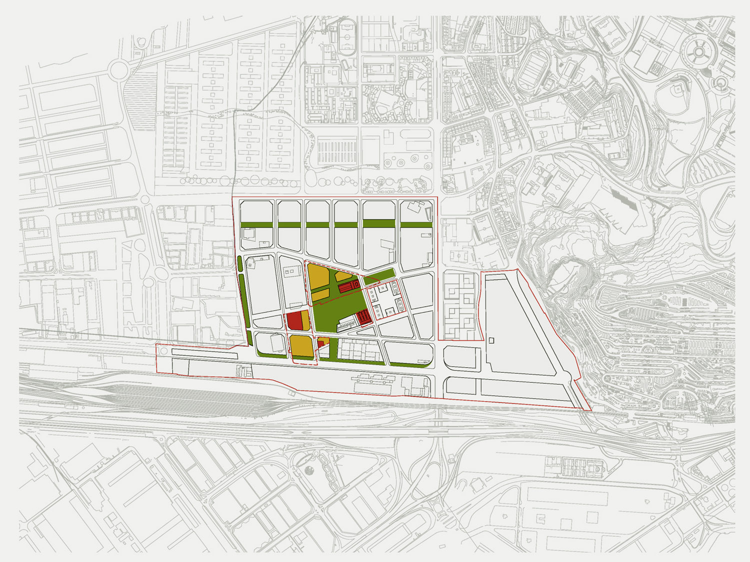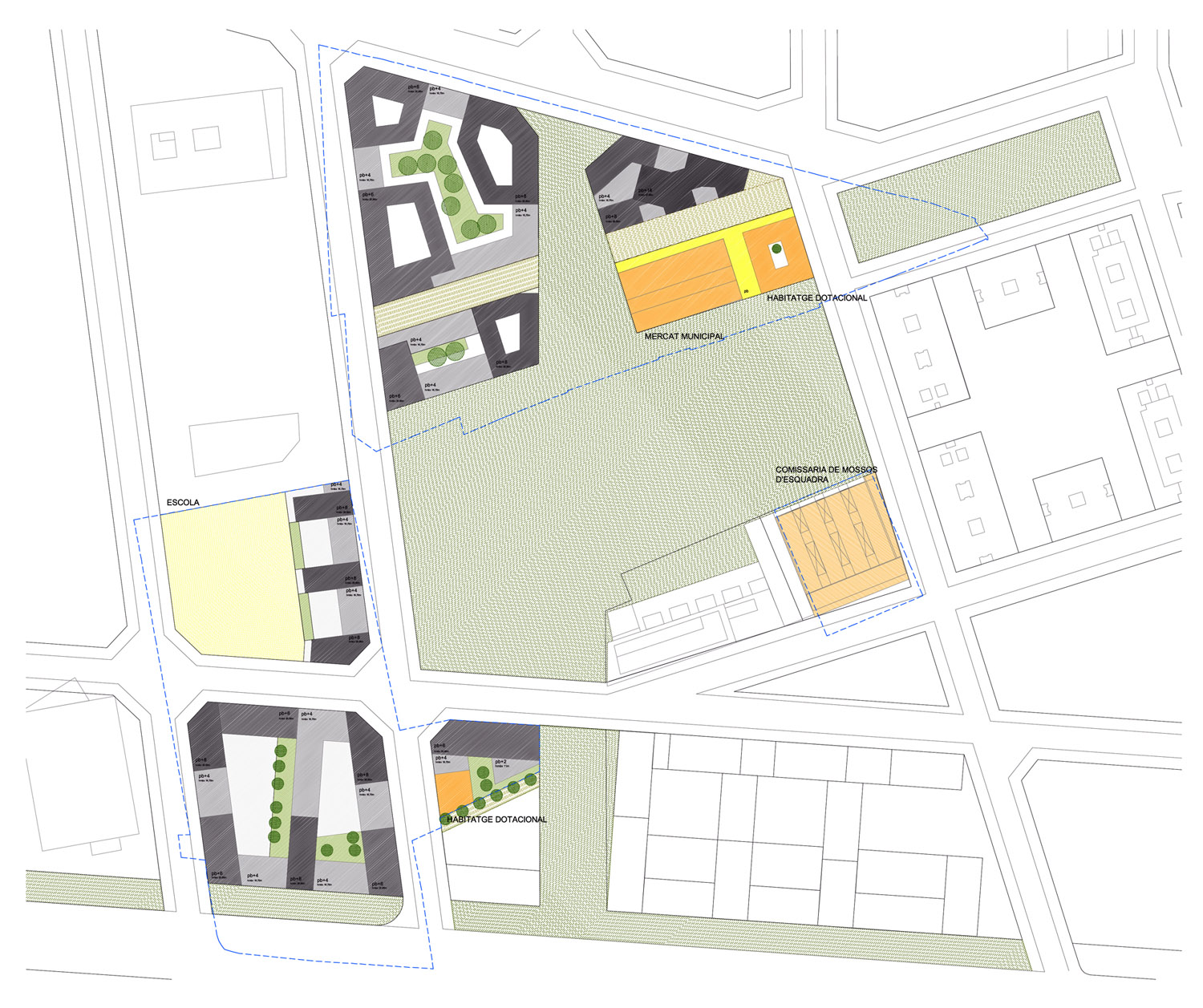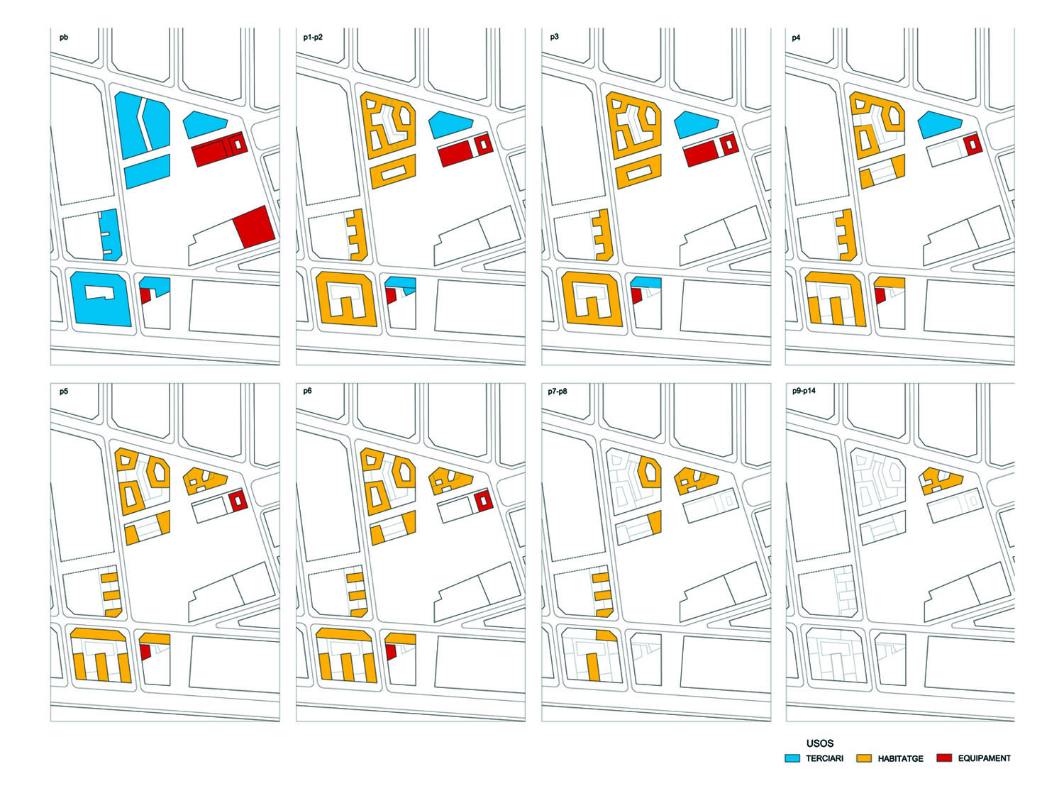 Una vez fijados los elementos comunes para todo el sector, cada manzana adquiere personalidad propia, básicamente a partir de la ordenación en altura y también debido a la introducción de algunos nuevos viales en el área más cercana a los equipamientos entorno a la antigua Fábrica del Prat Vermell, conservada como equipamiento, posiblemente de mercado de barrio. La mezcla de usos y la variedad en la oferta tipológica debe garantizar la complejidad y vitalidad del nuevo barrio. Las plantas altas, más iluminadas y ventiladas, son para la vivienda, mientras que las plantas bajas cercanas a la calle se reservan para uso terciario.