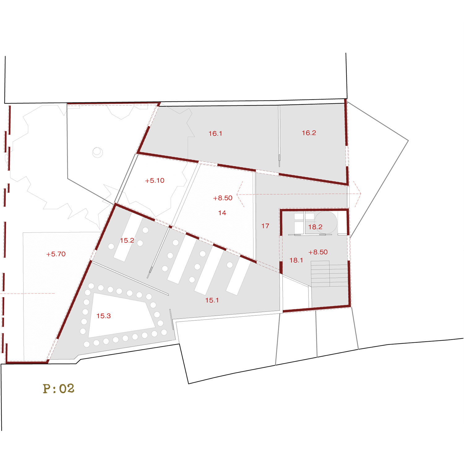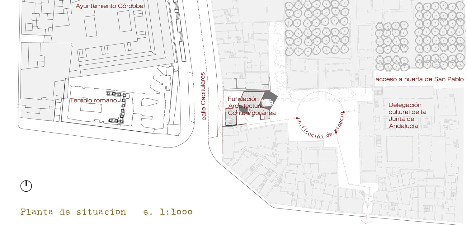 Uno de estos solares inconclusos, el que alberga la futura fundación objeto de este concurso, se sitúa frente al Ayuntamiento de la ciudad junto a los resto de un templo romano. El edificio propuesto pretende ser un telón de fondo al templo romano y dar continuidad urbana a la calle Capitulares. Para conjugar ambas intenciones, la de dar un telón de fondo continuo y concebir el edificio como un paso a la huerta de San Pablo se propone una fachada permeable que al igual que el pórtico de columnas del templo marque la entrada a lo que luego acontece. Una entrada que permite ver el cuerpo del edificio en un espacio dilatado, que en el caso de la fundación será un patio con la presencia dominante del árbol que en la actualidad ocupa la parcela. Un patio al que se abren todos los espacios expositivos y más públicos del proyecto, que continúa su recorrido por un tramo cubierto por el resto del programa de la fundación, para luego abrirse otra vez y conectarse con el acceso a la Delegación Provincial de Cultura de la Junta de Andalucía y el resto de la huerta. El resto de intervenciones dentro de la manzana de San Pablo tratan de sanear el contorno que lo limita por ello planteamos un nuevo contorno que regularice su interior, trate medianeras excesivamente duras, ruinosas o discordantes y ponga en valor los restos del antiguo circo romano que pasaba por su traza, para ello proponemos: