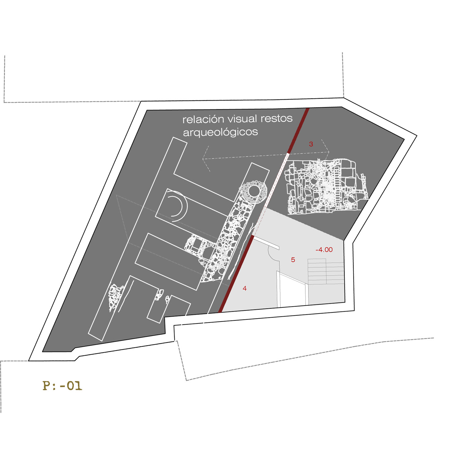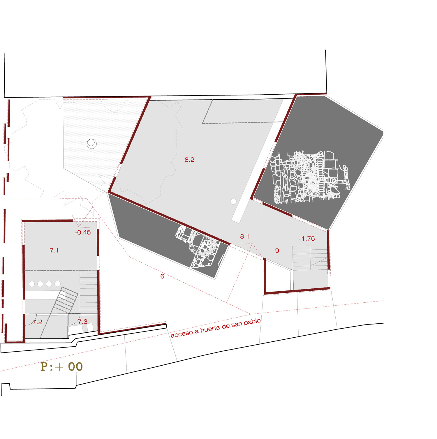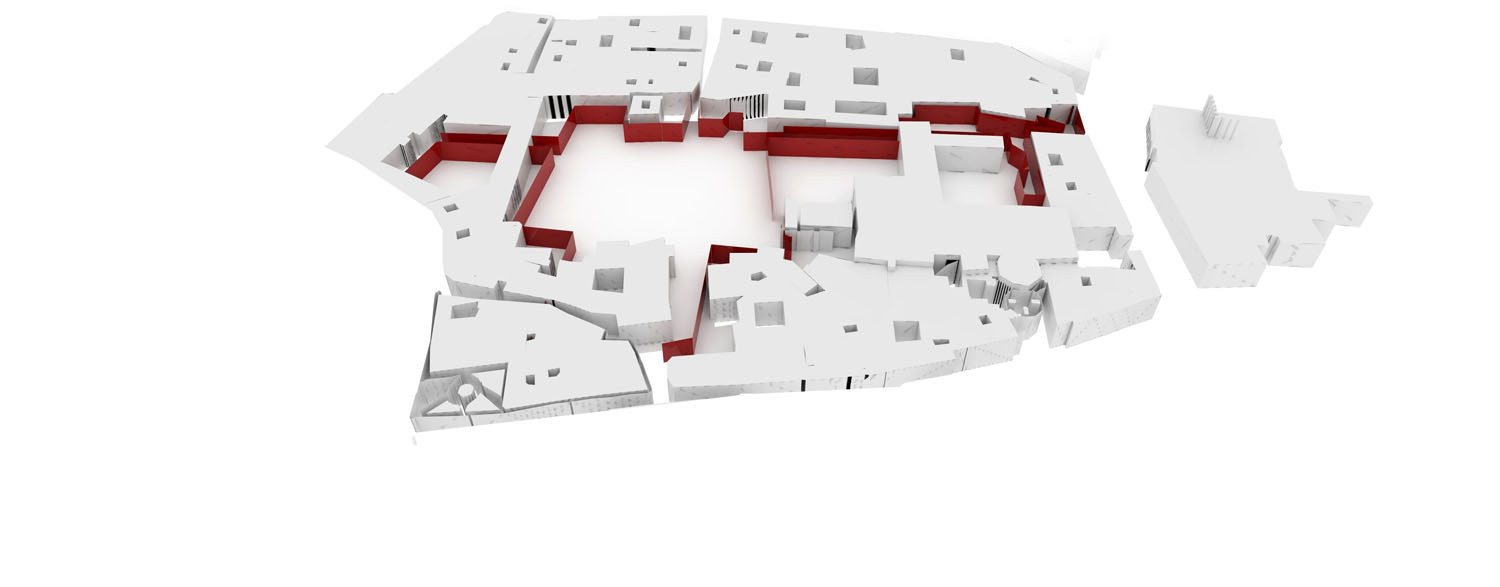 Esta situación existente ha determinado la manera de intervenir, concibiendo la propuesta como un paso a la huerta de San Pablo, construida con los mismo elementos: zaguanes, patios, tramos de calle cubierto… para responder y potenciar de alguna manera al trazado irregular en el que se encuentra. De esta manera la fundación de Córdoba crea una calle interior que desemboca en la plaza de San Pablo constituyéndose como puerta de acceso a las instituciones culturales que alberga. La manzana de San Pablo se configura como un límite irregular constreñido por la edificación que lo rodea, ese interior se escapa por la presencia de tres espacios inconclusos que forman parte del contenido de esta propuesta. Estos tres solares constituyen a su vez puntos de entrada al interior de la manzana de San Pablo. Para lograr la contención de este espacio se propone un nuevo límite que unifique, englobe y encierre la huerta, conteniendo los programas propuestos en el espacio que se crea entre el límite actual y el propuesto. Con esta intervención pretendemos no sólo dotar a la manzana de nuevos usos (fundación de arquitectura, espacio para pequeñas exposiciones efímeras y parking público) sino unificar el interior de la manzana (mobiliario, tratamiento de medianeras y límites), descubrir y poner en valor los restos arqueológicos existentes en ella y propiciar nuevos usos para el descanso y disfrute de los cordobeses.