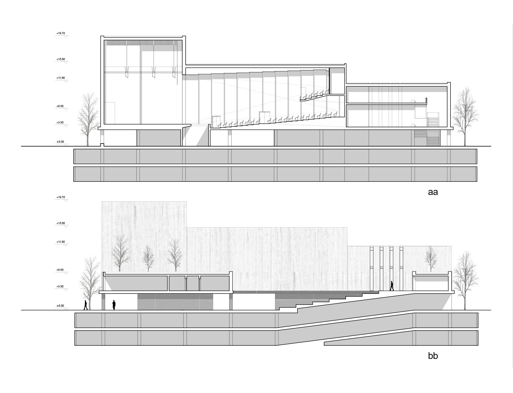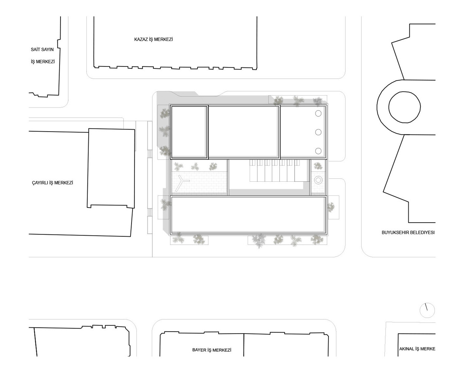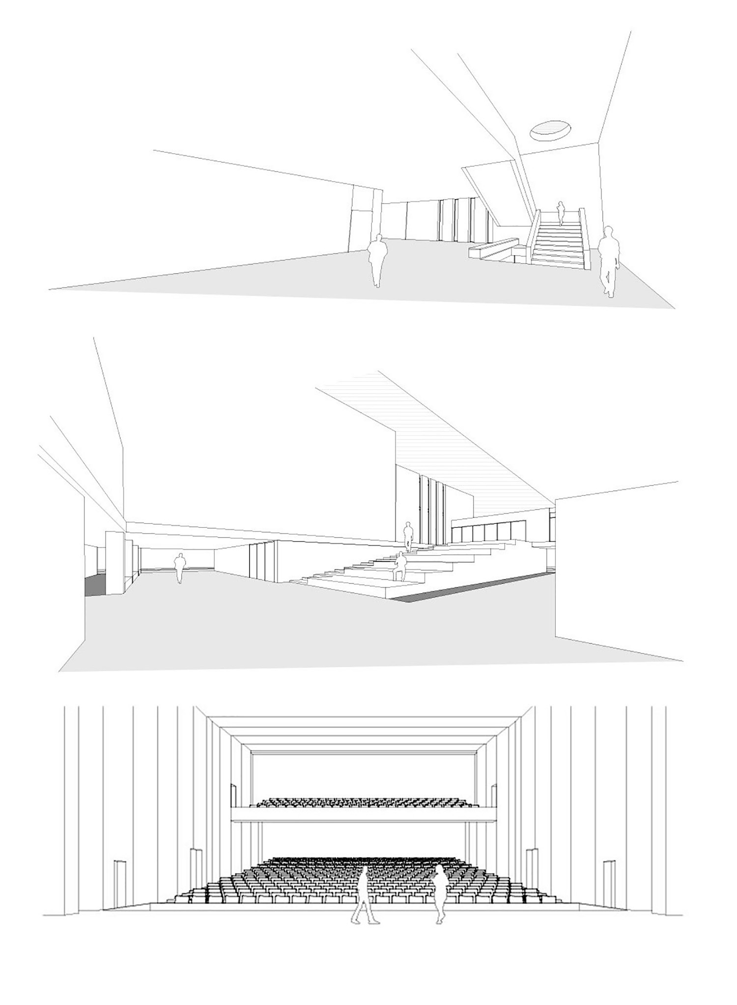 It is requested to design an art center on top of an existing underground parking structure that is accessed by an entrance tunnel at the south. The site is placed next to the municipality building of Gaziantep and within a commercial area. The design proposes to adapt itself to the existing underground by keeping the entrance ramp and continuity of structural system. Considering densely populated urban site, the design aims to offer maximum publicity and accessibility on ground level, which is achieved by creating shortcut passages, which lead to the boundries. To strengthen the publicity, the cafe and the exhibition hall designed transparently on this level. Public benches, which are attached to the structural system, contribute urban life by offering recreational areas. The hot climate of Gaziantep is considered by designing such shady spaces at ground level and maximum solid surfaces at upper levels. The shelter of parking entrance is used as amphitheater steps, which leads the foyer of the main hall. The volumes of the building designed harmonically following the building’s program.