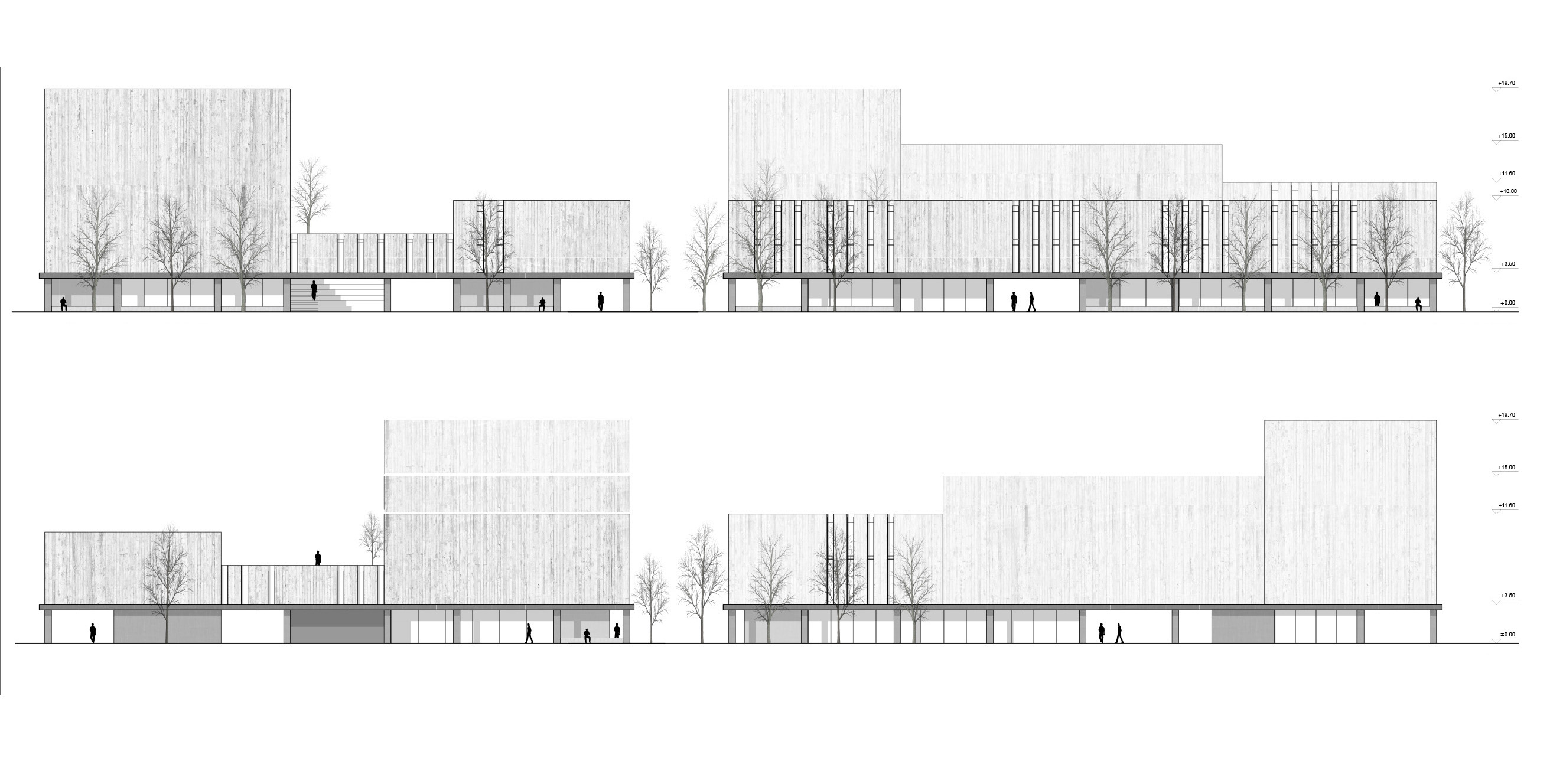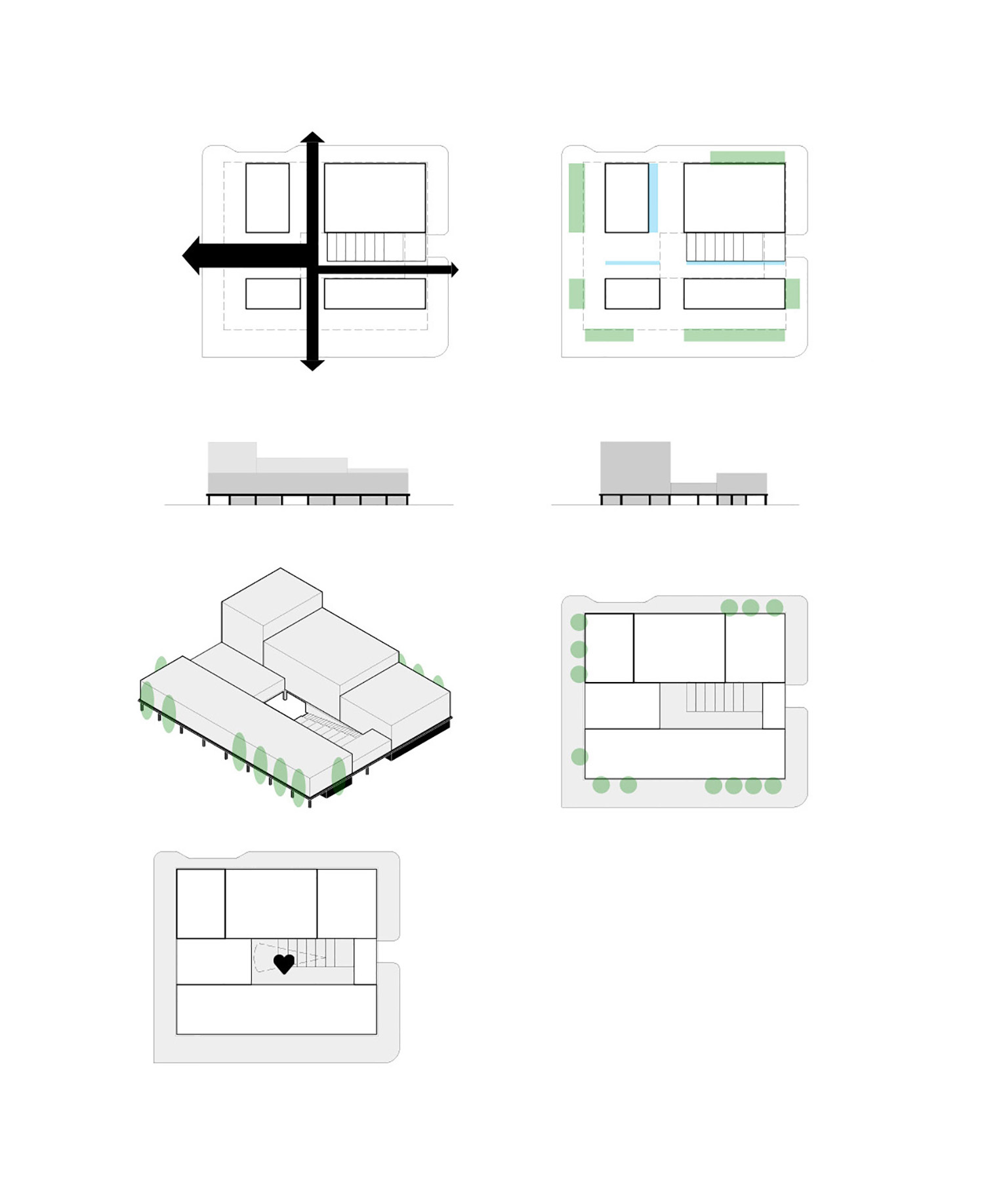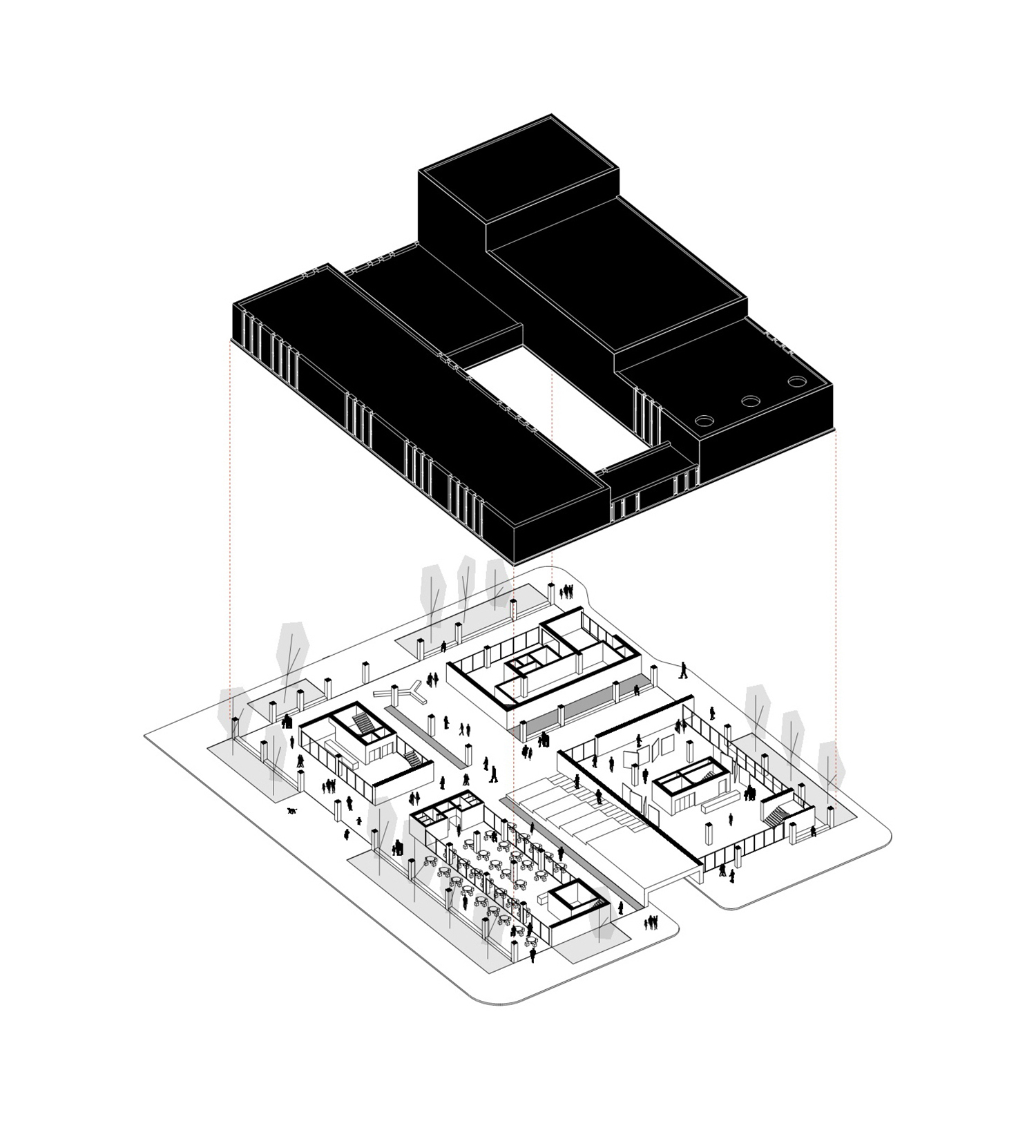 It is requested to design an art center on top of an existing underground parking structure that is accessed by an entrance tunnel at the south. The site is placed next to the municipality building of Gaziantep and within a commercial area. The design proposes to adapt itself to the existing underground by keeping the entrance ramp and continuity of structural system. Considering densely populated urban site, the design aims to offer maximum publicity and accessibility on ground level, which is achieved by creating shortcut passages, which lead to the boundries. To strengthen the publicity, the cafe and the exhibition hall designed transparently on this level. Public benches, which are attached to the structural system, contribute urban life by offering recreational areas. The hot climate of Gaziantep is considered by designing such shady spaces at ground level and maximum solid surfaces at upper levels. The shelter of parking entrance is used as amphitheater steps, which leads the foyer of the main hall. The volumes of the building designed harmonically following the building’s program.
