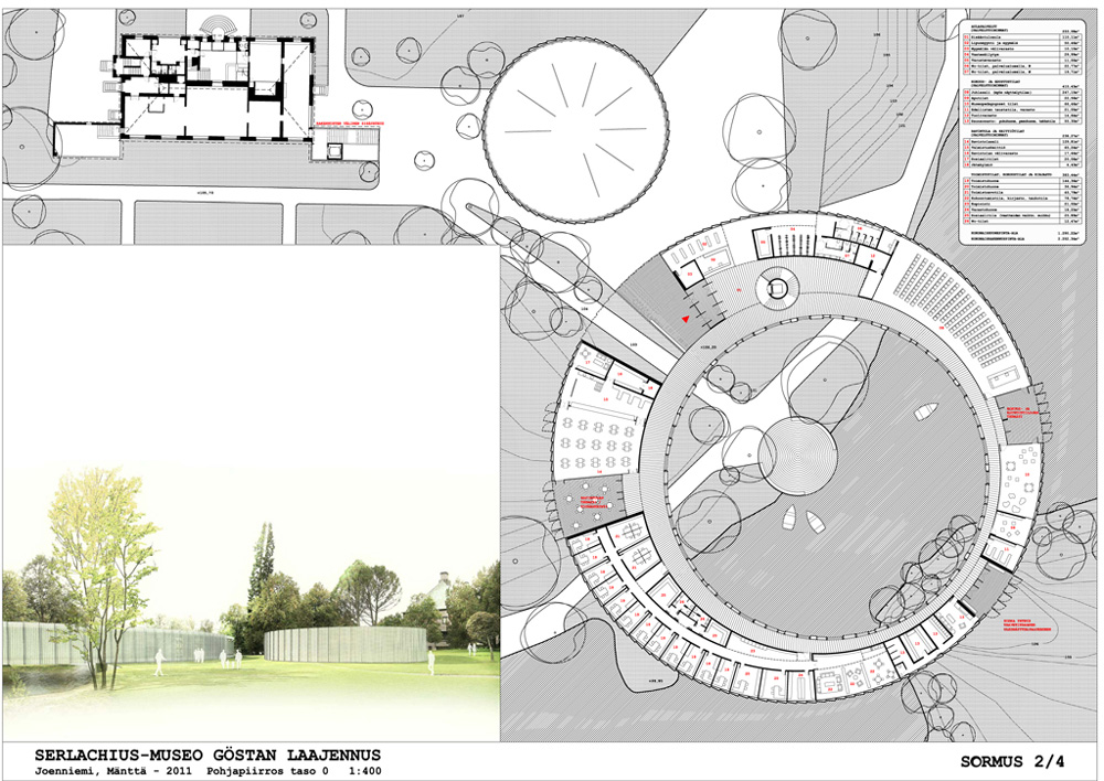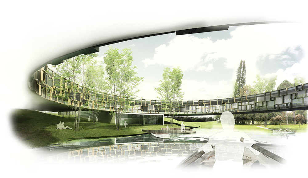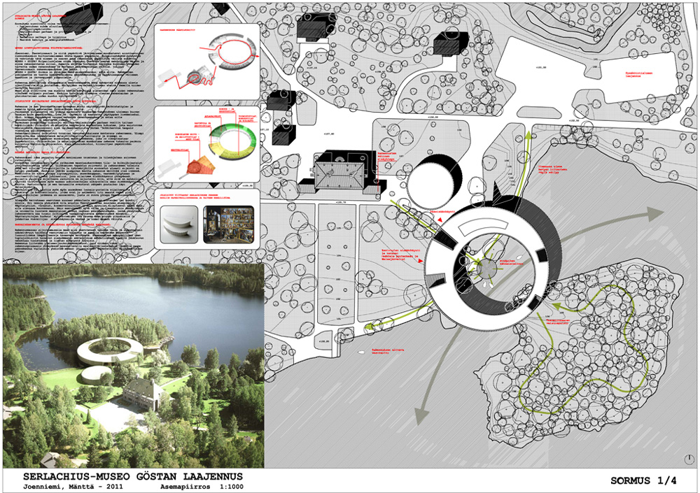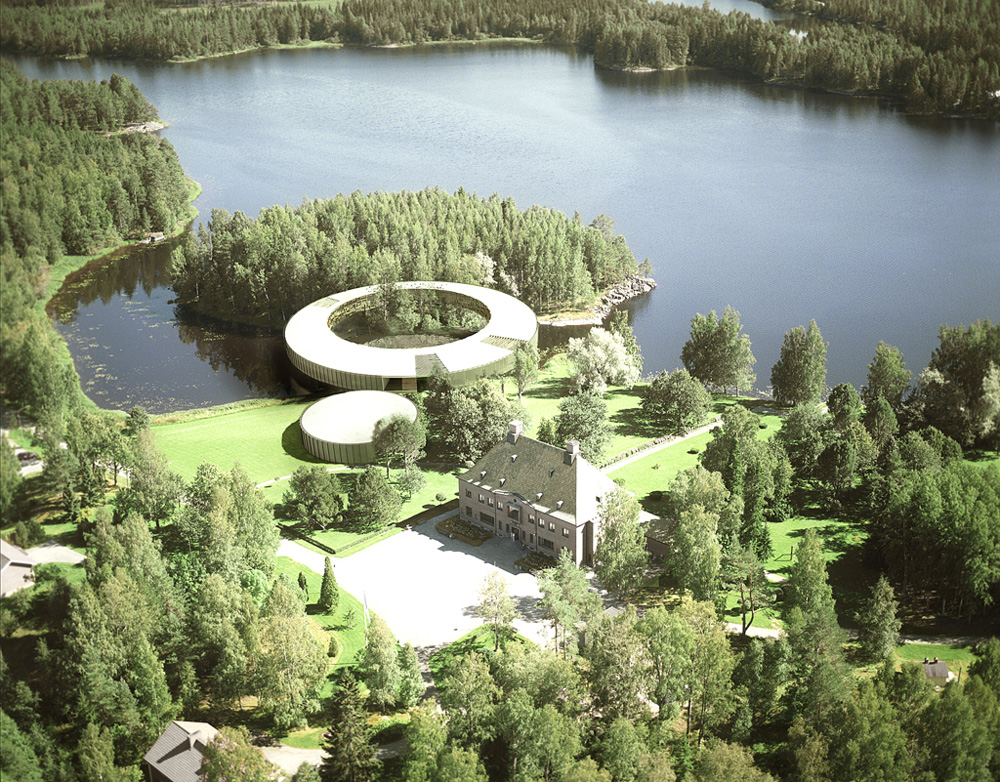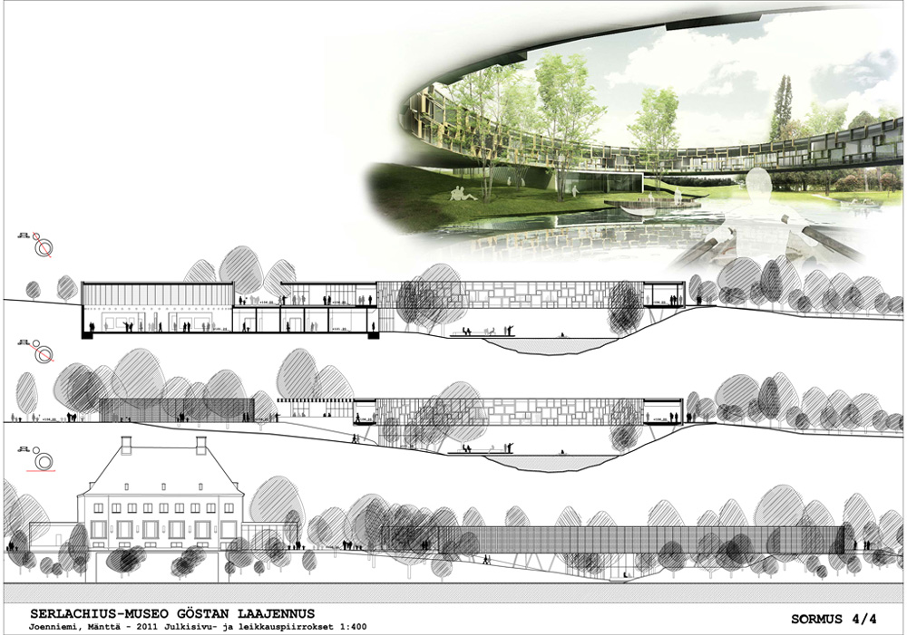 El edificio se plantea simplificando la respuesta a la pregunta que plantea el programa: en lugar de un edificio + un puente, la propuesta plantea un edificio que es un puente. Este echo determina el punto de partida, proponiendo una parte del edificio en forma de anillo, dispuesto delicadamente sobre el terreno, ligeramente levantado y pasando por encima del agua para apoyar, con la misma delicadeza, sobre Taavetinsaari. El edificio no toca el terreno, lo respeta con delicadeza, dejando circular por debajo de él y a través de él, sin cortar los caminos y los paseos actualmente existentes en los jardines de Gösta. El resto del edificio, situado en planta sótano, desaparece visualmente al quedar totalmente enterrado bajo el jardín, restituyendo el terreno tal como es actualmente y reduciendo el impacto visual del nuevo edificio a la mitad de su volumen.