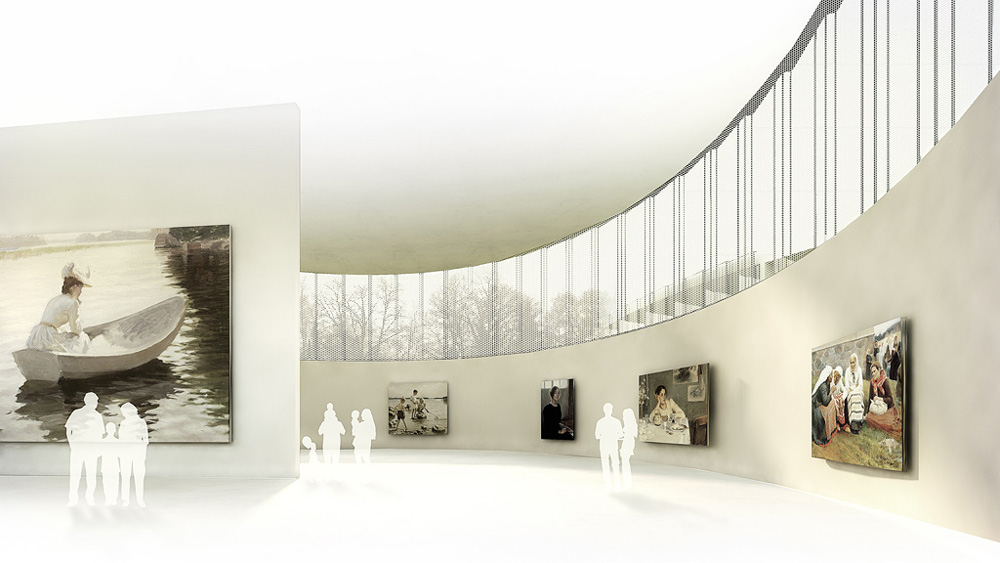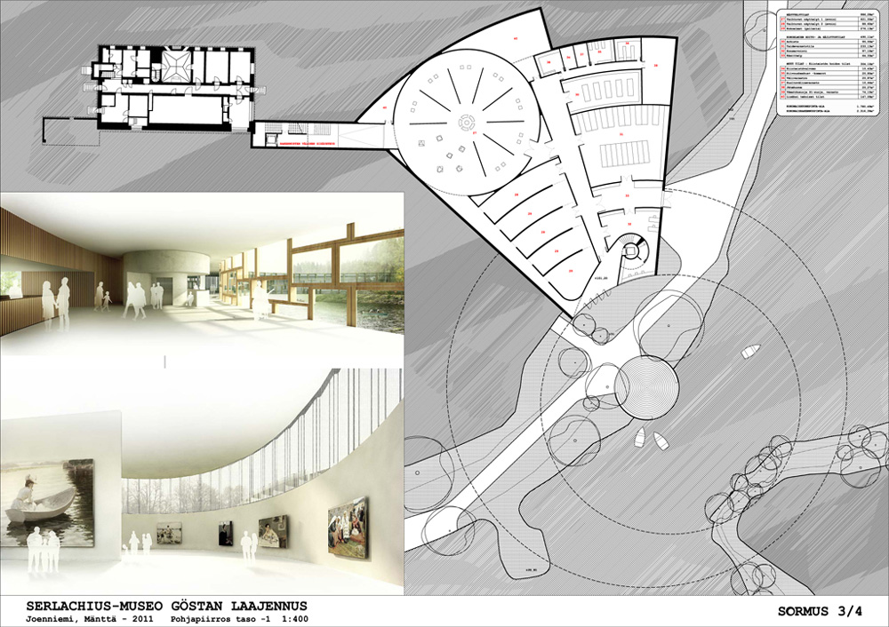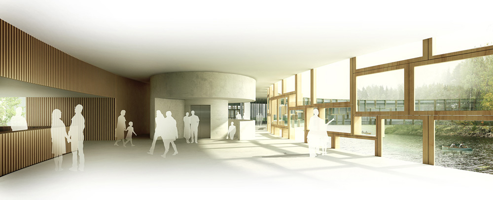 ☉ Serlachius Museum Gösta is a proposal by Anna & Eugeni Bach for Serlachius Fine Arts Foundation designed in 2011. It is located in Mänttä Finland in a lake setting. Its scale is medium with a surface of 4.570 sqm. Key materials are concrete glass and wood. Play-Time collaborated as visualizer. Concepts such as circle shape void lattice levitation and nature are explored. Review the 16 proposals for the same competition.