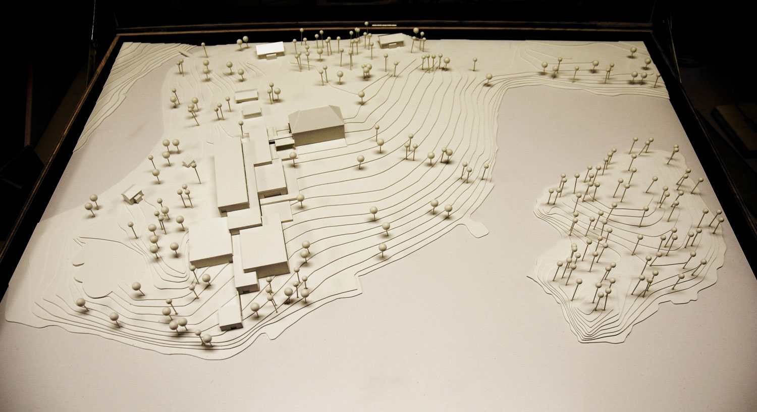 The basic concept for the museum extension consists of several interlocking volumes of different sizes, cascading down the slope in such a fashion as to enhance the perspective on the lake from the Manor building. The volumes design focuses on the windows which have different dimensions and positions. These are both windows into the activity of the museum and out to the panoramic vistas of the environment. In this way it will be possible to experience from within the diversity of the surrounding nature, while at the same time optimizing the limited footprint of the extension as defined by trees, gardens and terraces.