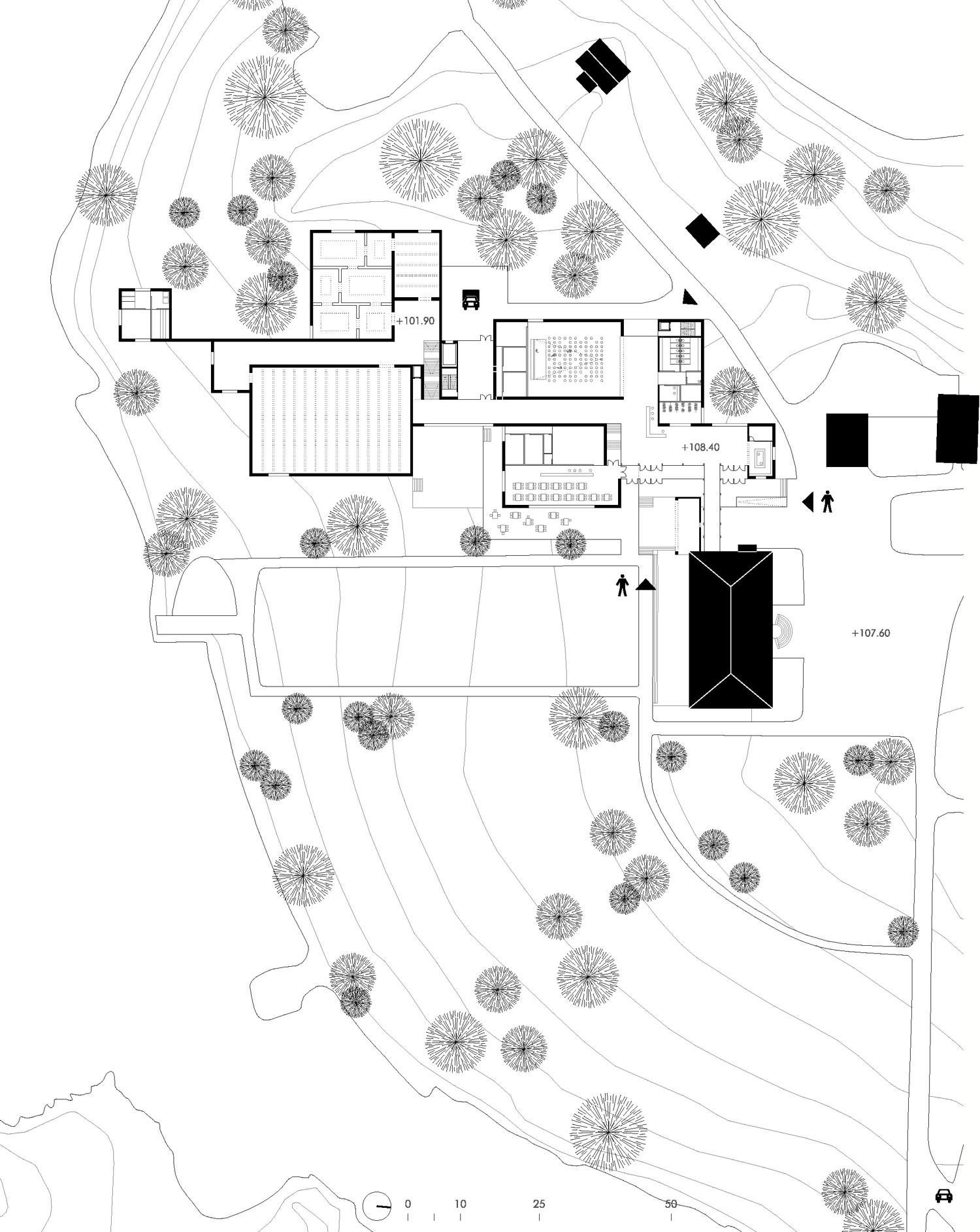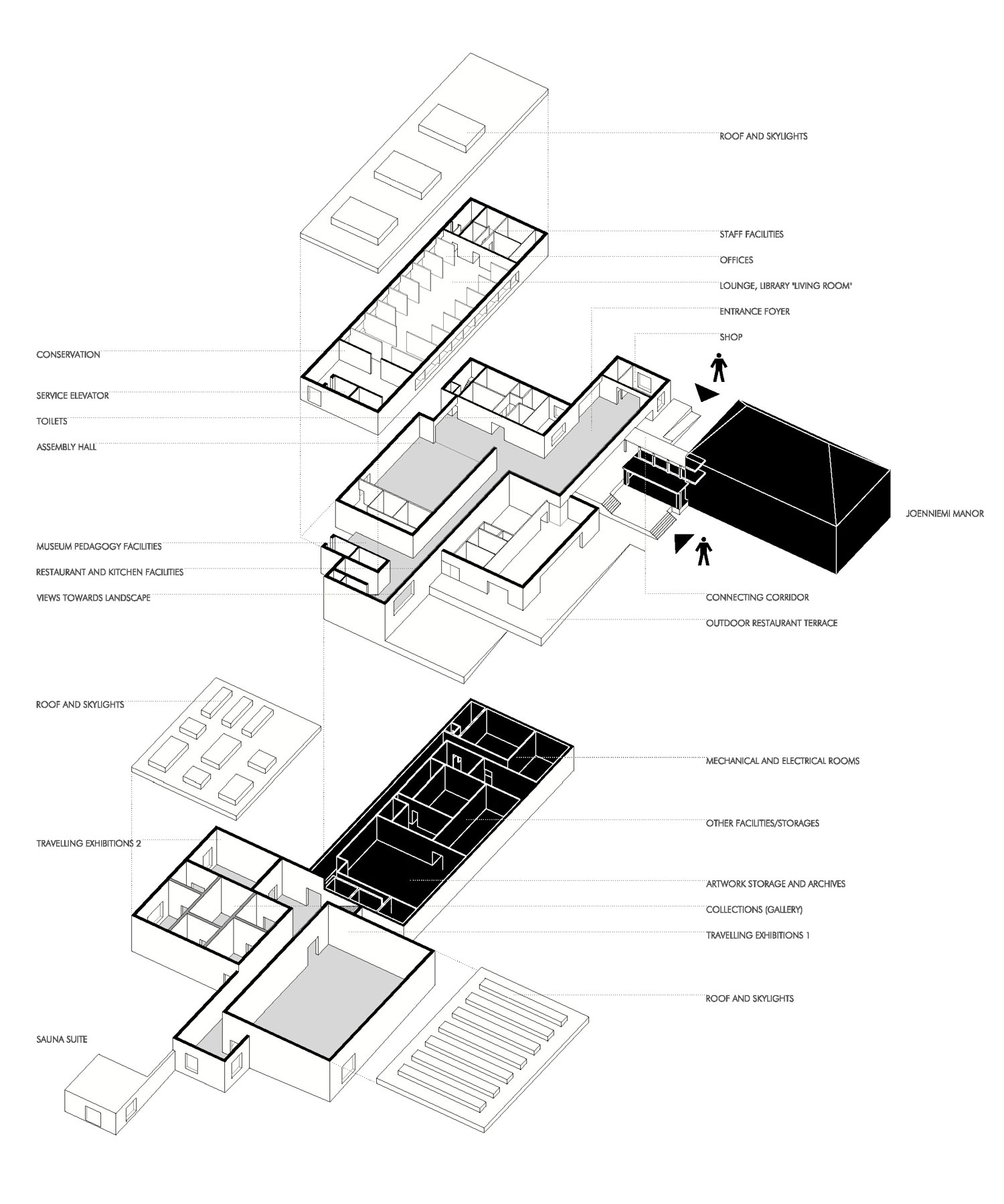 The design creates a link to the main floor of the Manor Building at the entrance level, with the aim to provide it with a double access. A new open outdoor staircase and ramp lead the visitor from the main façade of the Manor building to a terrace, a generous entrance providing the main access point to the extension. Another staircase in turn connects this terrace with the path surrounding the manor building, with its spectacular views of the landscape. The visitor is ushered in and received in a generous hall that corresponds to the Manor’s ground exhibition floor, with the connecting corridor between buildings embedded in the terraces. The extension’s ground floor accommodates such services as the shop, information point, toilets, cloakroom, Museum pedagogy facilities, and an assembly Hall that can also be used as exhibition space. Spaces for both permanent collection and travelling exhibitions are located in the lower floor, which connects to the art depots. The upper floor contains the remaining museum functions: offices, administration, as well as conservation spaces that require natural northern light. Finally, the restaurant and sauna are located in intermediate floors connected to the gardens trough public terraces, luminous resting places that offer views towards the lake.