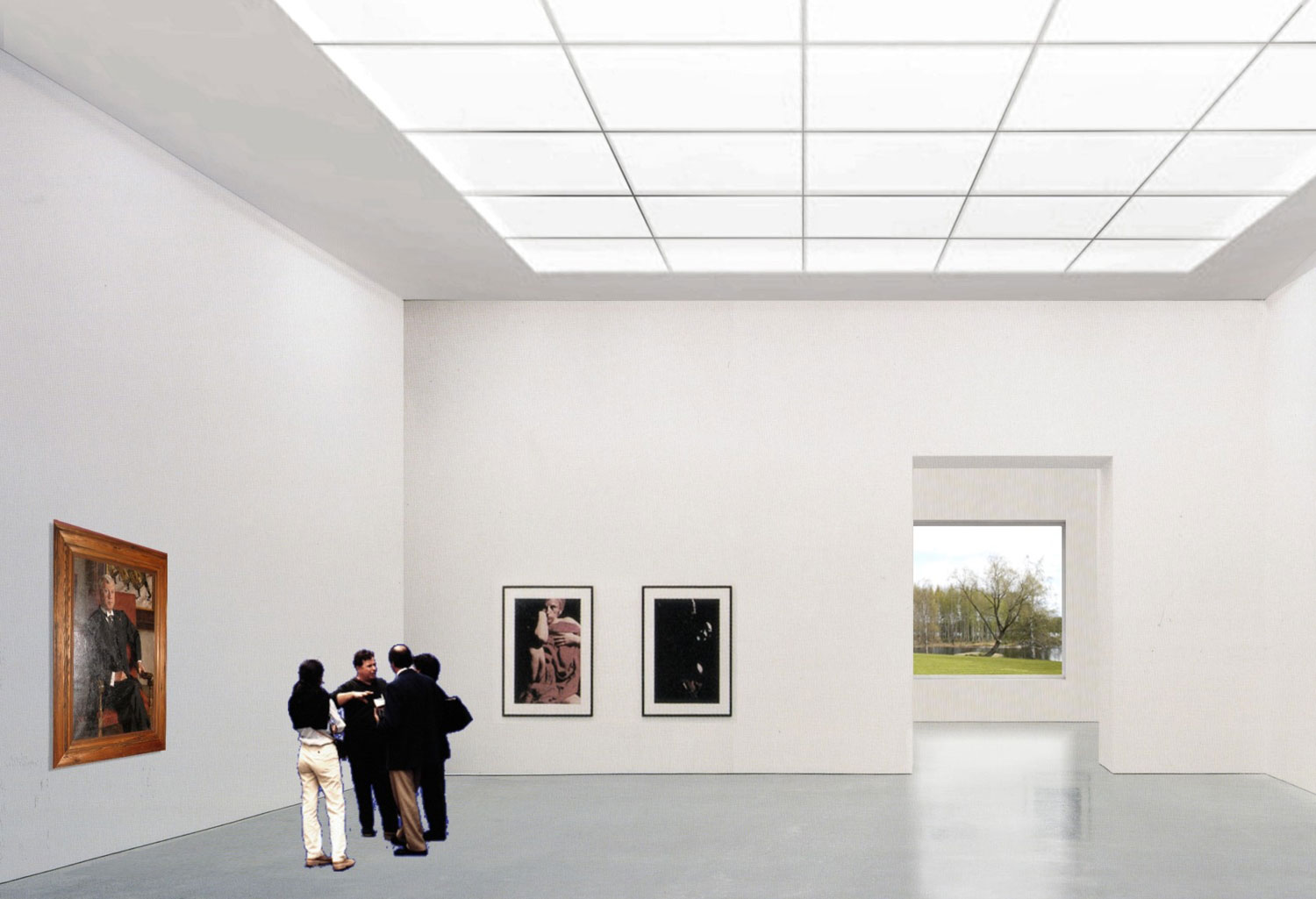 All the galleries are at least five metres high, with some significantly higher, like the one for travelling exhibition 1 which rises up to nine metres. The spatial variety between exhibition facilities is considerable. Almost all the rooms are different in size and proportions. In addition, temporary walls can be added or removed at certain places, allowing dimensions and scale to be adjusted for special installations. Lighting -a decisive factor in the perception of art- alternates in every room between daylight, artificial illumination and a mixture of both. Embracing the northern horizontal light peculiar to the city of Mänttä, natural daylight falls directly from above through glass panels placed flush with the ceiling, and it can be supported with artificial light if necessary. Gallery spaces are also lit from different directions depending on the placement and shape of the window openings. This kind of daylight is controlled by adjustable panels that can be tailored to the needs of exhibitions. The aim is to create a series of well-proportioned and well-lit rooms for the display of art, in a building deeply attuned to the historical and landscape values of the site.
