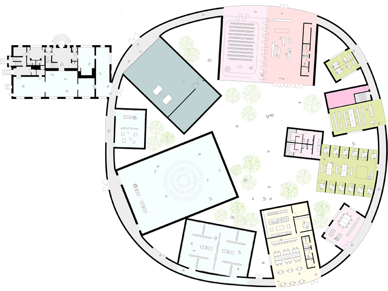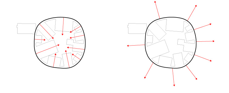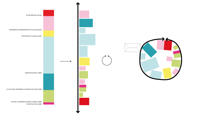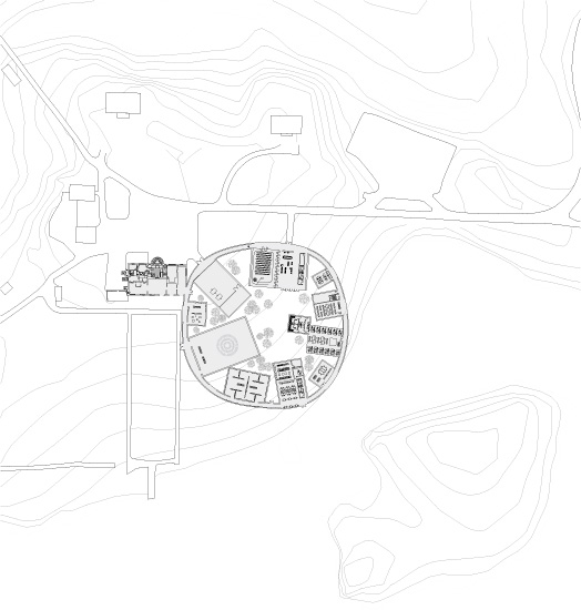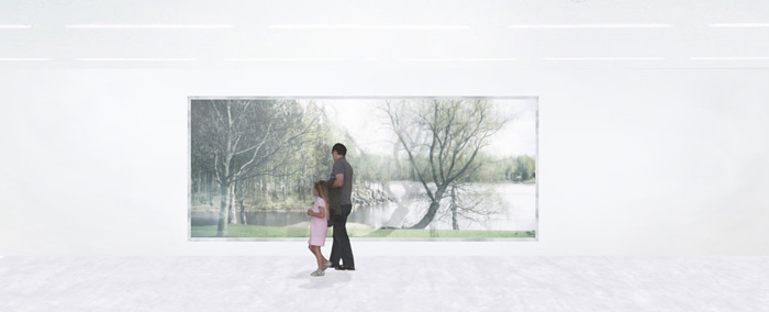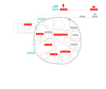 This proposal for the Serlachius Museum Extension in Mänttä, Finland was submitted by XML. The omnipresent landscape provoked the architects to develop a scheme that became a median between the external world of nature and the internal world of art. The required program has been distributed along a continuous route that connects different programmatic clusters such as galleries, storage, restaurant and office. The circulation between these clusters is bent into a circle allowing for two experiential conditions: on the inside of the circle a series of enclosed exhibition spaces allows visitors to focus on the experience of art whereas on the outside of the circle the continuous route that connects the programmatic clusters allows for alternating these intimate experiences with views on the surrounding nature. The irregular residual space between the programmatic boxes is turned into a Gallery Garden, continuing the tradition of landscape architecture that is part of the museum’s history. As a result, the floor area of the Museum is extended during summer, an idea that could reach as far as reconceptualizing the museum’s identity into a twofold ‘Wintermuseum’ and ‘Summermuseum’ that host programs of different types. In contrast to the vastness of the surrounding landscape, this contained garden can be used to exhibit the sculpture collection of the museum but also as event space, accommodating lectures, interview-marathons or outside screenings and art-picnics. As an utopic garden at the heart of the museum, the Gallery Garden could become a platform to experiment with unexpected relations between art and nature.