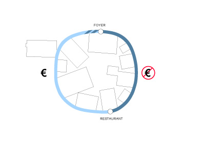 Each of the requested gallery spaces is organized in separate rooms to create a maximum of curatorial freedom. The different galleries could be used together to host one exhibition, but also separated or in arrangements with the existing gallery space in Joenniemi Manor. The art handling and storage facilities are combined in a programmatic cluster near the exhibition spaces for reasons of efficiency. However, this arrangement also allows curators to include the museums archive into exhibitions offering the possibility to experiment with new curatorial models and modes of displaying art. In the same way as the programmatic clusters at the ring’s interior, the existing museum is connected at a single point to the continuous museum route. Like a diamond in a ring of gold, the Joenniemi Manor – as the only architectural volume on the outside of the ring – is re-contextualized as the jewel of the museum’s expansion. Rather than provoking an opposition between nature and art – the continuous museum route is sequencing both conditions to exist in their own right. The continuous route is not only organizing the museums’ programme, but it also mediates between two worlds that ultimately meet in the experience of the museum’s visitor.