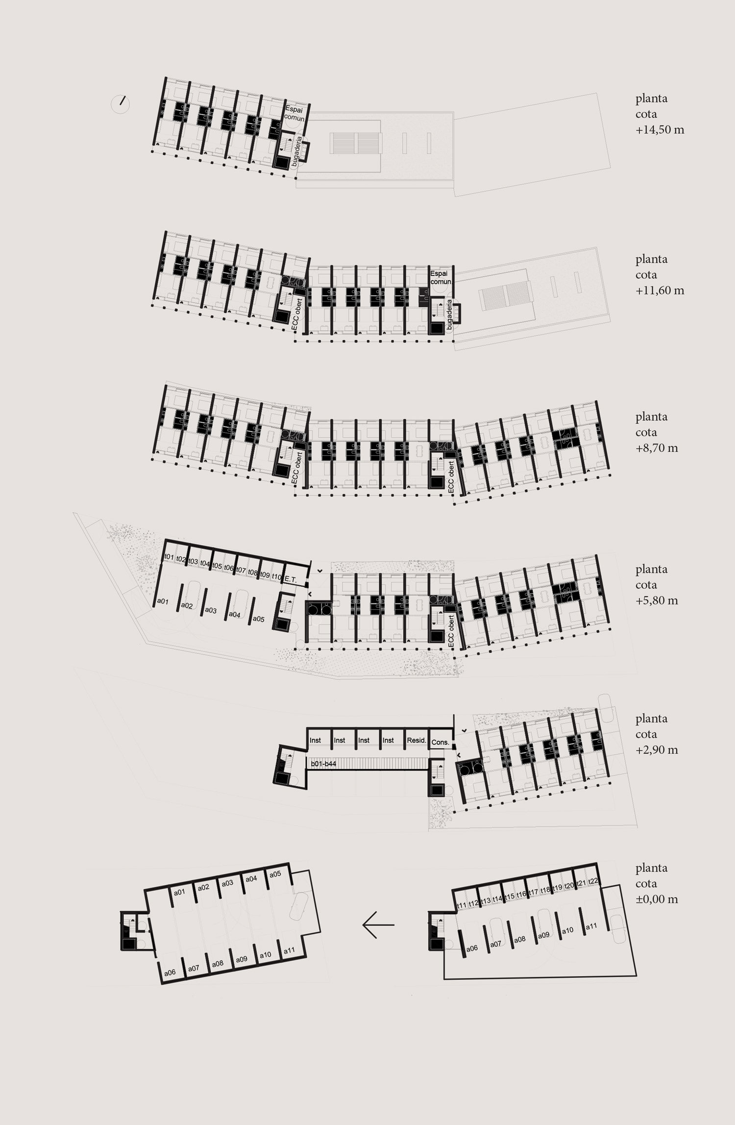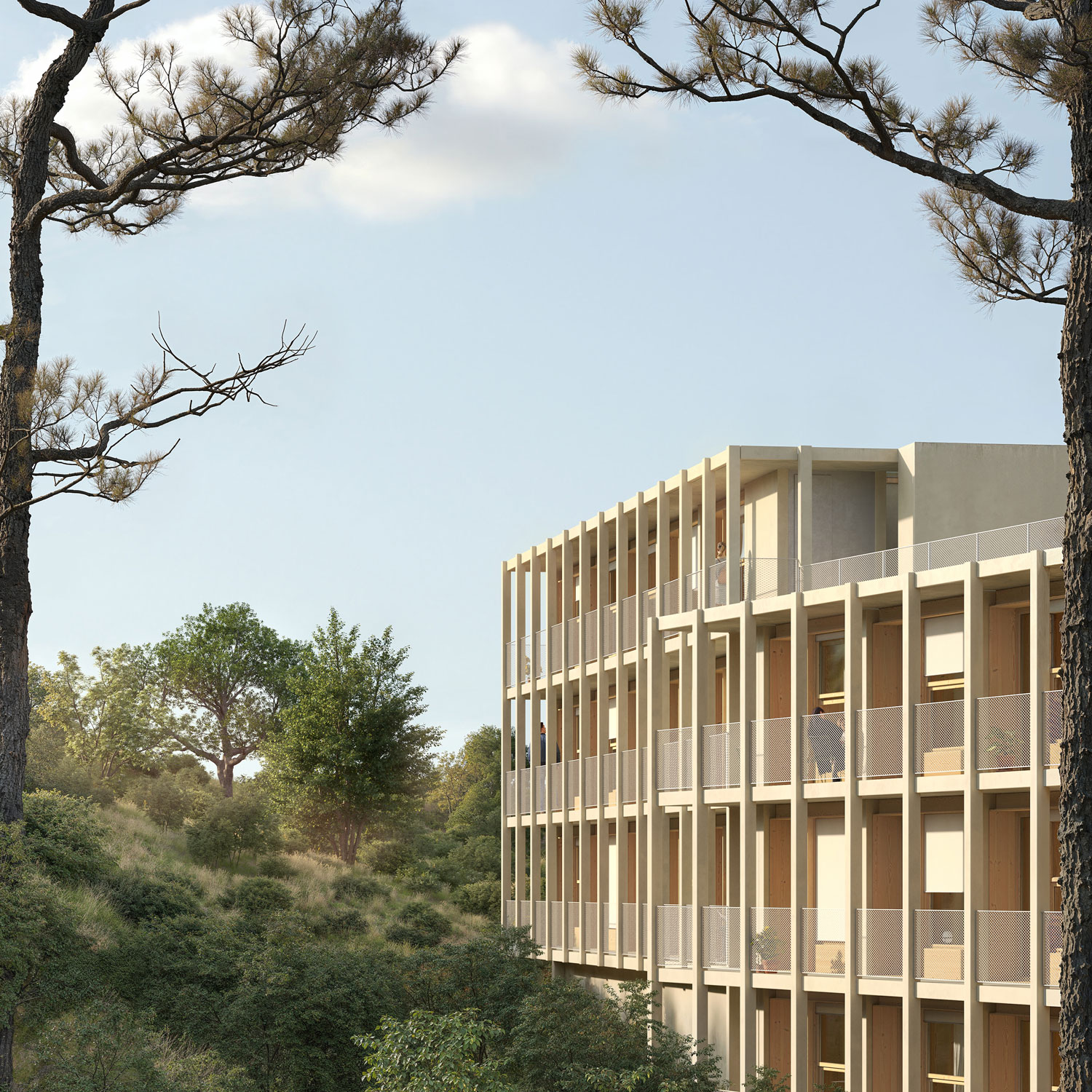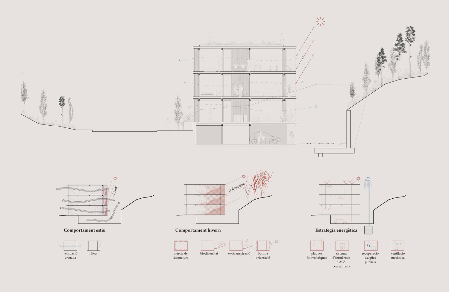 The project proposes the sequence of parallel north-south walls that turn and adapt to the geometry of the site and the topography. The proposal blurs the transition between urbanity and the forest landscape of the site. The north-south orientation is seen as an opportunity. The facades respond differently depending on the orientation. The south builds a large façade able to take the sun in winter and a pleasant brise-soleil in summer expanding the living space towards the exterior. The north, with a predominance of opaque closure, incorporates two exceptions in relation to community rooftops; two shared spaces of flexible use that are located next to the roofs as a threshold between the building and the communal outdoor space.