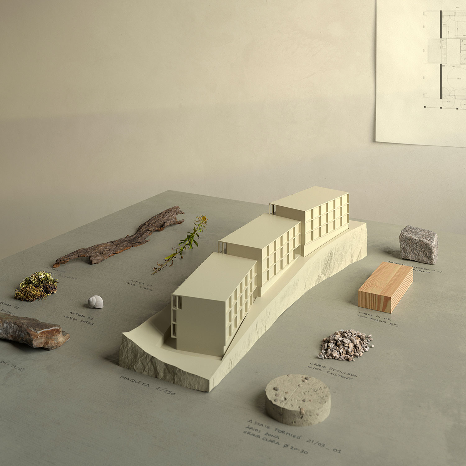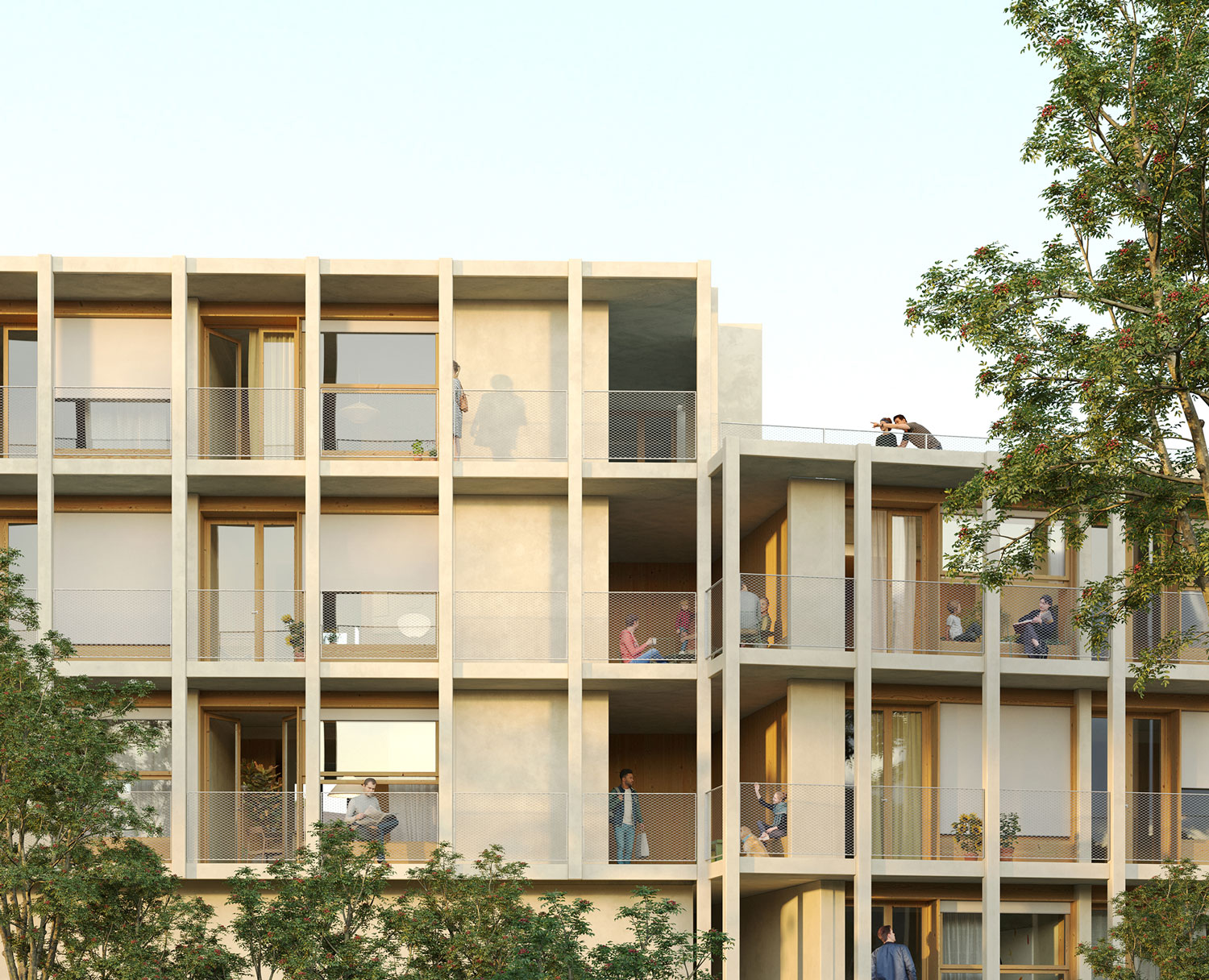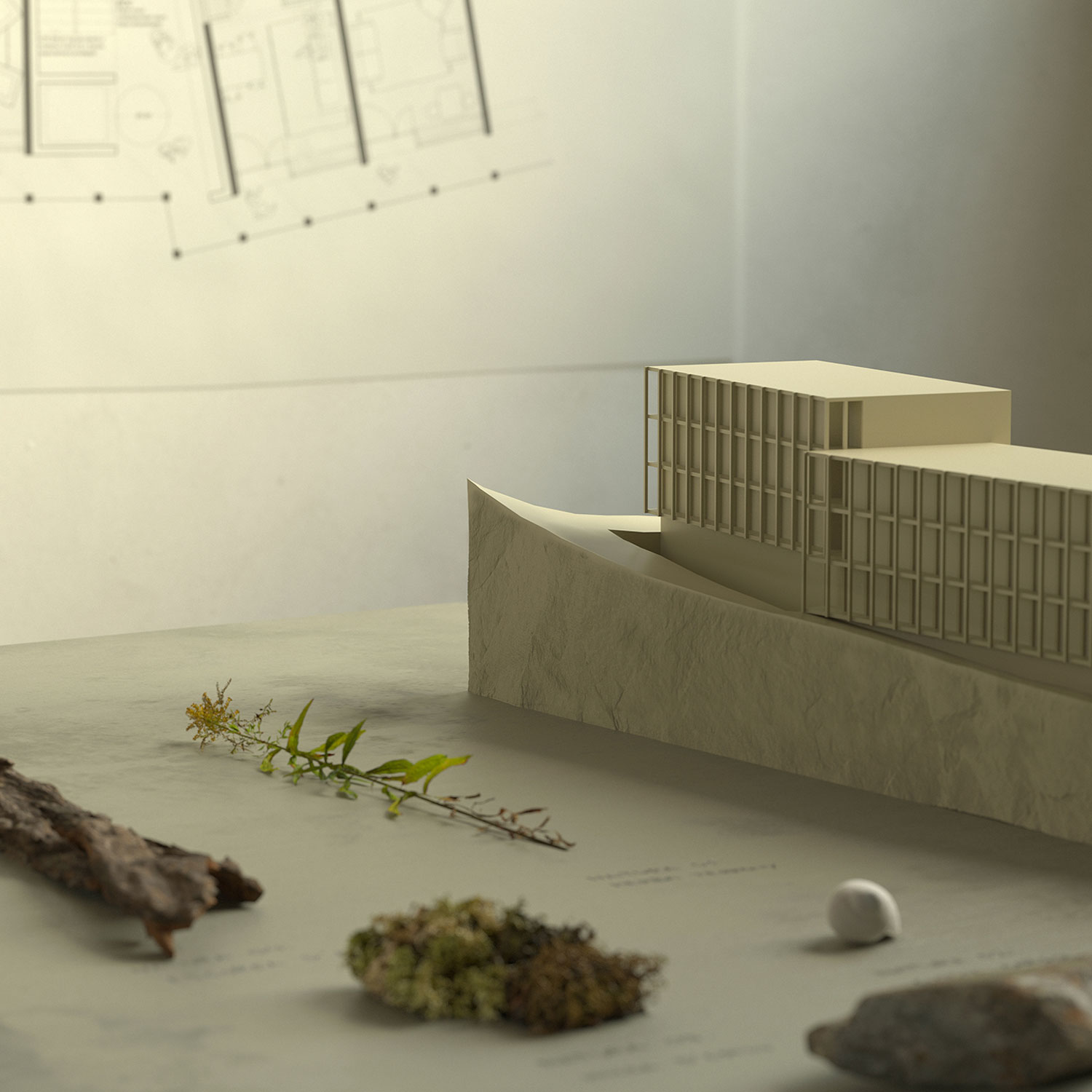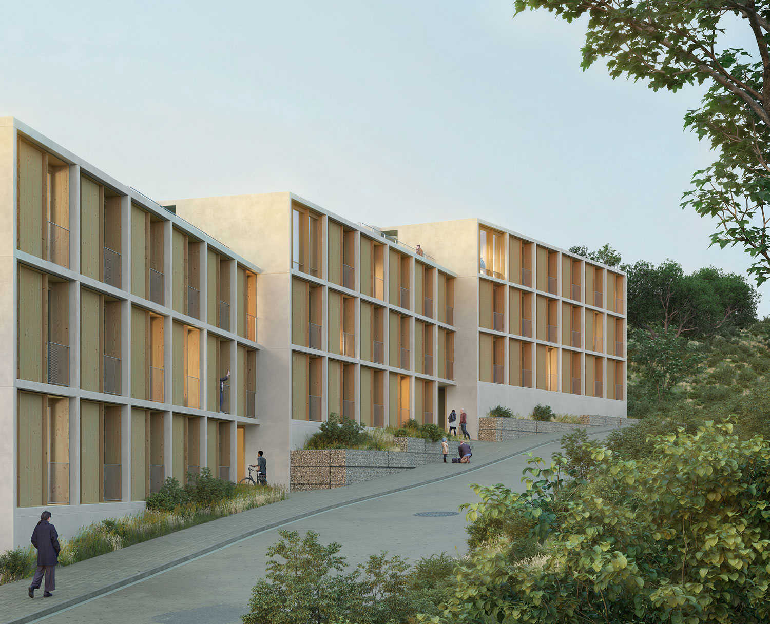 The project proposes the sequence of parallel north-south walls that turn and adapt to the geometry of the site and the topography. The proposal blurs the transition between urbanity and the forest landscape of the site. The north-south orientation is seen as an opportunity. The facades respond differently depending on the orientation. The south builds a large façade able to take the sun in winter and a pleasant brise-soleil in summer expanding the living space towards the exterior. The north, with a predominance of opaque closure, incorporates two exceptions in relation to community rooftops; two shared spaces of flexible use that are located next to the roofs as a threshold between the building and the communal outdoor space.