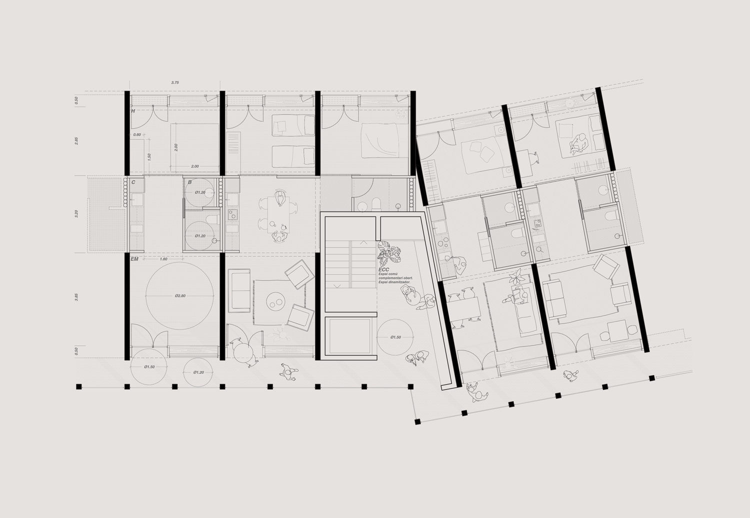 Housing units are born from repetition, being a simple but very flexible typological set. Those units are facing two façaces and are accessible through a footbridge located on the south side; acting first as a filter and also as a semi-private exterior space. The directionality of the structure improves crossed ventilation.