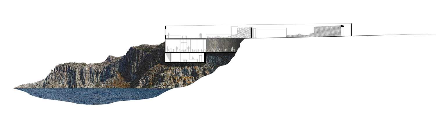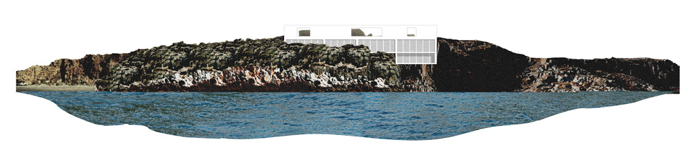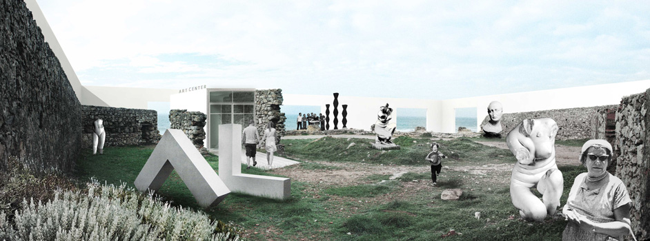 By these openings it is possible to walk and pass from “room” to “room” sometimes approaching the enclosing walls to appreciate their materiality, sometimes moving away to appreciate their general form.The ruins are subtlety discovered by these successive approaches and the visitor end up penetrating in the center of the site, finally being able to apprehend the ruins in their globality. The heart of the enclosures, separated from the external environment, accommodates the garden of the sculptures and makes it possible for the visitor to peacefully saunter and admire the various pieces of Art and progress at its rhythm to the view-point, vis-a-vis the sea. The project, with its simple shape underline the existing and reactivate its intrinsic characteristics. By this architectural will, we chose to position the Artcenter inserted underneath the gournd level lined with cliffs. The entry fits through the passage between the remains of the two refitted massive walls. The going down is then led trough an underground circulation which emerges in full light straight to the seafront, creating a positive and surprising effect. This access process? plunges the visitor in a voluntary darkness. In order to dissociate the existing site (the garden) and the new project, the staircases create a strong physical rupture, expressing the passage between old and new. The building is literally clinging to the cliffside. This feeling is also traduced in the project by an entirely glazed facade open to the sea along which the gallery is arranged. This façade is contrasting with the blind walls along the cliffs.