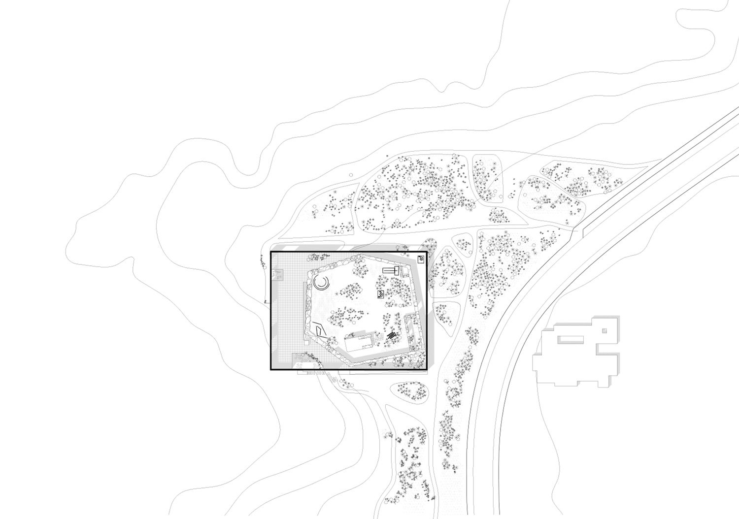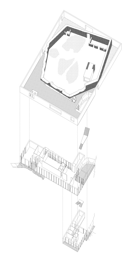 The project is defined by a radical construction of a new enclosure surrounding those existing. This strong and conscious gesture results from the advanced state of degradation of the Cresmina’s ruins, which are merging with the landscape to their almost total obliteration. In contrary, we consequently wanted to emphasize these ruins, to make them visible. Through this will, we chose to reinterpret the traditional vocabulary of the fortress: a massive and imposing construction which paradoxically aims in hiding the interior to protect it. The new enclosure is formalized by white walls, thin and smooth wich totally contrast with the rough materiality and massiveness of the existing walls. At first glance, the new enclosure is extremely visible as detached from the landscape with its new abstract walls. The walls take shape in a sharp and simple rectangular parallelepiped oriented towards the sea. Deliberately, it is not aligned with the existing enclosing walls, thus creating «anti-chambres» in the residual interstices between new and old walls. The new walls are pierced with large open frame, offering selected sights on the landscape.