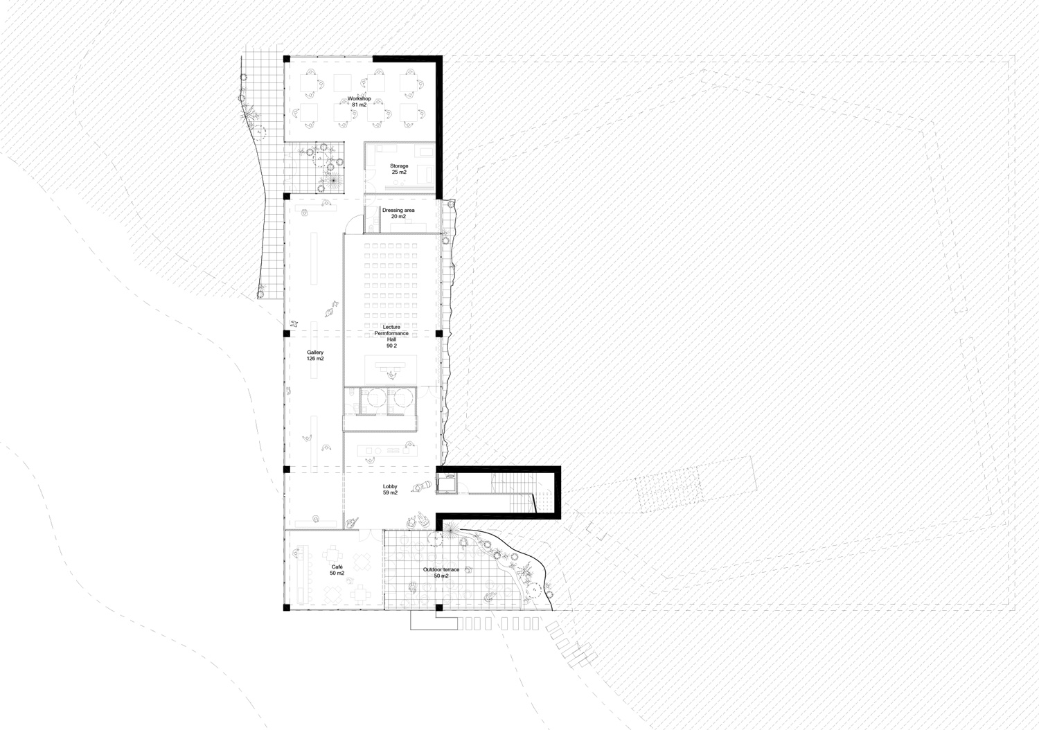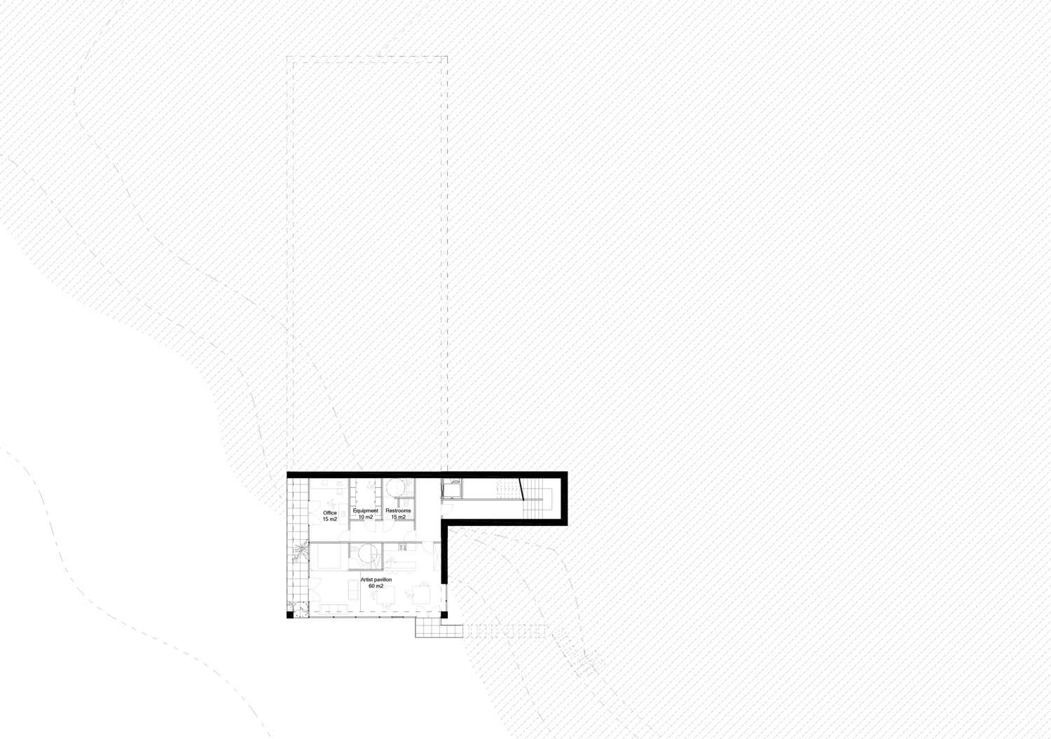 In the same way, the coffee, the reading room and the workshop maintain a close relationship with these cliffs. The creation of patios dug into the rock and in direct contact with these spaces, reinforces the physical link with this strong context. Besides allowing natural light inflows, they offer a single space experiment with the topography of the site. The workshop of the artist and the offices of the administration are at lower level, below principal stage of the center. Linked by the interior staircase and the elevator, the administrative team is connected directly in the middle of the program, enjoying a balcony largely open on the sea. Artist benefits an independant entry to his apartment and his workplace. The staircase is designed as a romantic pathway well inserted to the landscape.