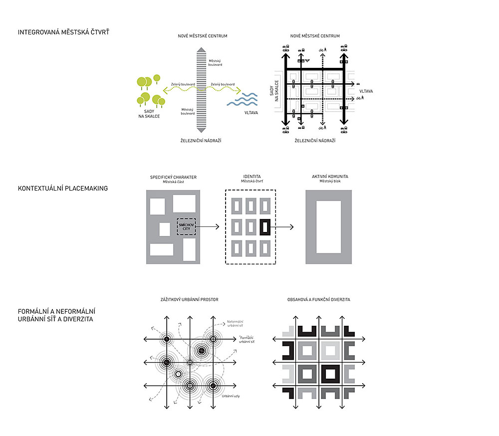 The invited competition sought ideas to develop an 8ha site on the left bank of the River Vltava, which is to become a modern residential and administrative centre. Smíchov is one of the fastest growing areas in inner city Prague with history dating back to the 13th Century. In spite of its historical fragmentation, the neighbourhood has a unique character and a heterogeneous nature both in the social and architectural sense. Our urban vision for the new development is based on this specific character of Smíchov. The quarter is formed by several parts, each with its own identity and unique atmosphere. The new development will form a unique addition to this neighbourhood giving impulse to a positive regeneration and integration of the whole quarter. The parameters for this future development are based on progressive establishment of a new community of users, directly linked to the spatial structure of integrated and visually distinct new city blocks.