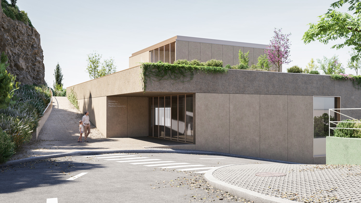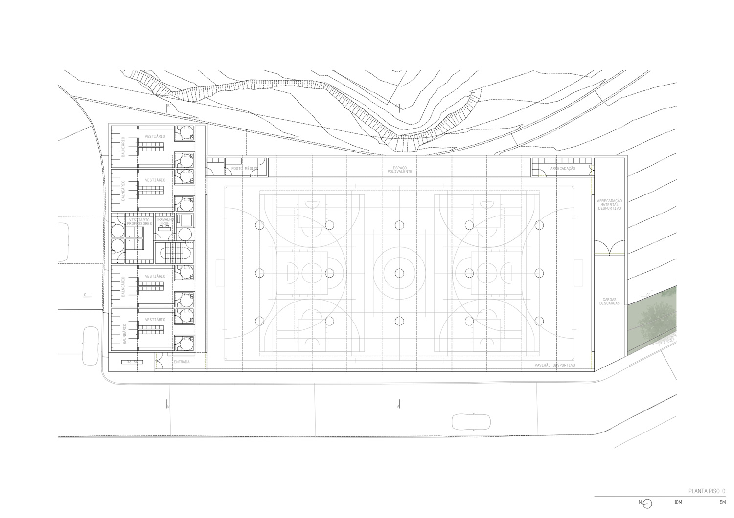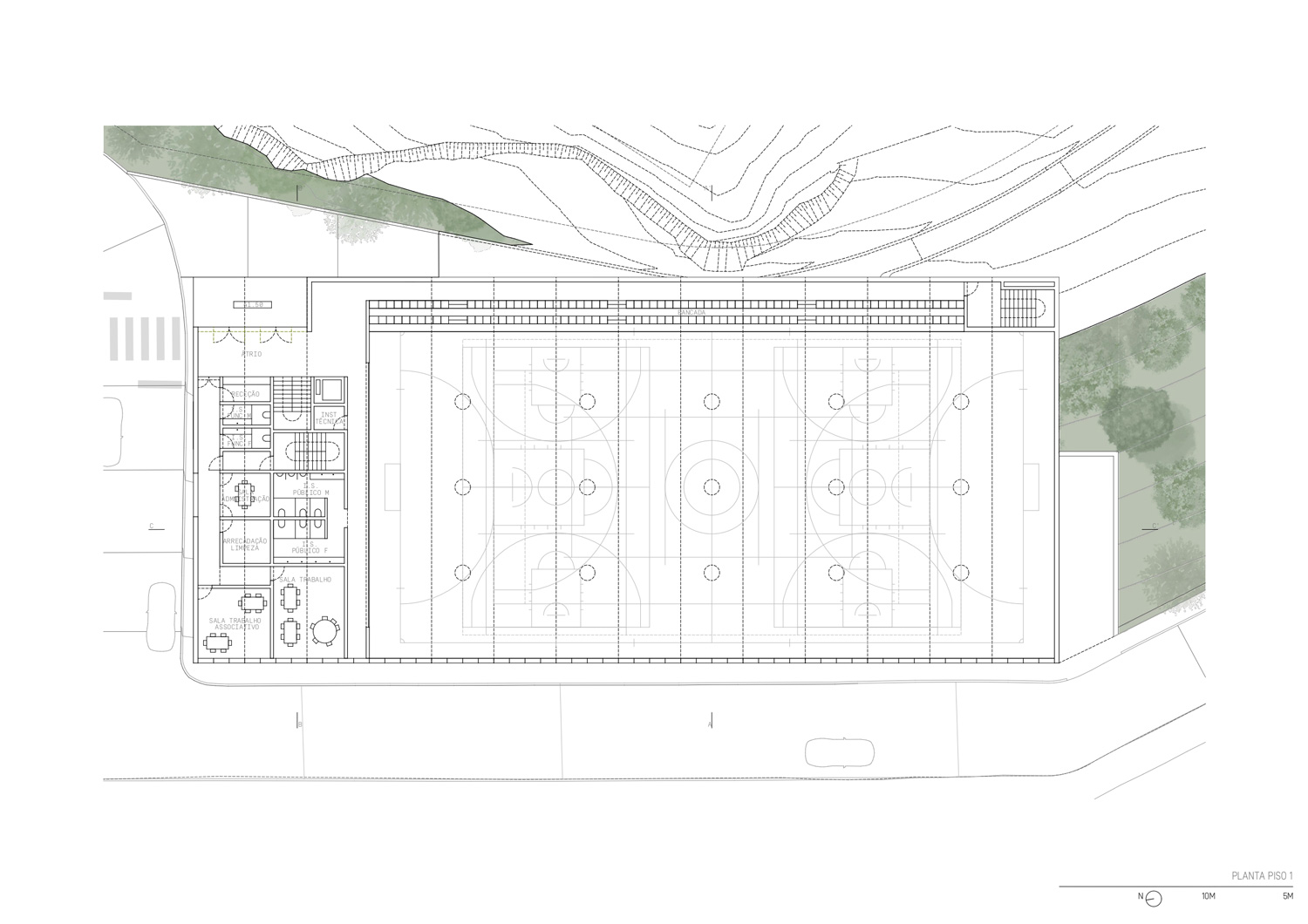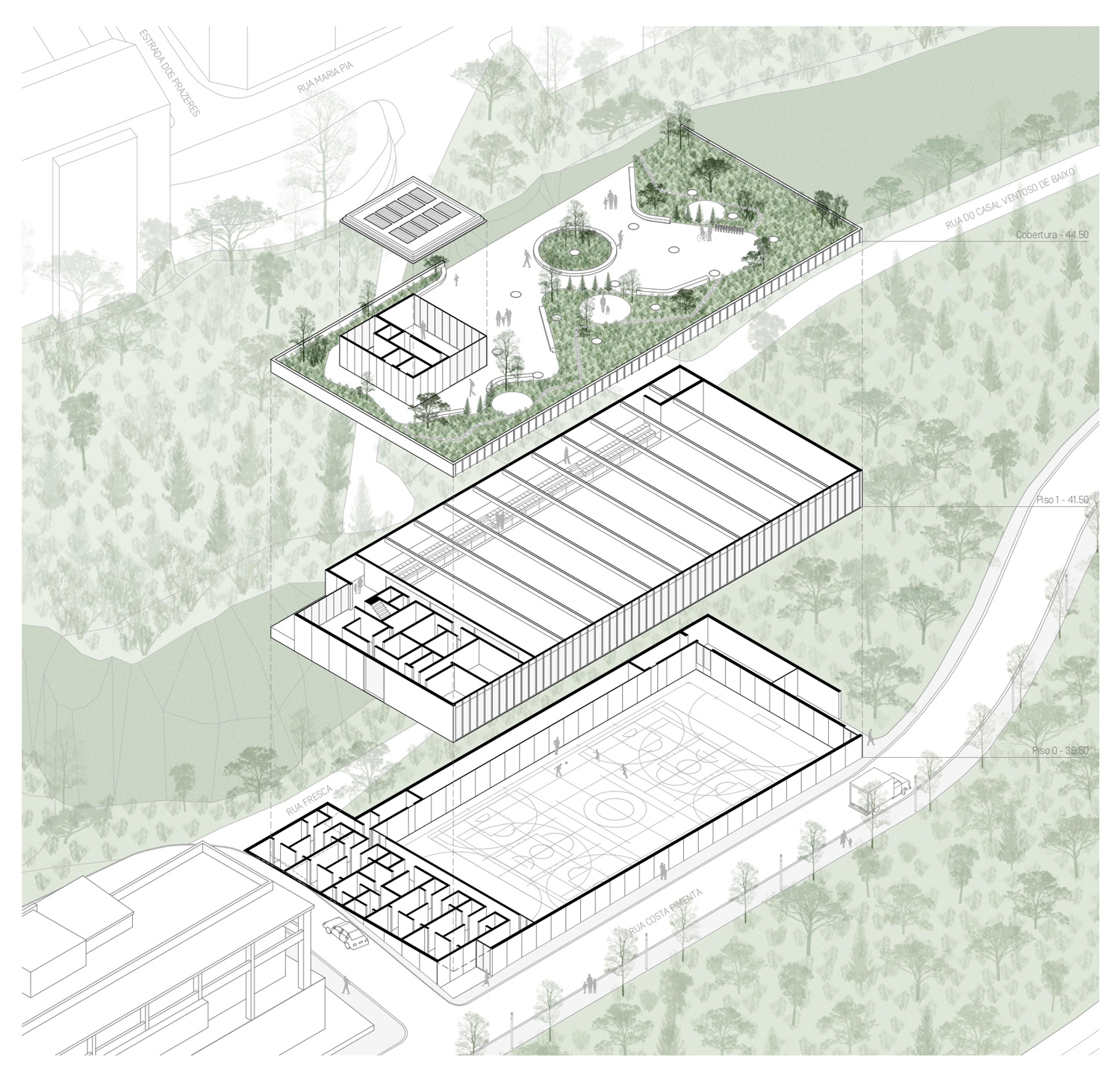 The project has the particularity of being conceived as a single building, with an orthogonal layout, in an absolutely natural location. In each of the limits resulting from the existing slope, the proposal tends to create a unitary strategy and image in the complex in order to contribute to an idea of integration with the cliff in an urban park that is truly experienced by its users. Having said that, the urban park space takes on greater importance, as it is the area responsible for connecting the upper part of Campo de Ourique to the new facility. It is therefore a community space, but also one of permeability and respite in the neighborhood and the city. In terms of location, the new building occupies a privileged position in the total intervention area, allowing it to be used as an extension of the connecting spaces that already exist in this area, namely Rua Fresca. On the other hand, the building benefits from its proximity to the Social Center, contributing to a unique joint synergy, creating a common space for both urban complexes, promoting a relationship between the consolidated neighborhood and the building to be proposed. The existing trees are to be removed to make way for the new building, which in turn will allow new trees and other species to be planted.