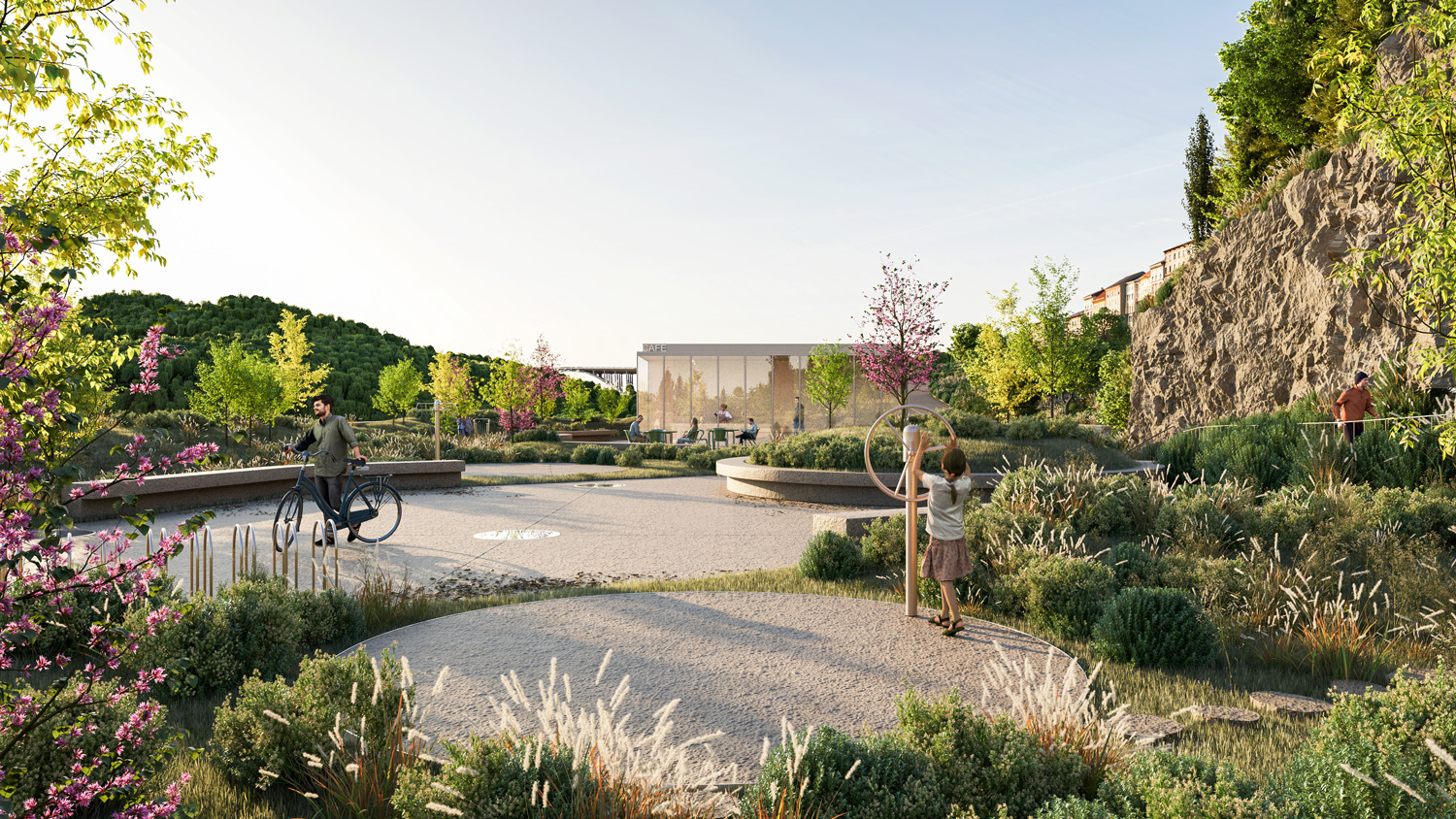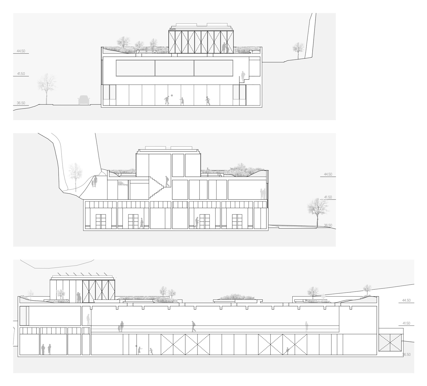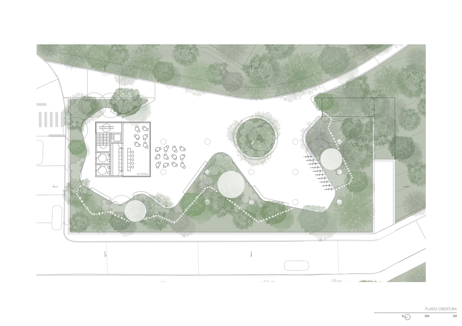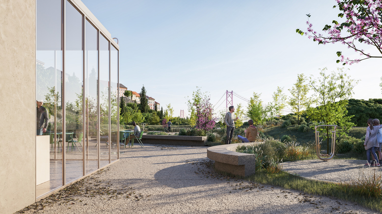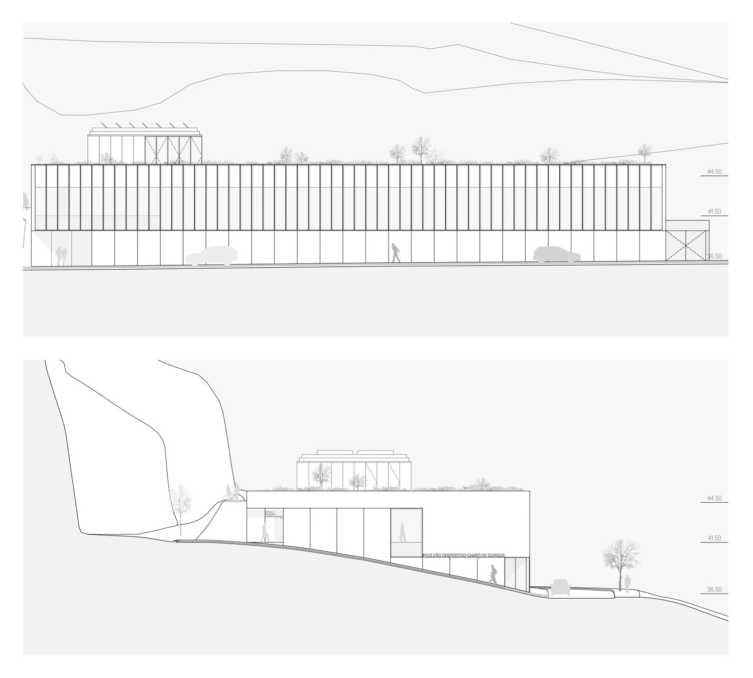 The project has the particularity of being conceived as a single building, with an orthogonal layout, in an absolutely natural location. In each of the limits resulting from the existing slope, the proposal tends to create a unitary strategy and image in the complex in order to contribute to an idea of integration with the cliff in an urban park that is truly experienced by its users. Having said that, the urban park space takes on greater importance, as it is the area responsible for connecting the upper part of Campo de Ourique to the new facility. It is therefore a community space, but also one of permeability and respite in the neighborhood and the city. In terms of location, the new building occupies a privileged position in the total intervention area, allowing it to be used as an extension of the connecting spaces that already exist in this area, namely Rua Fresca. On the other hand, the building benefits from its proximity to the Social Center, contributing to a unique joint synergy, creating a common space for both urban complexes, promoting a relationship between the consolidated neighborhood and the building to be proposed. The existing trees are to be removed to make way for the new building, which in turn will allow new trees and other species to be planted.