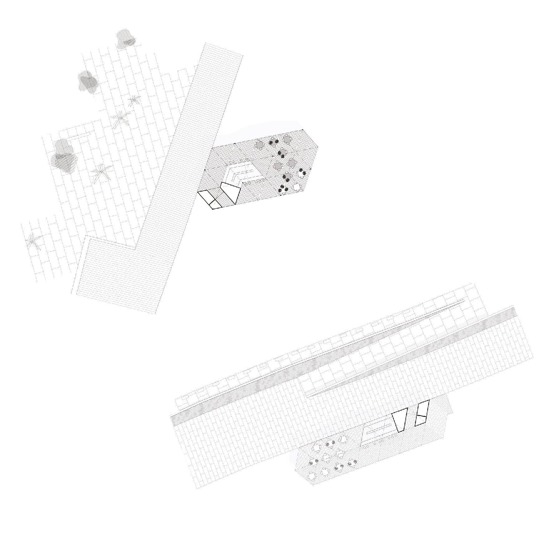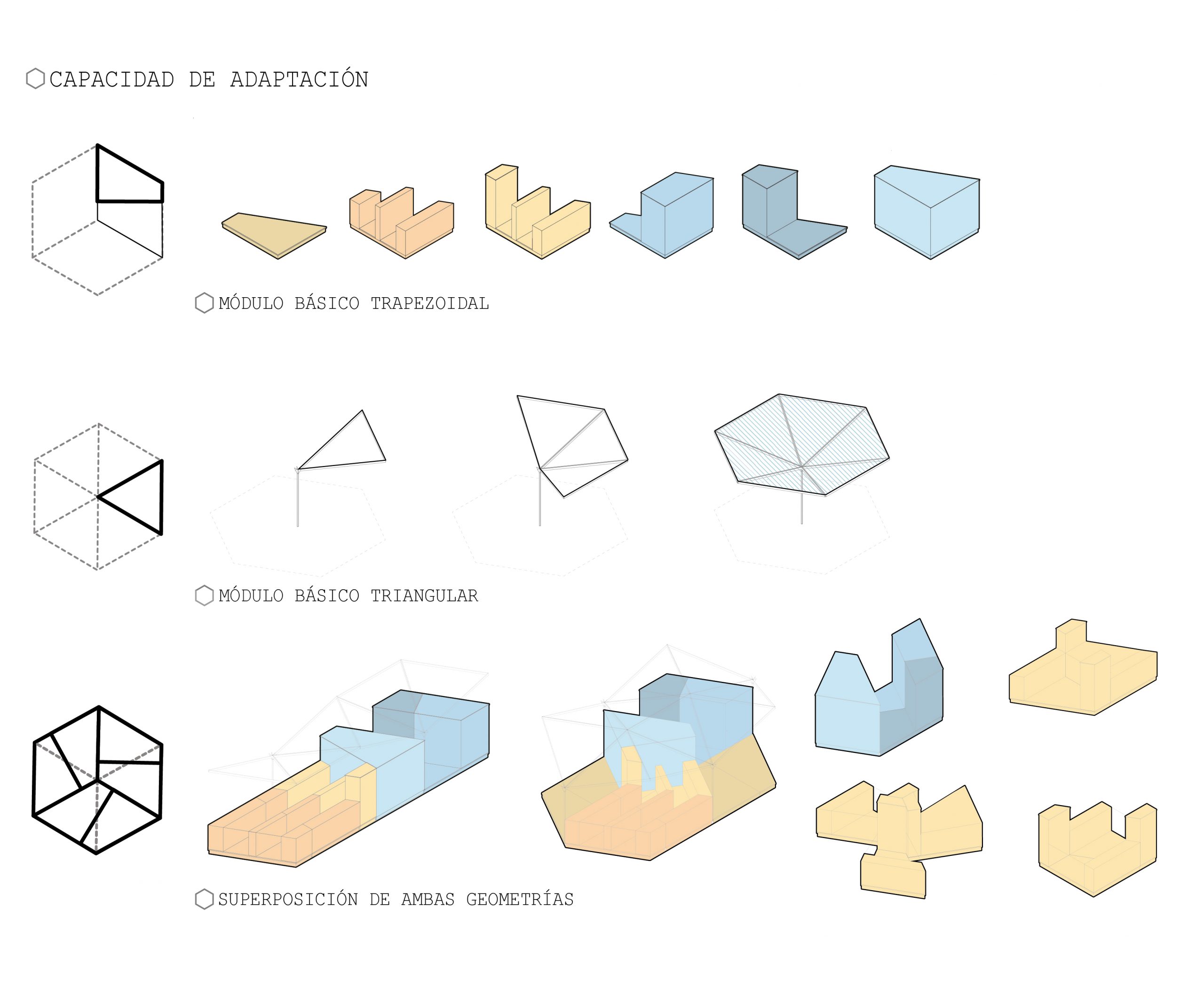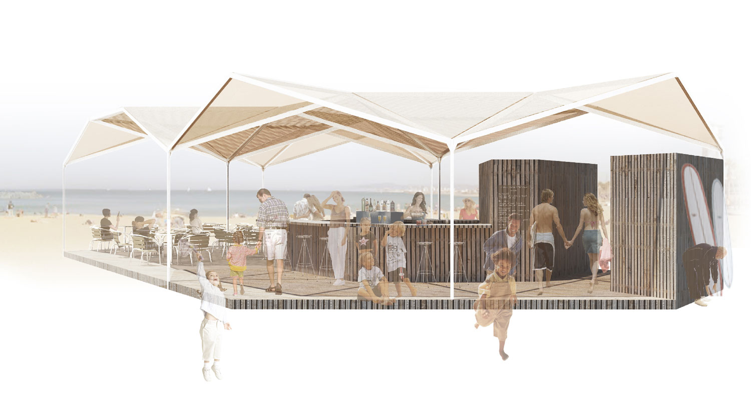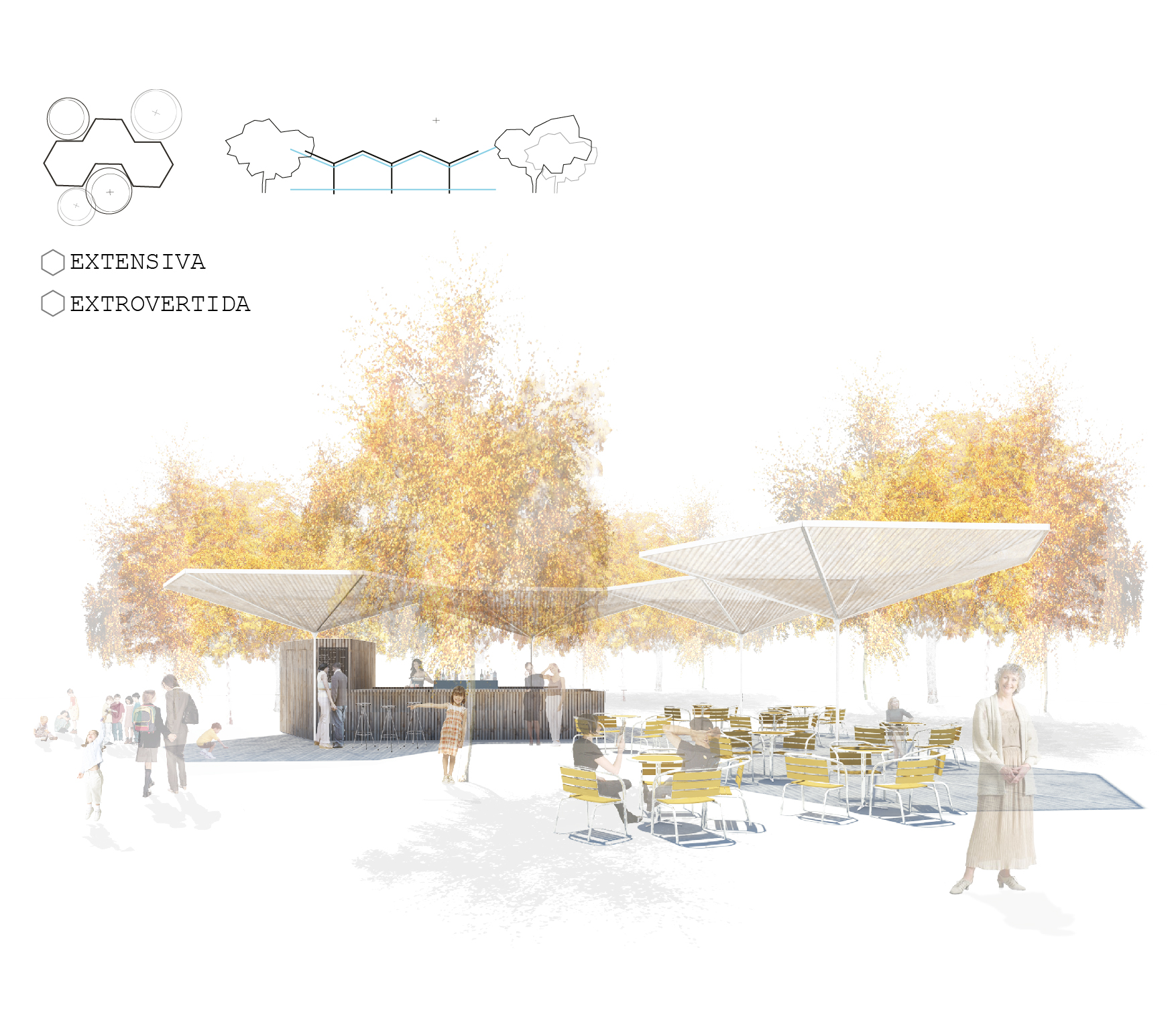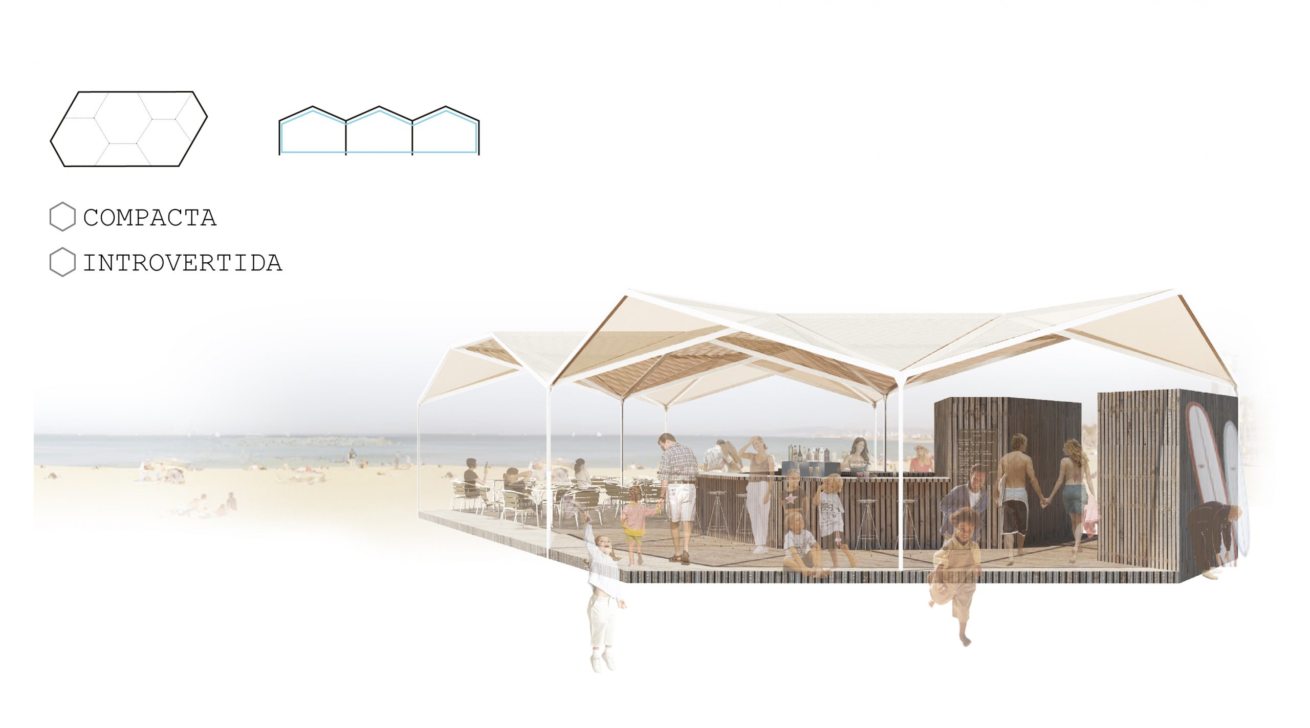Regarding placing a towel and an umbrella or profiting from the shadow casted by a tree as the minimum strategies to occupy a natural area such as a beach or park, our proposal reduces to this basic idea of only providing a floor and a roof. Doing this we avoid interrupting the horizon line and enhance the relationship with the site. At the same time our stall is no longer understood as a defined object as its limits fade. Thanks to a modulated system based on the hexagon this floor and roof are able to grow independently and adapt to the emplacement. Organic shapes can occur when adapting to natural features in a park where the perimeter of the roof is blended into the line drawn by the tree crowns, while more compact shapes respond to specific needs in a beach where the roof perimeter encloses the space acting like umbrellas. Compared to the present Barcelona stall, the system reduces the amount of transported empty space, and is able to provide the same storage volume and useful area with less material, so it is more efficient. Considering this and the fact that solar panels are implemented on the roof we meet the sustainability goals fixed from a start.