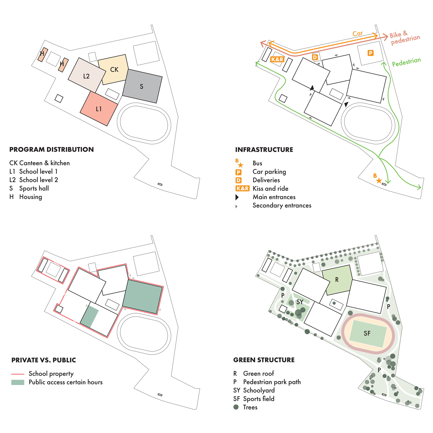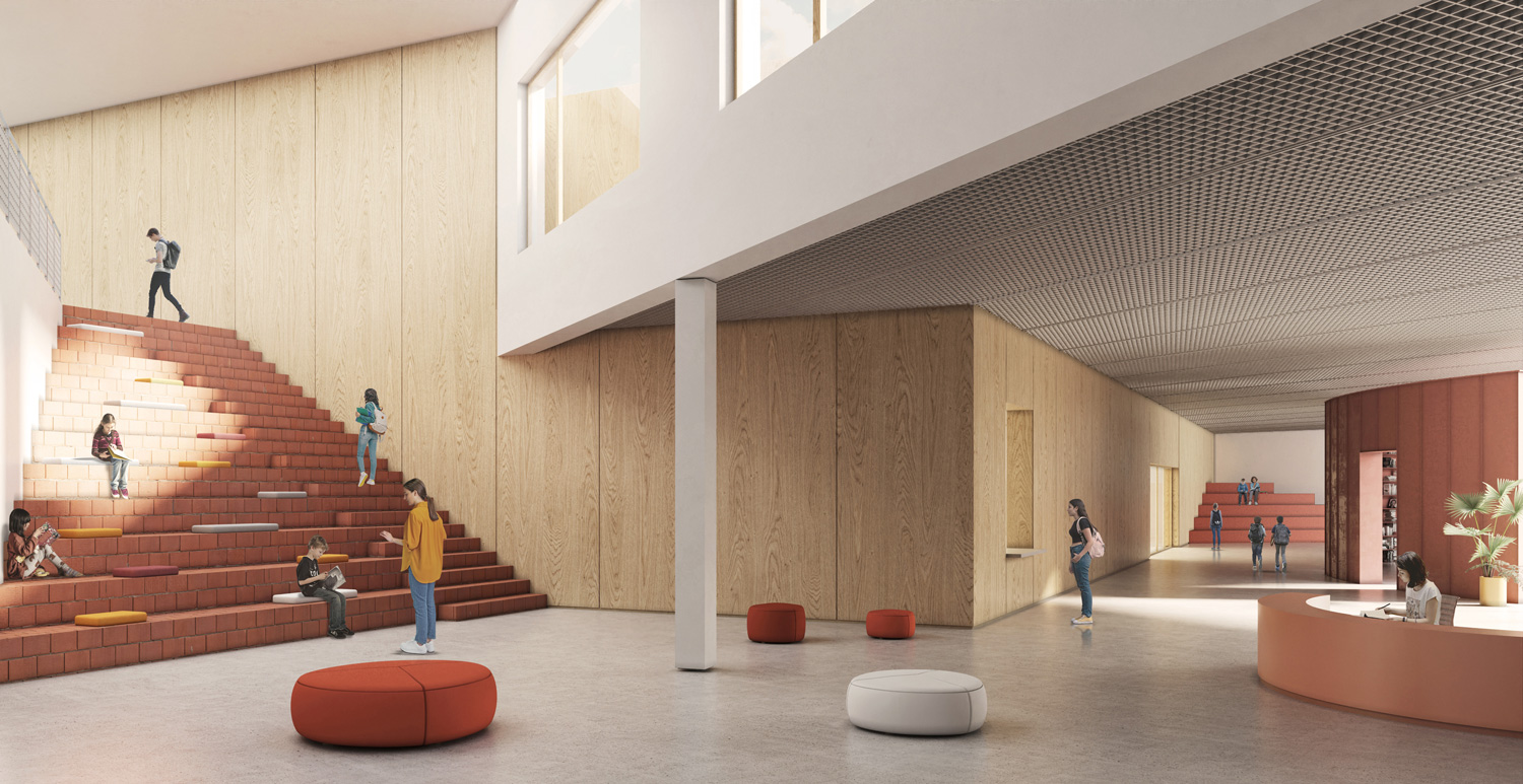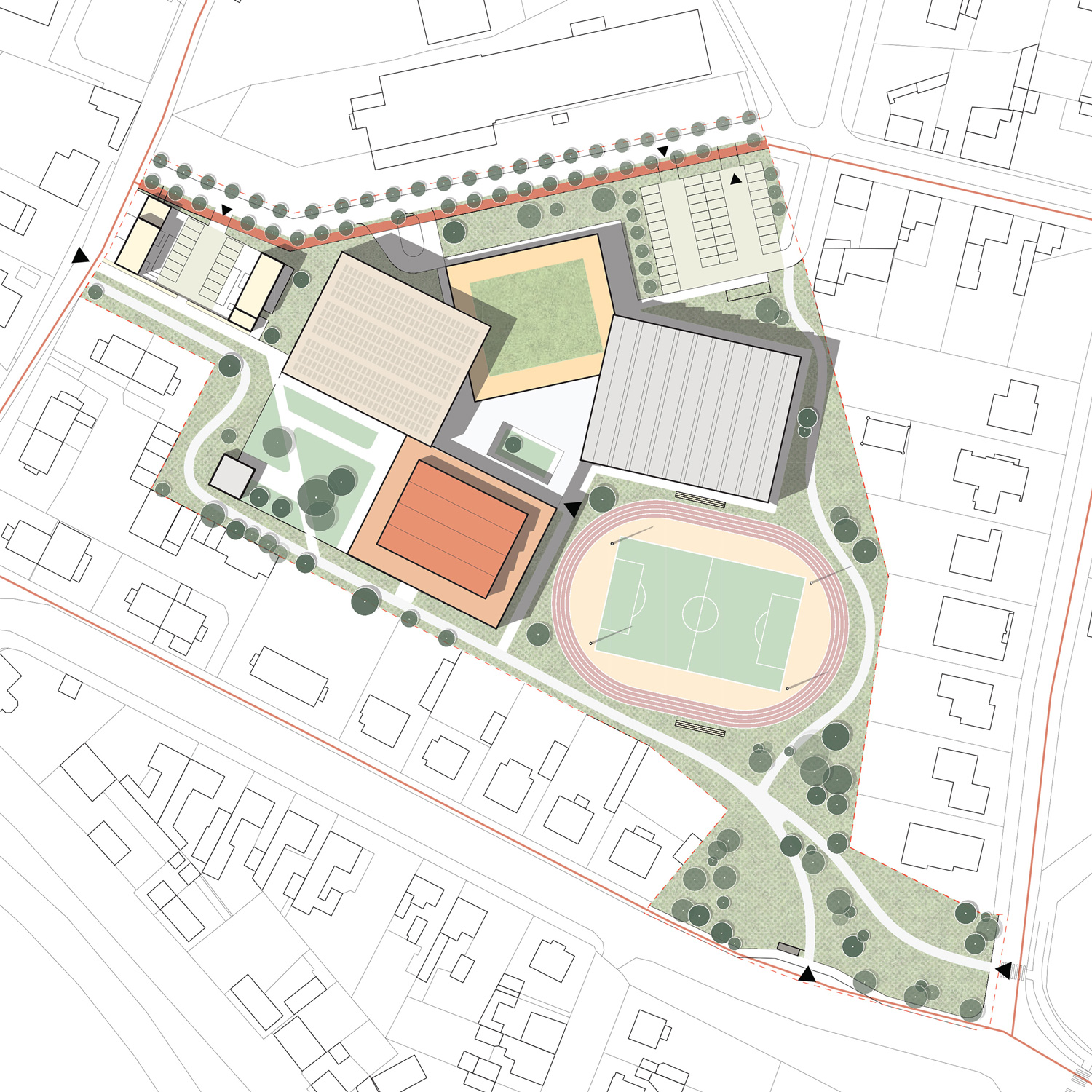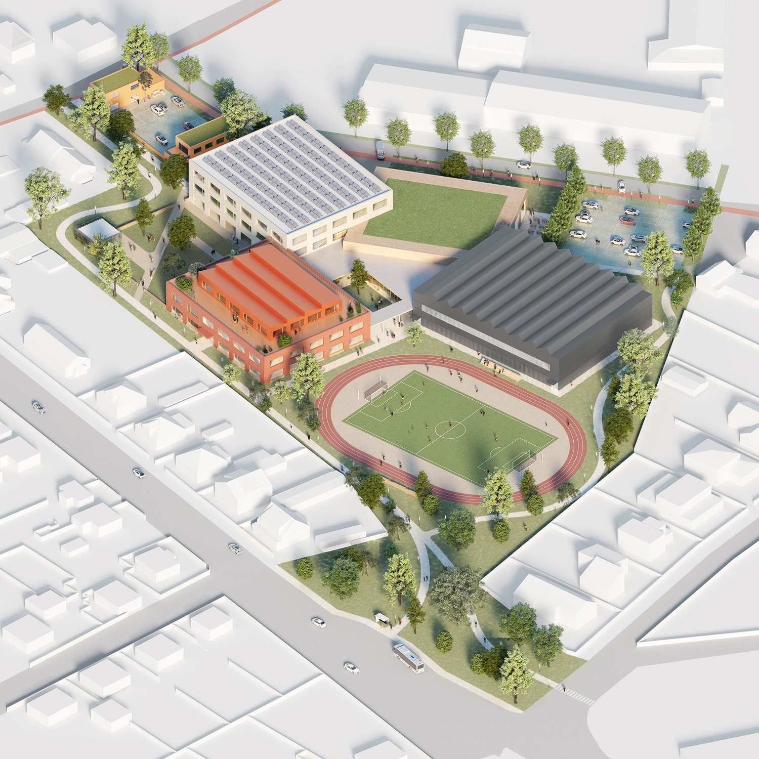 The design utilizes a flexible approach that can be adapted to future needs of the school and its students. A public park and paths run along the school campus, independently, with access overlapping after school hours. The new school building acts as an attractor for the entire town, a meeting point for all generations. The architectural design considers the new Starà Boleslav Primary School a community center, a place that will be alive independently from the school schedule. A place for education, sports, leisure, and culture – a place to gather.