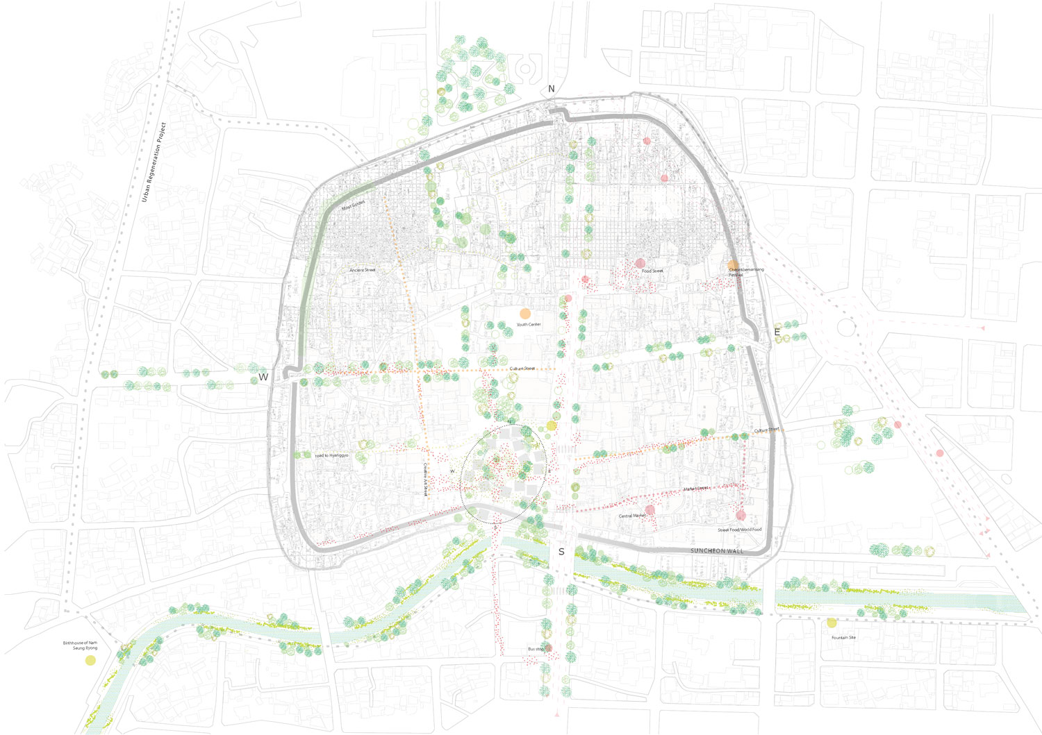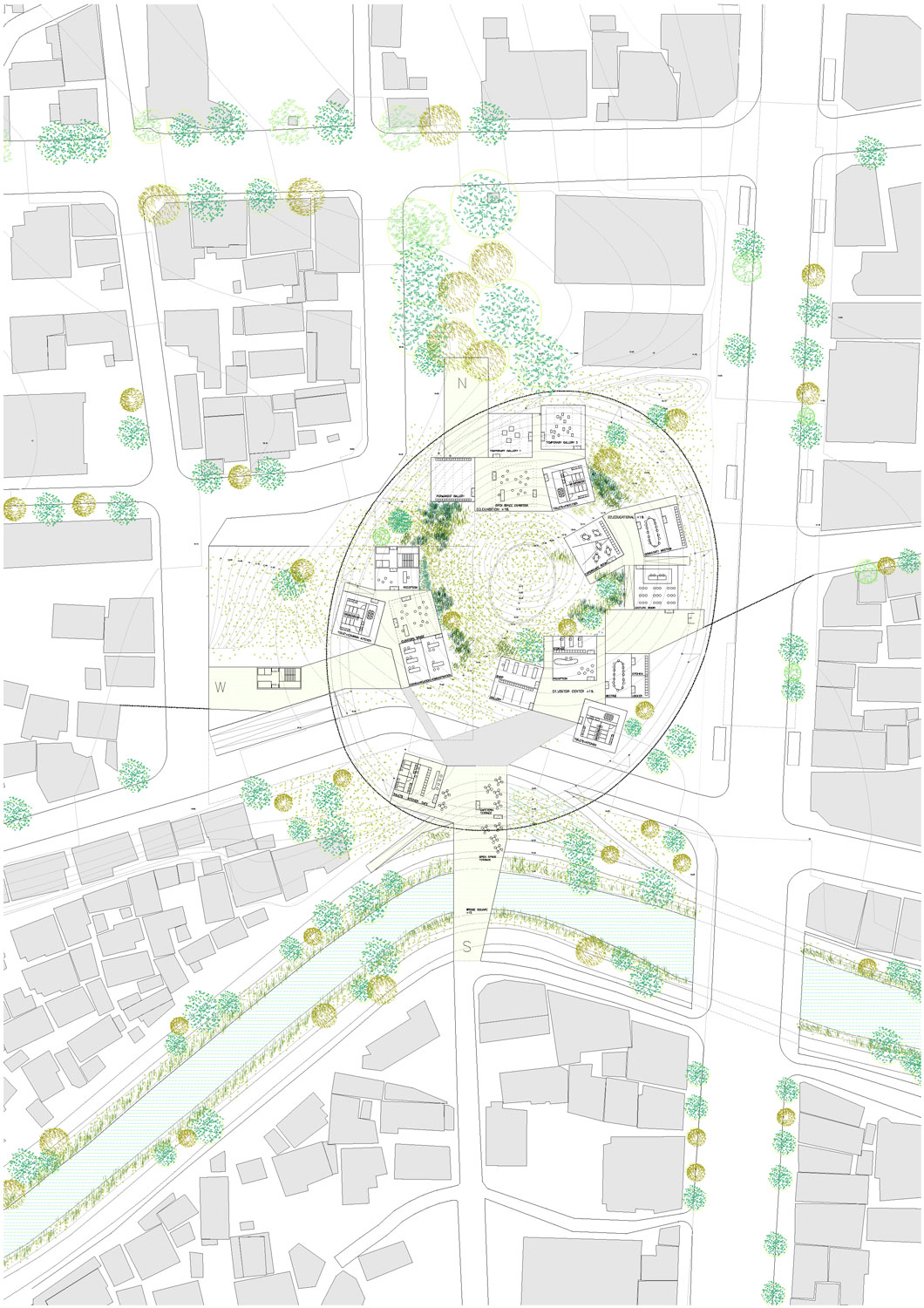 The Suncheon Art Platform is designed to seamlessly connect to the urban fabric. The proposal sets out to capture the city’s traditional building density by creating human scale interior and exterior urban spaces. The various volumes are positioned to create a central open space and smaller spaces around. The four gates, including the new gate of Yeonja-Ru are located in the four sides of the plot, related to the major streets. The Yeonja-Ru comes to be the south gate of the art complex and is associated with the other side of the river. The east gate comes as a continuation of the Fashion street and the market street. Keeping the existing urban paths that follow the external streets, the Suncheon Art Platform develops into a zone of continuous flows or as a confluence of flows, a meeting cluster. Our proposal focuses on the creation of a new topography in the heart of the city of Suncheon. A bowl is built in order to collect the rain water recovering a sustainable environmental system for the area. The topography leads the visitor through a softly transition from the exterior, through the inner world till the top of the hill connecting him with the nature.