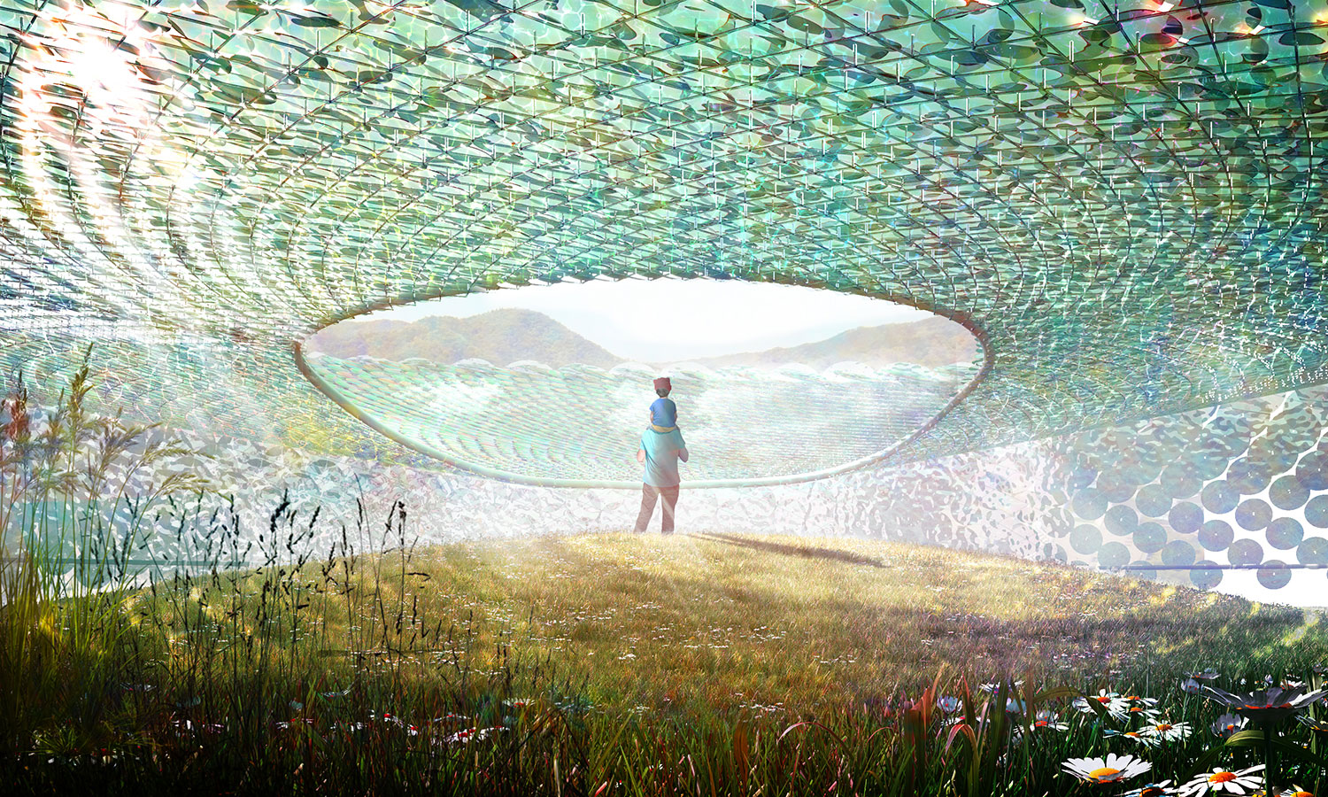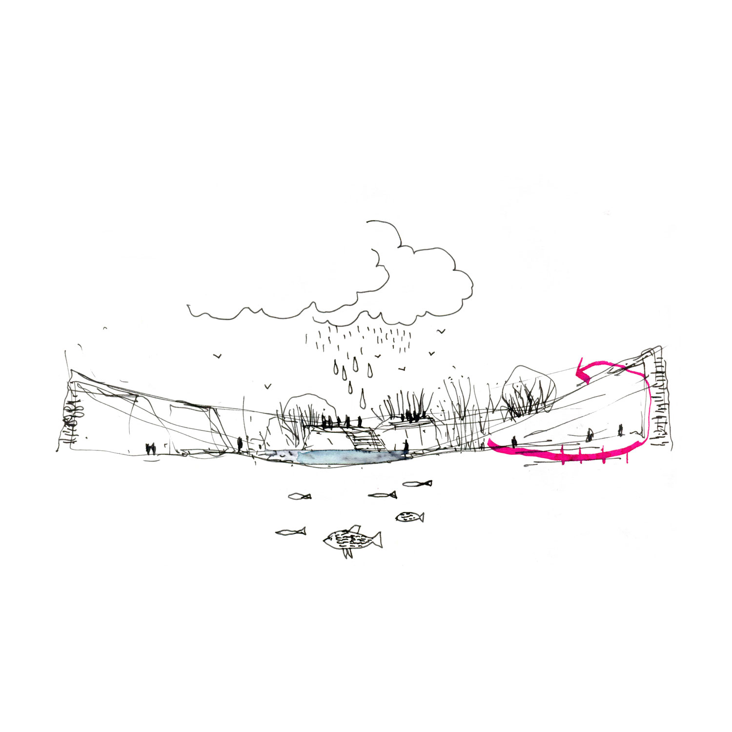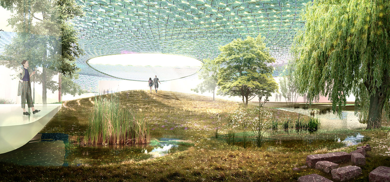 The vegetation is designed using traditional species of Korea, in order to highlight the passage of time, the transformation through the seasons – presence and absence of water, as well as to alert all the senses. Our proposal intends to reveal the beauty of nature that encloses the site and eliminate the views to the city. Wandering underneath this membrane, flooded with reflections, the gaze focuses on the brightest hill spot in the middle. Approaching it, following the topography, the light is getting more and more intense, where in the end, reaching the top of the hill the entire surrounding nature is revealed. This is achieved by controlling the height of the structure in every side, in a way that hides the city and provides a view only to the mountains.
