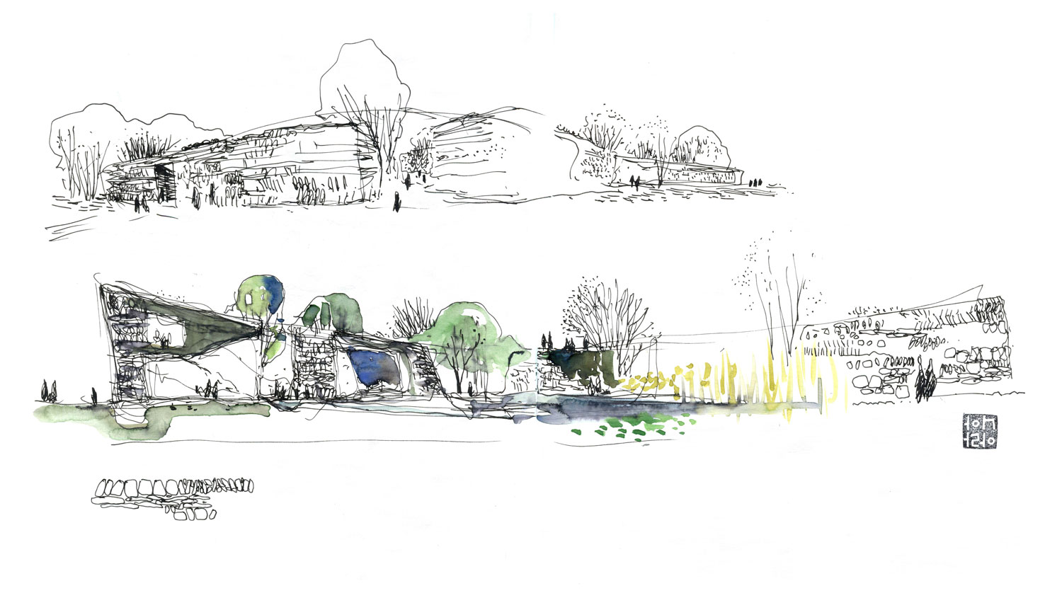 We use the soil removed from the site for molding the slopes in the boundaries, in order to protect from the undesired urban landscape and reinforce the visitors’ flow to the heart. Our site is located in an area rich in archaeological background and this is the reason why we aim to create a space which will be anytime transformed to welcome any archaeological excavation. The project will develop itself along time, being flexible and adaptable to future changes. Having into account the presence of an archaeology subterranean layer, the way that constructions rest on the earth is minimum and subtle (campsite). An Open Museum is proposed in the location of the wall trails parallel to the road crossing our site. The Wall Museum can be visible from the slope over the parking place. The traditional nature of the proposal derives from the variety of sensations that the place activates. The origin of this aspect comes from the traditional Korean gardens and the strong relation between nature and human. The evolving skin sieves the light creating an inner world of sensations, while the outside surface offers reflection effects of the natural environment. The roof also protects from the solar radiation.