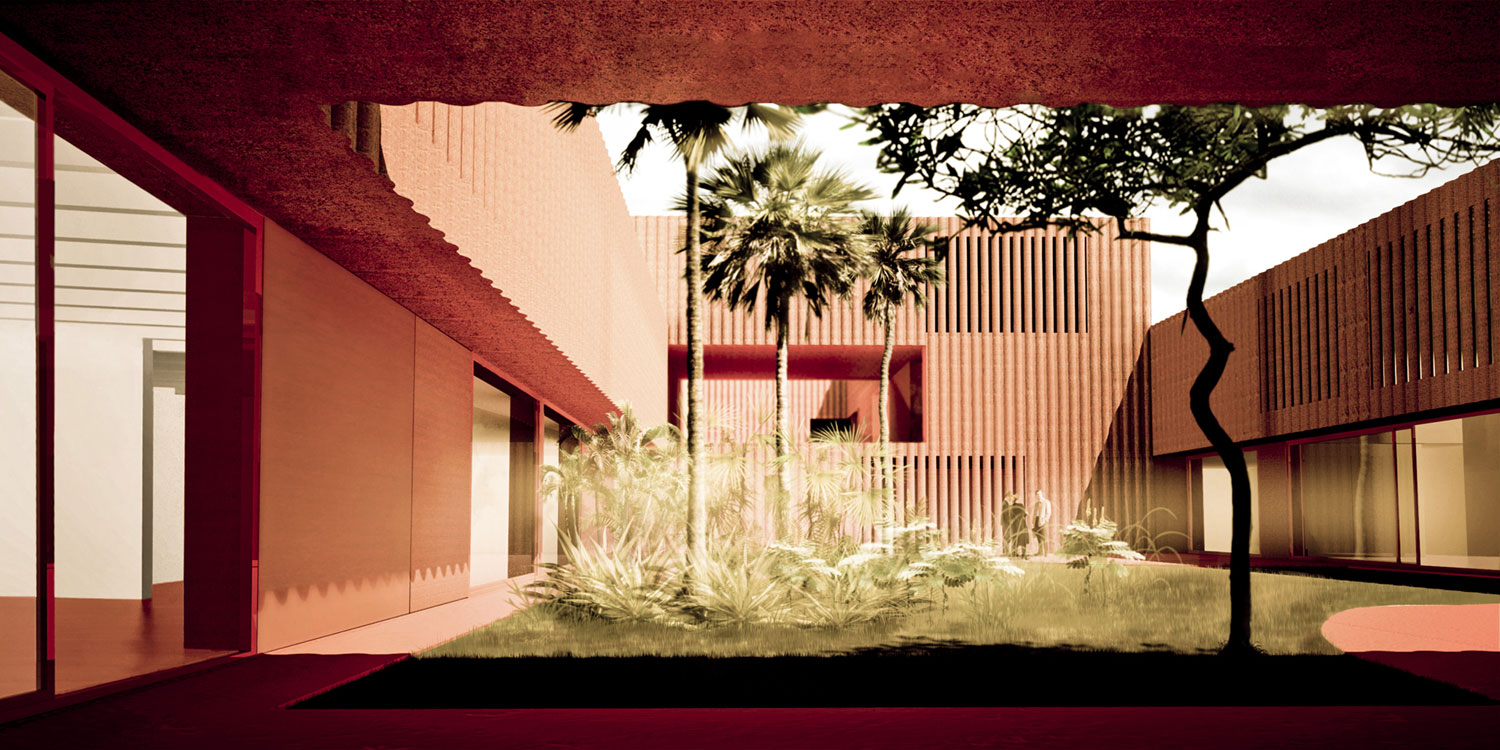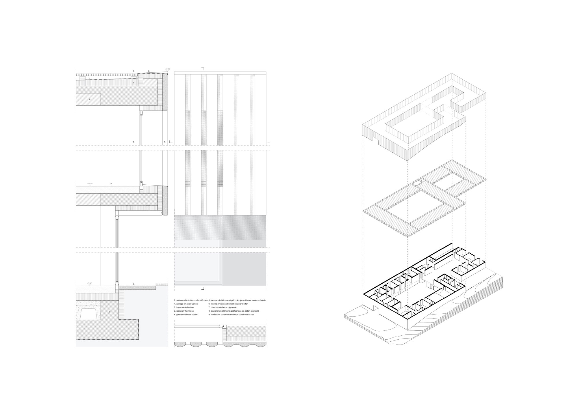 Unlike the traditional type of the enclosed villa, the new Swiss Embassy takes part of the urban district of Yaounde Bastos as a compact and introverted building. The volume extends at the entire lot and by being empty inside offers two hidden spaces, offering the architectural control of the controlled access and security. The representation of the values of the country is delegated to the robust construction and the simplicity of the image of the building. Long continuous walls, designed to be read as vertical shadows define the space of the embassy. Viridarium and impluvium: as the noble Roman dwelling type, the spaces are organized around two interior patios with different proportions and different characters. The first space has a public character, to which overlook the accessible spaces and waiting areas. It leads to the spaces of representation of the ambassador’s residence. The second is a larger space, bright and with a wonderful garden. This patio is a more private and appears as a natural extension of the space of representation that extends along the body in parallel to the street. The concrete facade by the prefabricated modules, as well as the cast of the interior and exterior floors is made of laterite aggregates. The frames and all the works of smith are made of Corten steel.
