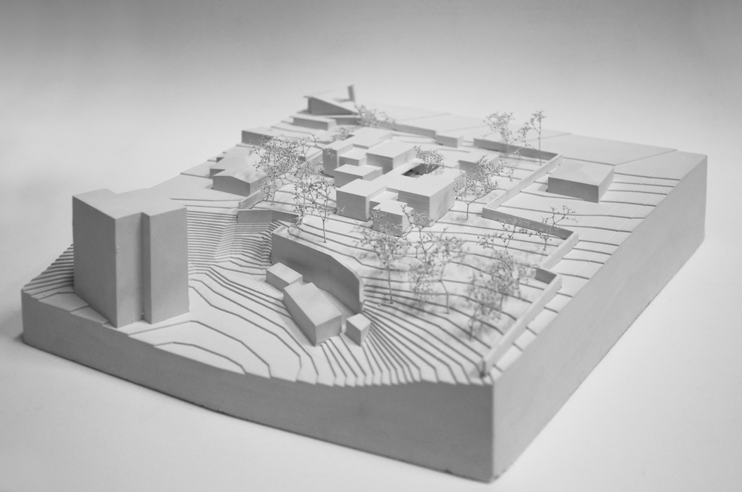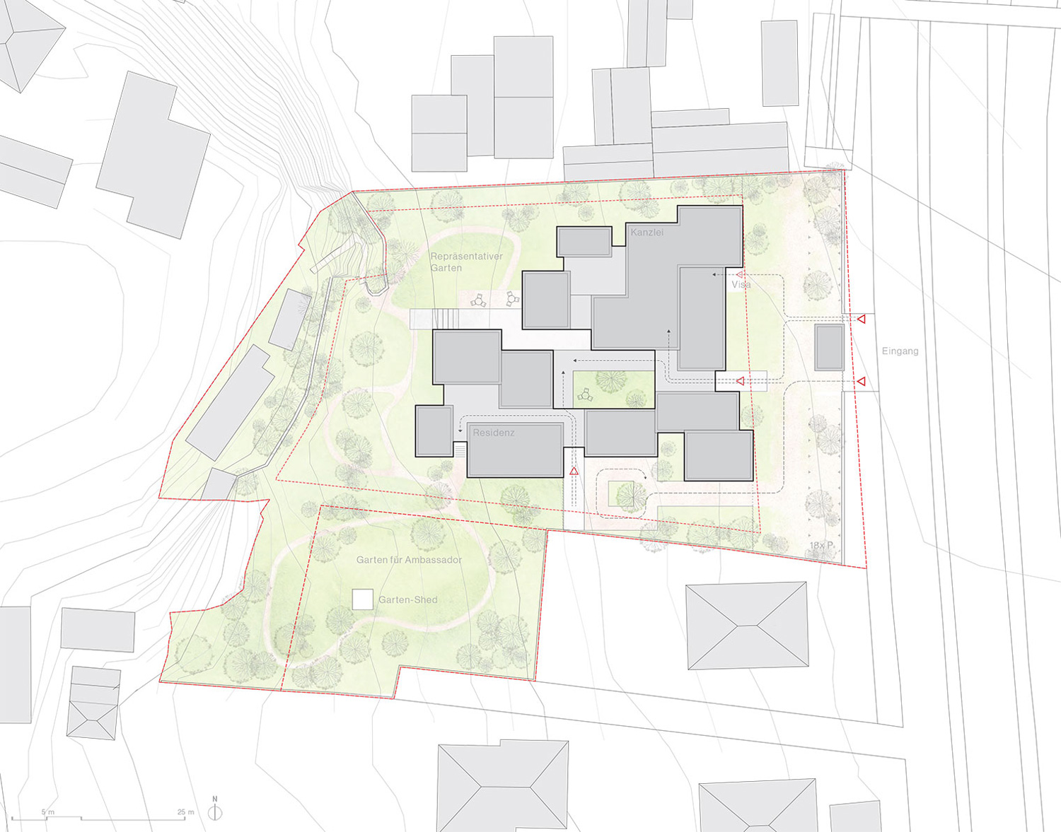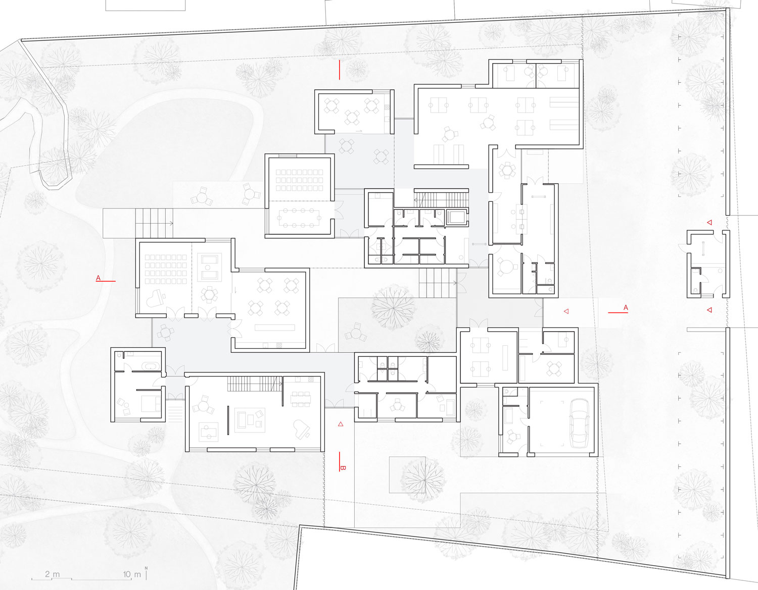 The cluster of houses forms two main communication axes, intersecting the atrium, the heart of the house. The spaces between the houses create informal centers of each part of the complex, places for meetings and also rest. The small scale of masses inconspicuously enters its surroundings and responds to the declining terrain. It purposefully does not act and look as an important institution, but gradually reveals visitors its parts as they walk through to the garden. The embassy building is strictly structured according to the spatial program, each part of it has its own entrance, character and is oriented to another part of the complex.