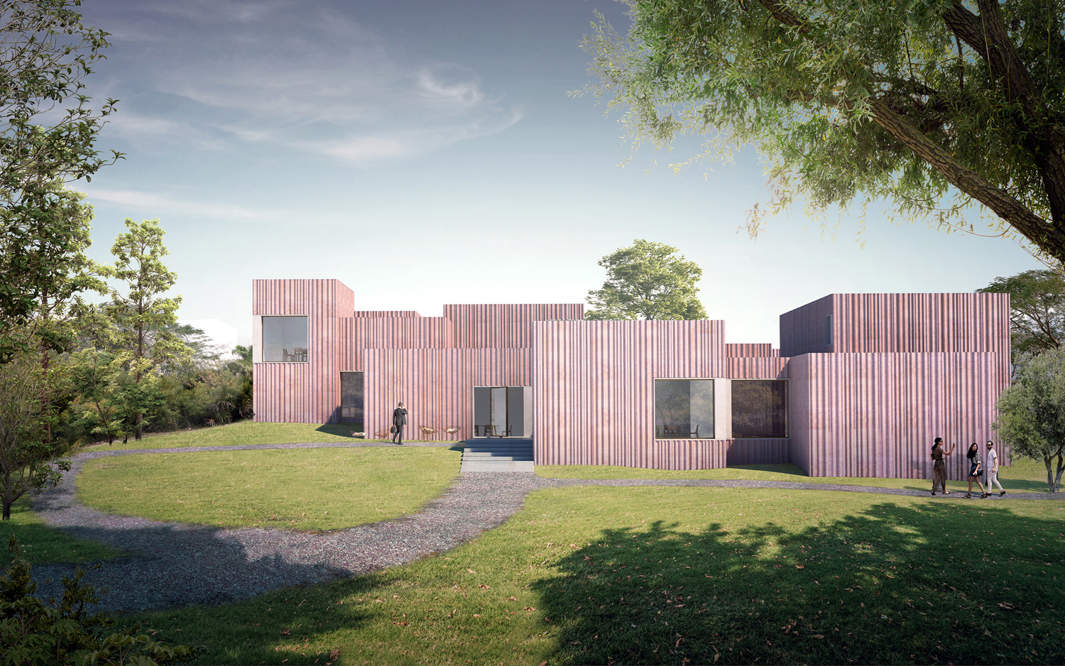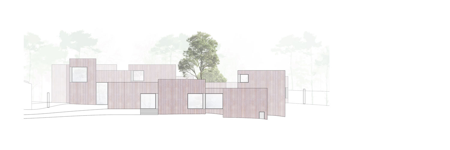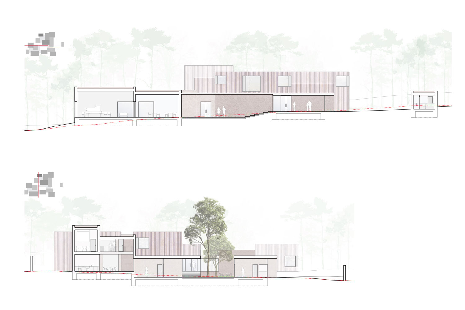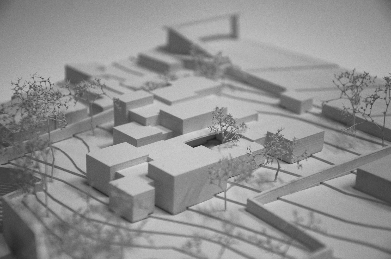 The cluster of houses forms two main communication axes, intersecting the atrium, the heart of the house. The spaces between the houses create informal centers of each part of the complex, places for meetings and also rest. The small scale of masses inconspicuously enters its surroundings and responds to the declining terrain. It purposefully does not act and look as an important institution, but gradually reveals visitors its parts as they walk through to the garden. The embassy building is strictly structured according to the spatial program, each part of it has its own entrance, character and is oriented to another part of the complex.
