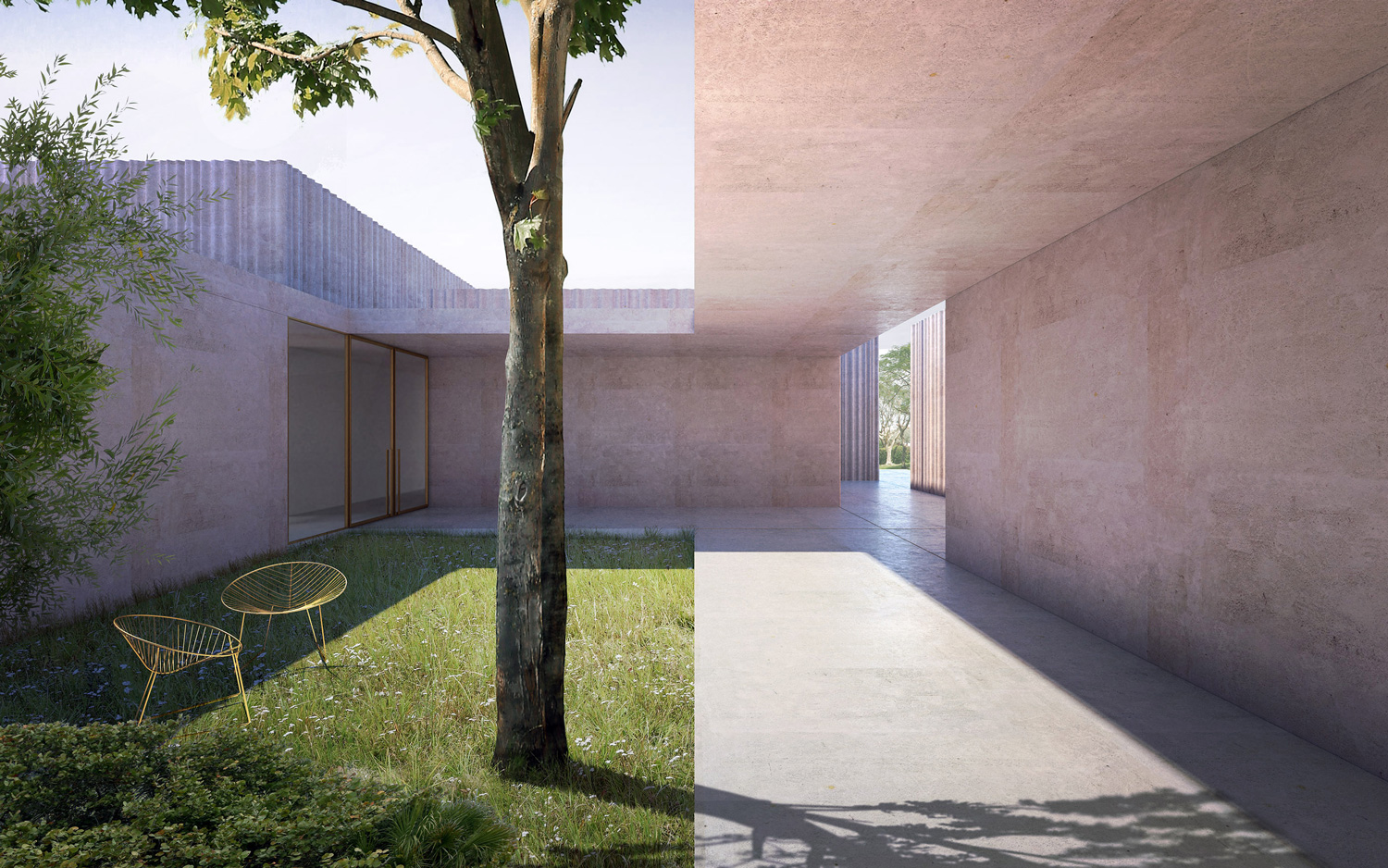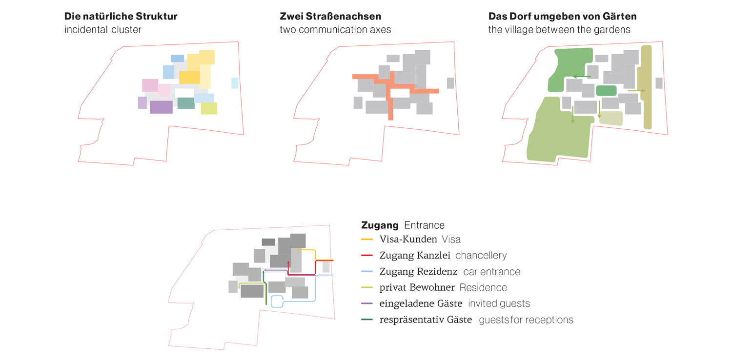 The incidental cluster of residential and outbuildings creates public streets, squares and yards in between. The place of returns, homeland. The symbols of security, intimacy and familiar places are synonymous with the requirements of the embassy.