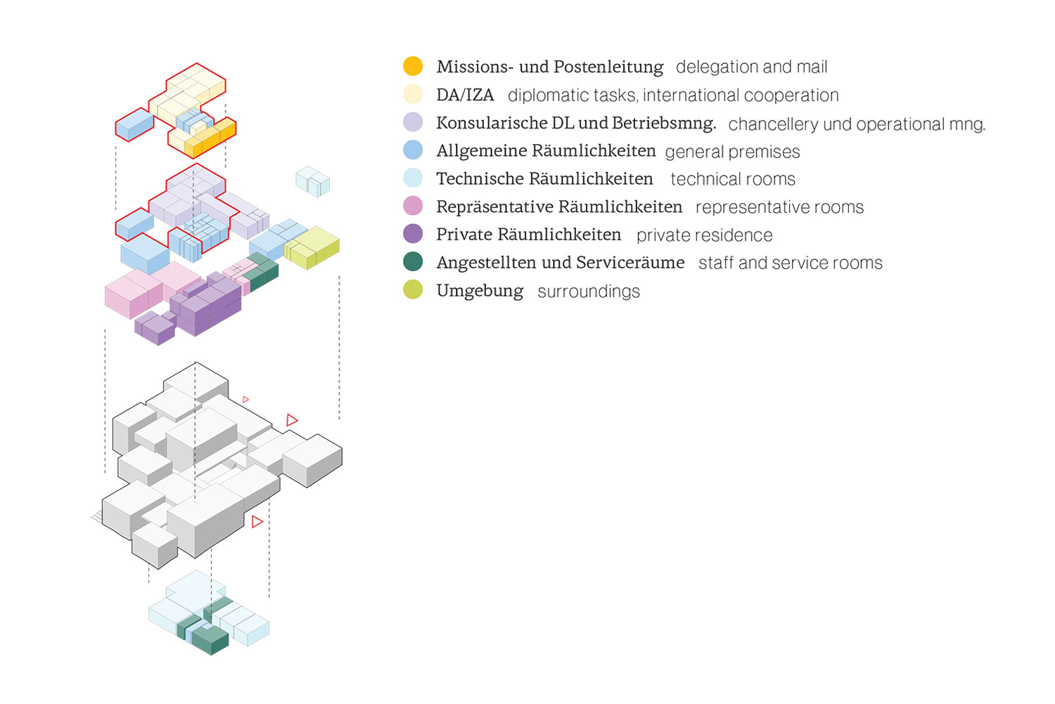 Die Ballung der Häuser formiert zwei Straßenachsen, wo in der Mitte das Atrium steht. Das Herz des Gebäudes. Die Häuser der Botschaft bilden die natürlichen Zentren für Meetings, Treffen und Entspannung. Nur ein Paar Gebäuden mischen mit der Umwelt ein und reagieren auf die sinkende Landschaft. Diese Botschaft sieht nicht als die prunkvolle Institution auf dem ersten Blick aus, sondern sie zeigt dem man seine Zaubersprüche nicht früher als er in dem Garten geht. Das Botschaftsgebäude ist streng nach dem räumlichen Programm strukturiert, jeder Teil hat seinen eigenen Eingang, Charakter und ist auf einen anderen Teil des Komplexes ausgerichtet.