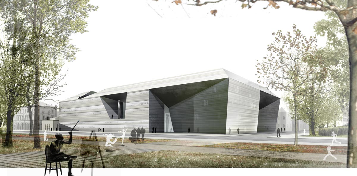 To integrate with the historical city block structure, the height of the cornice of the building is also used in the whole new building. The roof slope toward the river is lowered to syntonize with the existing neighbour buildings.The pedestrian access to the library – museum complex is planed from all directions. With allowing direct access from all surrounding streets, the building is made strongly accessible and inviting.